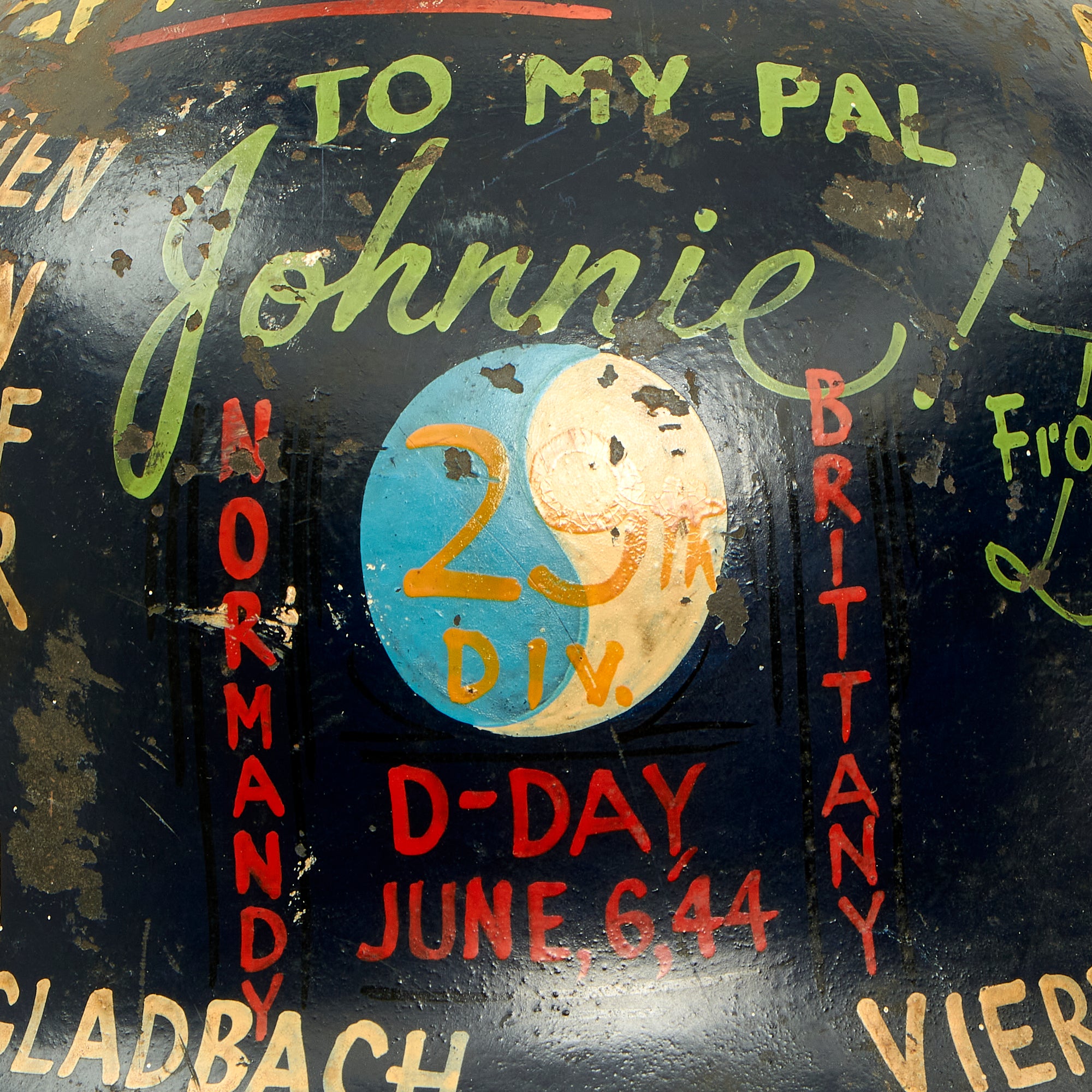 This lovely example took a German Luftwaffe M40 "Single Decal" helmet, and completely overpainted the exterior with Navy blue, while the interior was left the original smooth fliegerblau (flyer's blue" color. The "Eagle" part of the decal was not painted over, though the swas was removed, and another swas was painted on the left side. THere also looks to have been a white swas on a red field n the top of the helmet, but this either was removed or wore away, as the helmet looks to have seen wear since it was painted. The very front of the helmet has 29th DIV painted over the unit insignia, and this is surrounded by NORMANDY, BRITTANY, and D-DAY JUNE, 6, 44. Additionally there is a dedication above this: TO MY PAL Johnnie! From Dave. The rear skirt has the phrase 29 LET'S GO HOME! in blue paint.