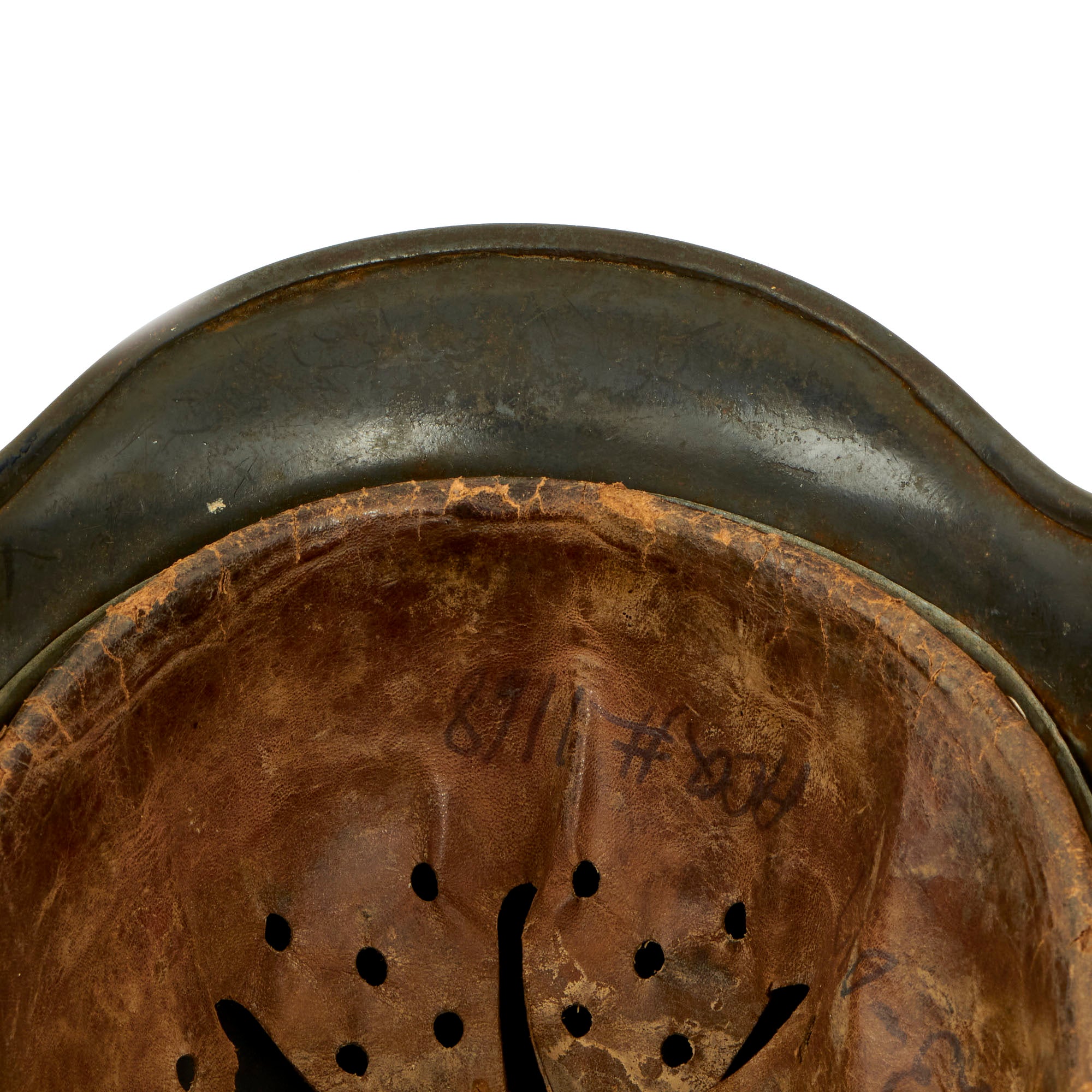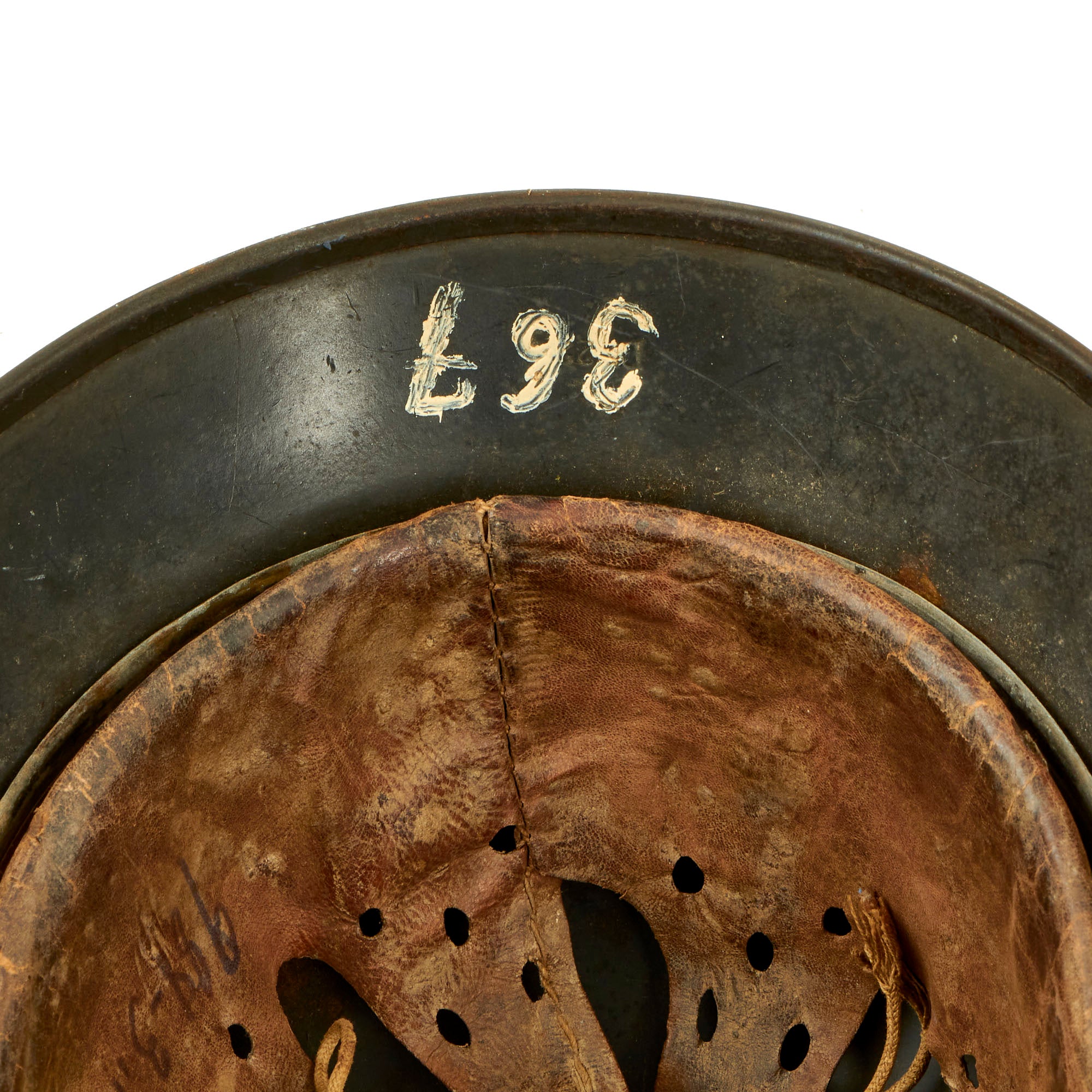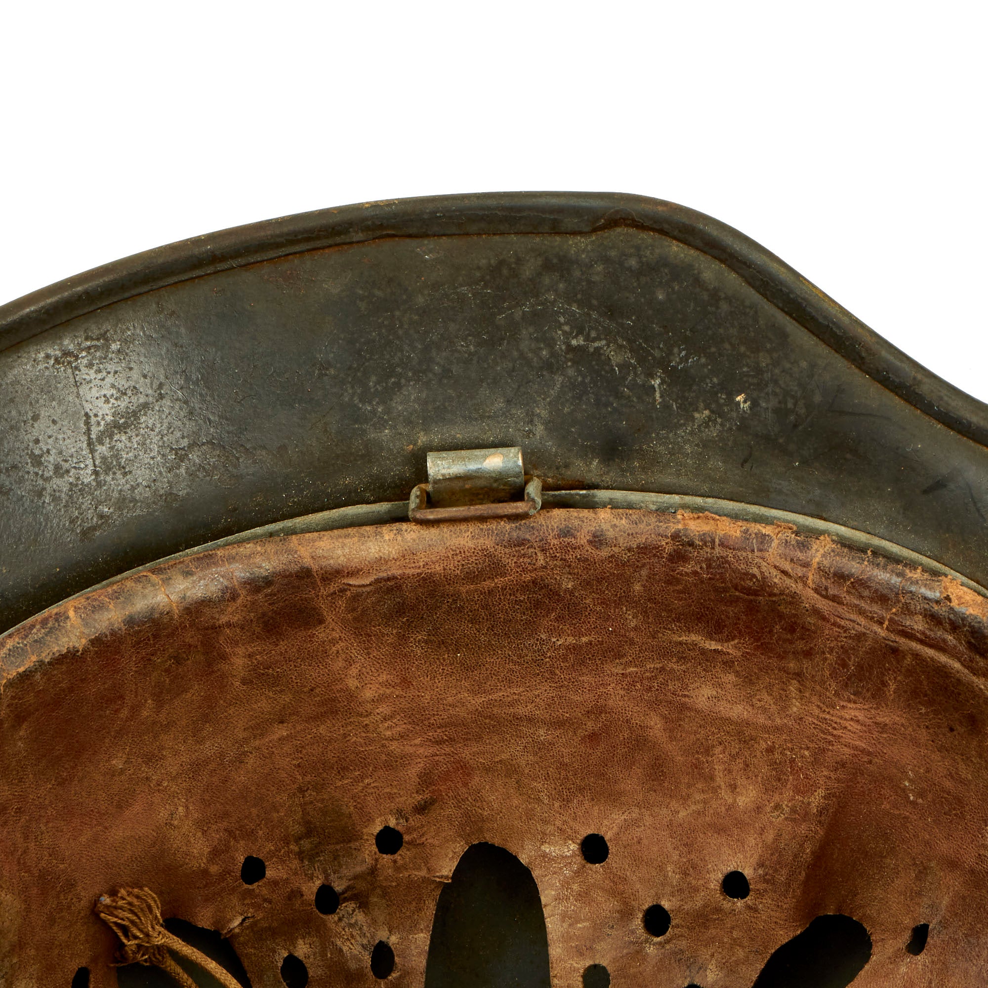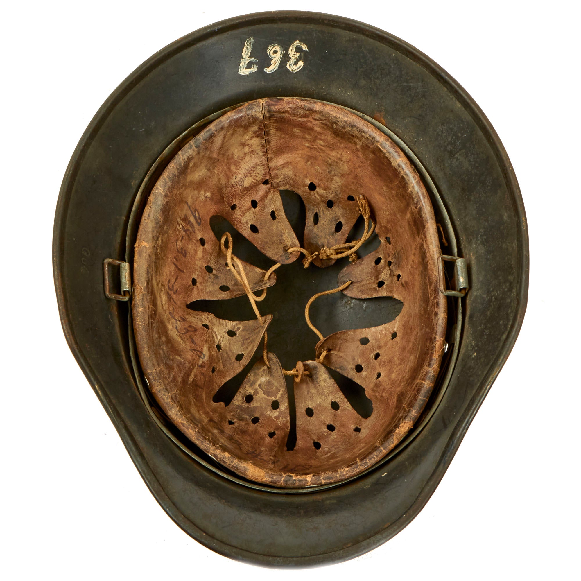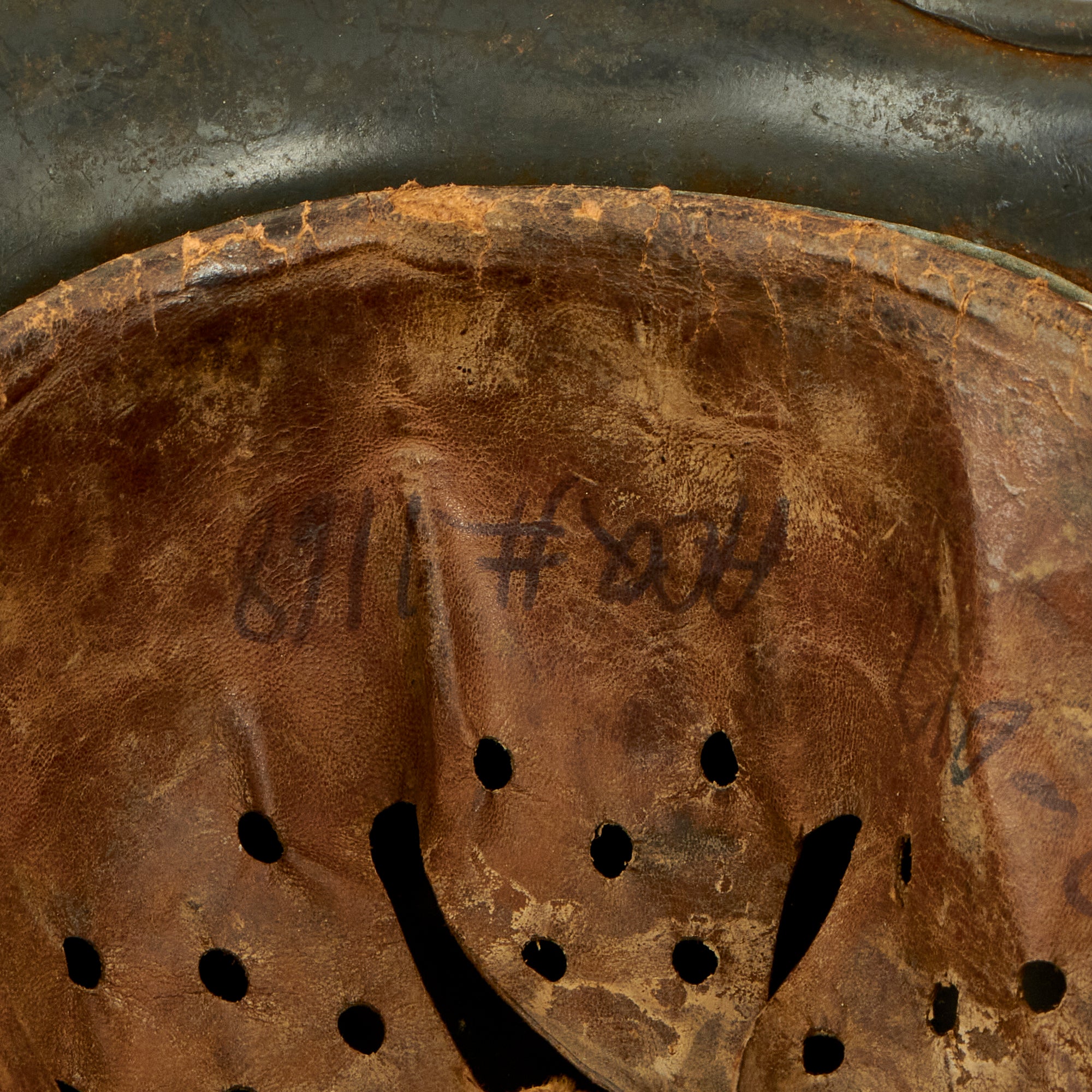 All three original liner retaining pins are intact and in good condition, with the navy blue paint well retained. There is even part of one of the locations on the top of one, which is still aligned correctly. The interior of the helmet still has its original leather liner with all 8 fingers intact as well as the top tie string. The leather has a lovely color and worn look, with the previously mentioned markings on the left side. The outer side of the galvanized steel liner band over the left ear is marked 64 n.A / 57, indicating that this is a size 56 liner for a size 64 shell. The right side displays the full manufacture information, as well as a date, though they are a bit faint: