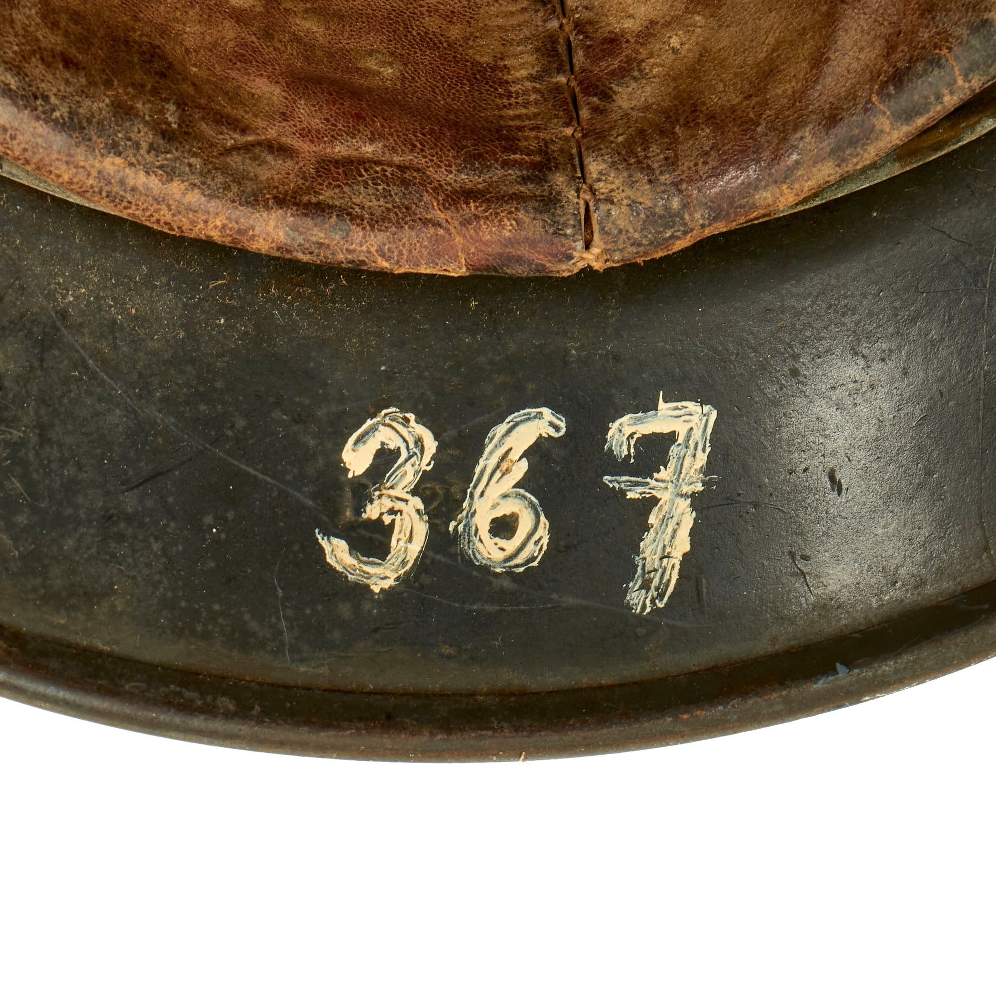 The rest of the helmet is covered in the various locations visited by the 29th ID, which include many locations in FRANCE, BELGIUM, HOLLAND, and GERMANY, as shown. The paint is well retained, though as mentioned previously there is wear through on the crown, so the helmet may have been worn by the veteran or another during parades and other events back in the united states. The helmet has a fantastic patina of age, and the paint is definitely WWII period. Additionally, the there is writing on the inside of the helmet on the leather liner, which reads 988 - 3.1 - 36 - 23 - 017 ACQ# 7168. We have not been able to decipher this at all, though it may be a unit number or maybe some type of asset tag from a collector. We do however find it very unlikely that any collector or museum would add a marking directly to the helmet liner itself like this.