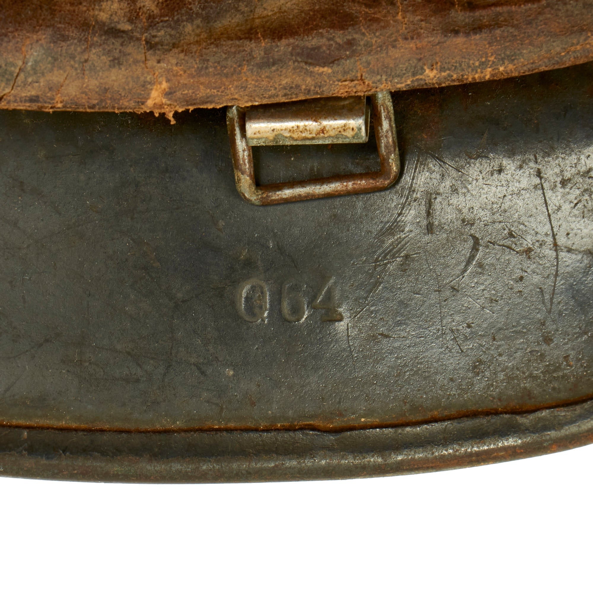 Aside from the decoration, this is definitely an original German WWII issued helmet, with all of the correct markings and components. The reverse, interior, neck guard apron is serial number stamped DN22 and the interior, left side, apron has the stamped manufacturer's code and size, Q64 indicating that it was manufactured by F.W. Quist G.m.b.H. in the German city of Esslingen. Size 64 is a nice smaller size that can accommodate liners from 56cm to 57cm or US 7 to 7 1/8. Size 64 shells are harder to find and are therefore more valuable to a collector.
