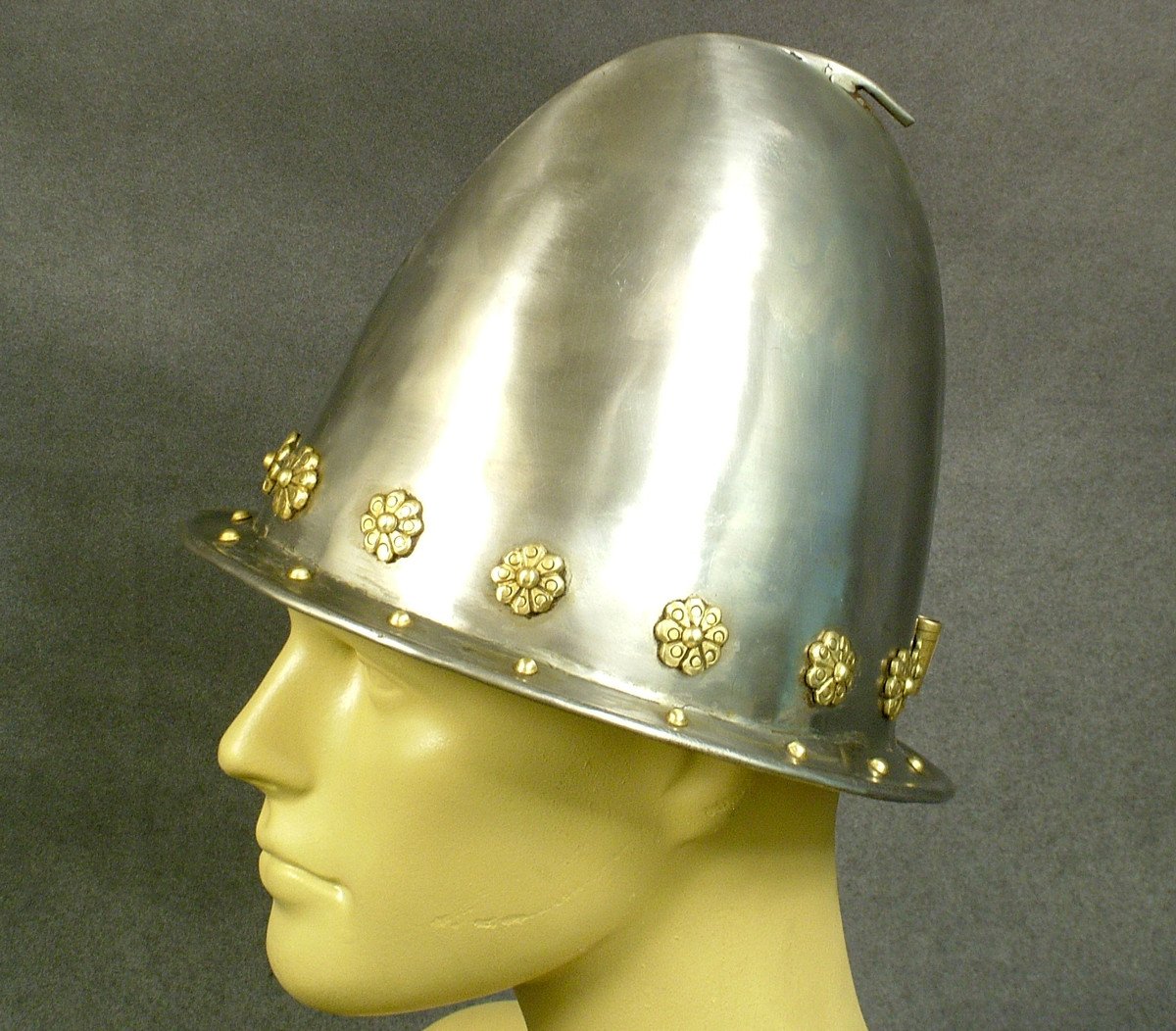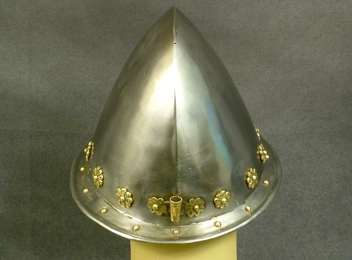 New Made Item: As used by the first English Settlers at the Jamestown, Virginia settlement in 1607 and again at Plymouth Colony in 1620. These were the standard Infantry headgear of the early 17th century used in England and much of Europe. Only a few available, as they were originally imported from England in the early 1990?s. Polished steel construction and decorated with brass rosettes around small brim with brass plume holder on the rear. Unlined but ready to display.