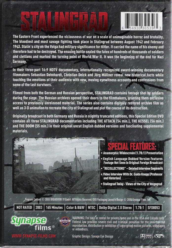 DVD: (2003) Filmed from both the German and Russian perspective, the series contains footage shot by soldiers during the siege. The Russian archives opened their doors to the filmmakers, granting them exclusive access to previously unreleased material. The series also contains digitally restored archive film as well as 3-D animation to recreate the city of Stalingrad and plot the course of its destruction. Originally broadcast in both Germany and Russia in slightly truncated editions, the Special Edition DVD contains all three Stalingrad documentaries including THE ATTACK (54 minutes), THE KESSEL (56 minutes), and THE DOOM (55 minutes) in their original uncut forms. DVD