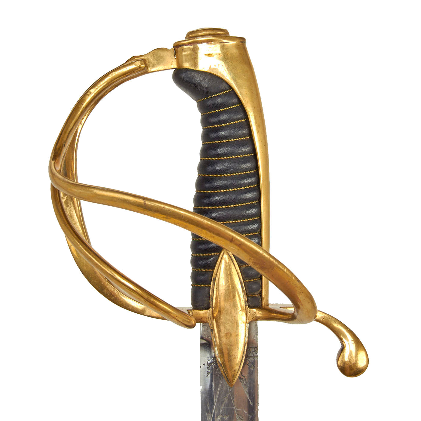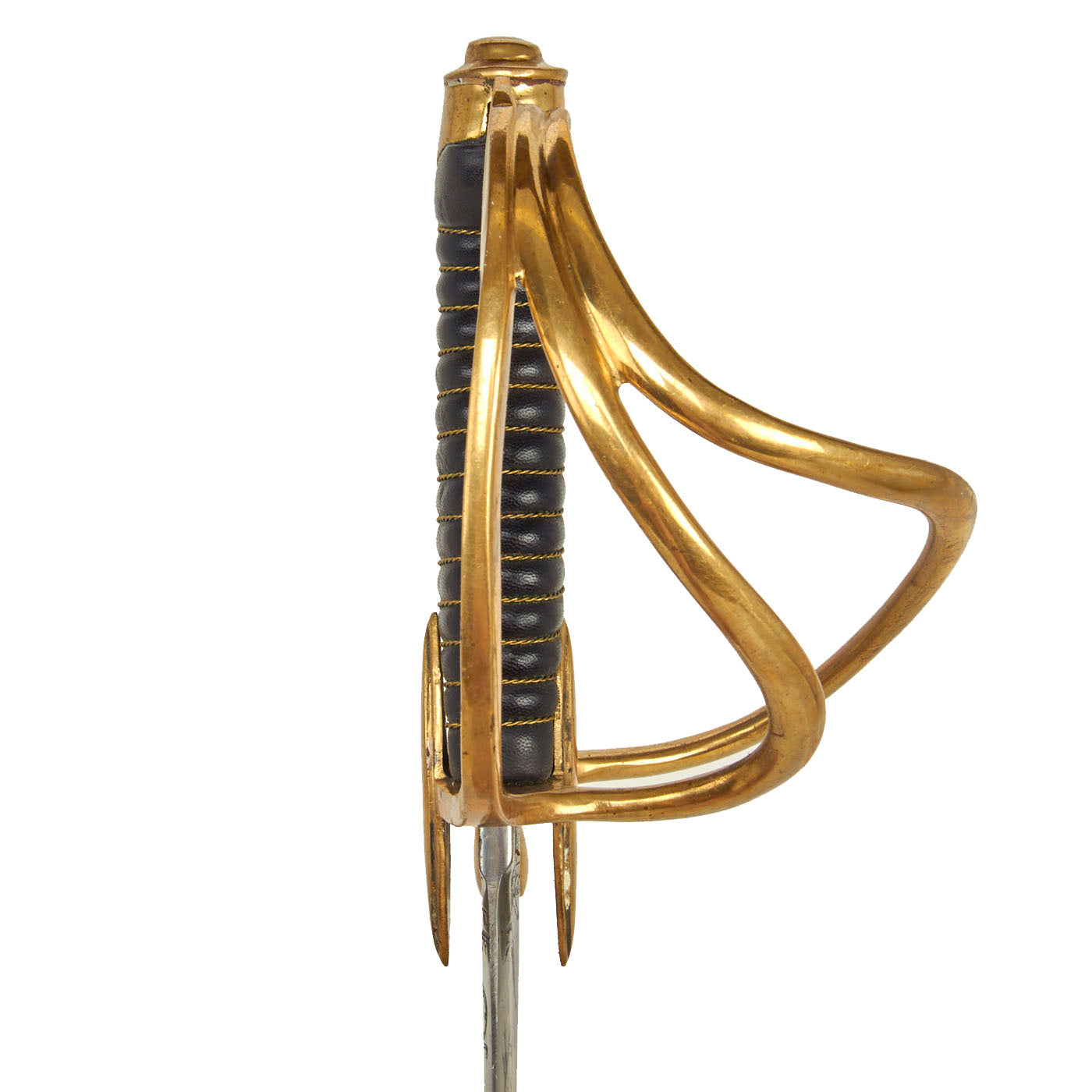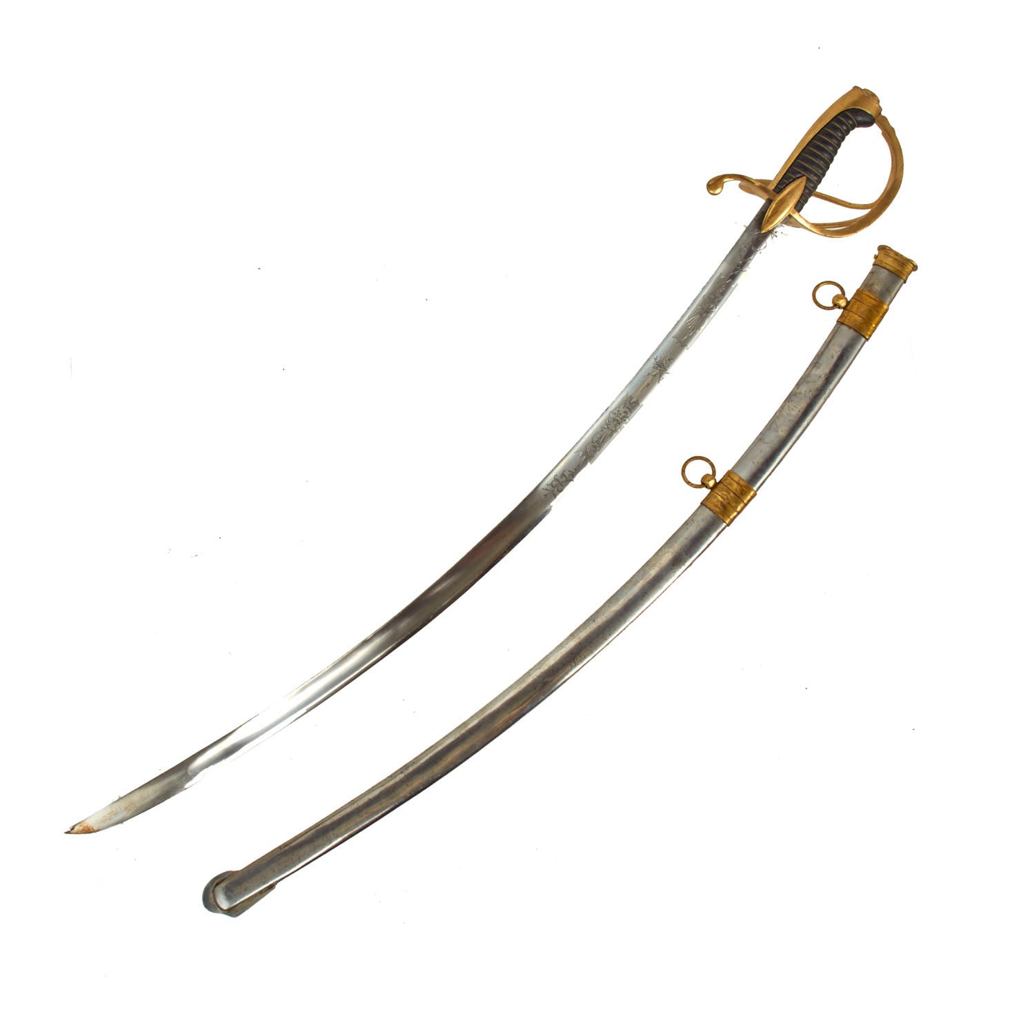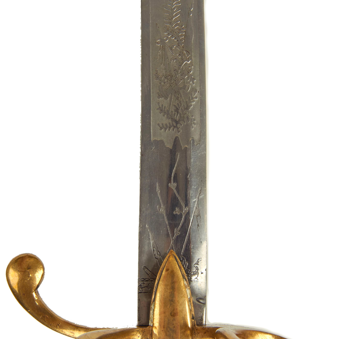 New Made Item: Heavy Brass three bar hilt. Massive curved blade with French Inscription. Compete with all steel scabbard.