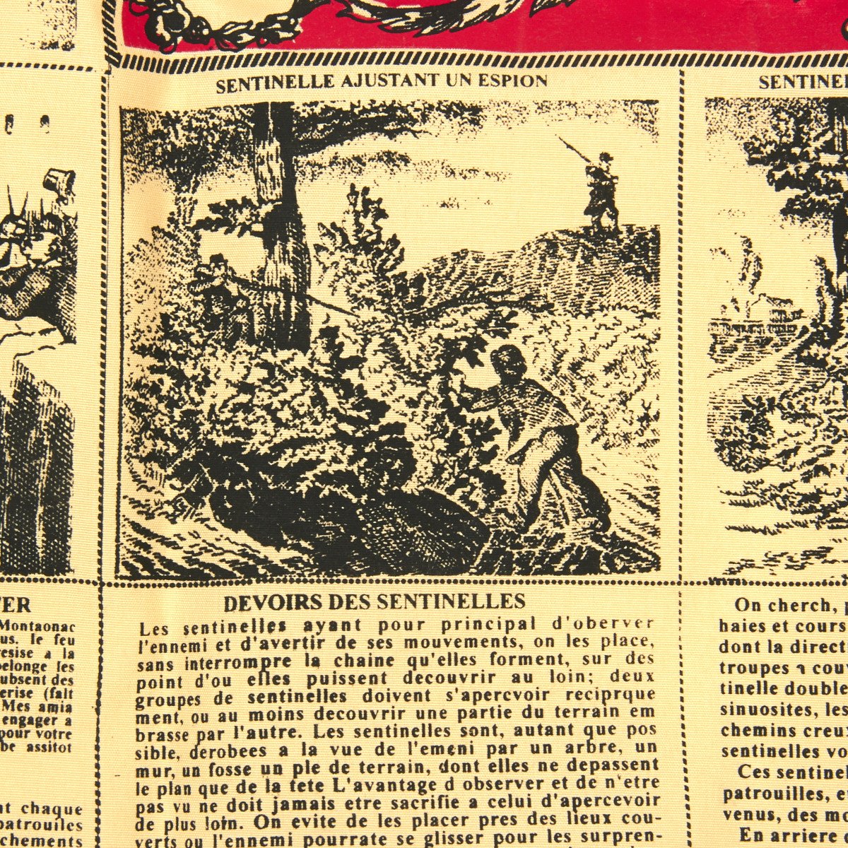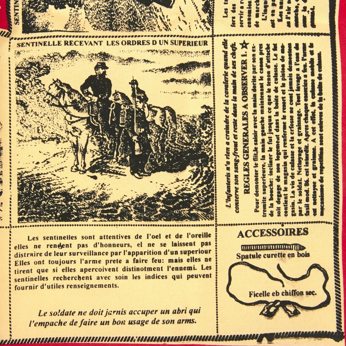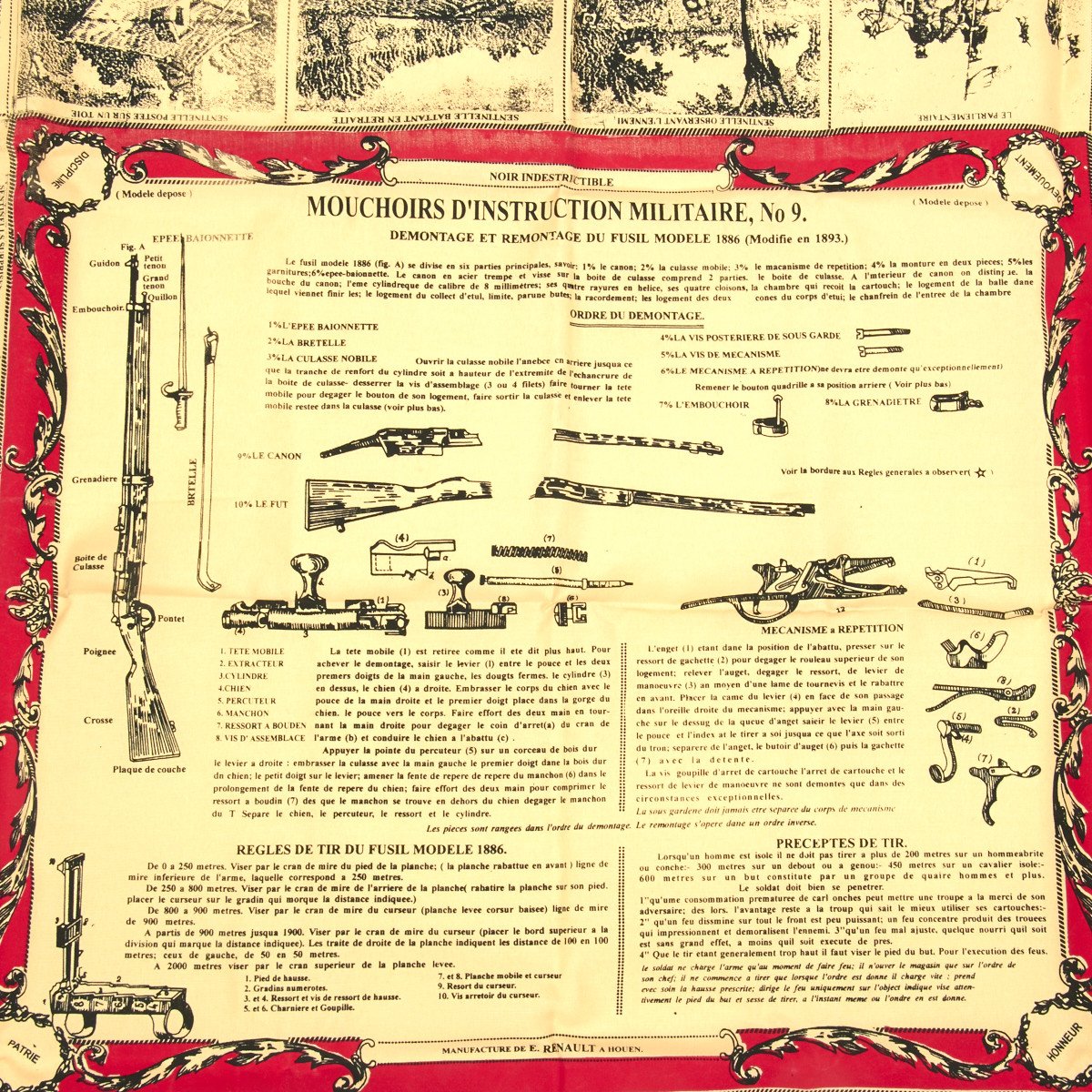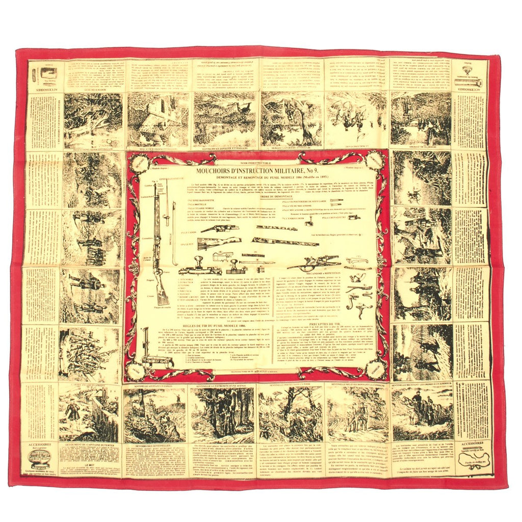 New Made Item: This is an exact copy of both the French cloth soldier scarf issued in the late 1800s showing the complete breakdown of the French 1886 Lebel Rifle. These cloth scarves stood up to the weather and provided prolonged service as an instructional tool as well as a uniform accessory.