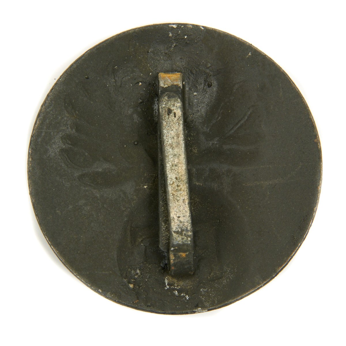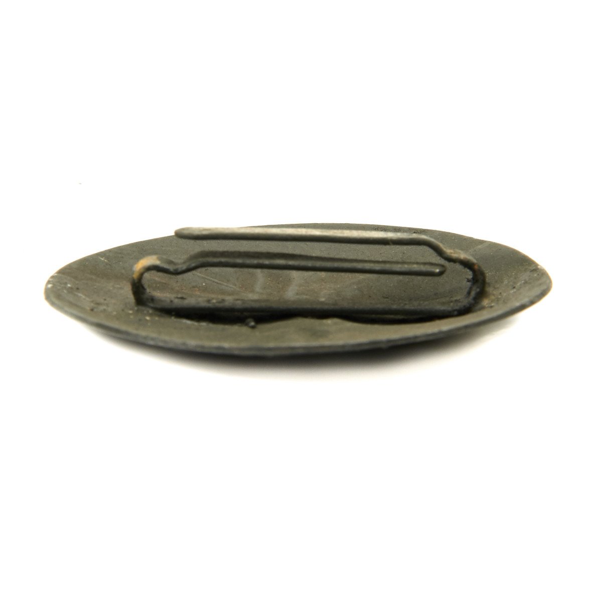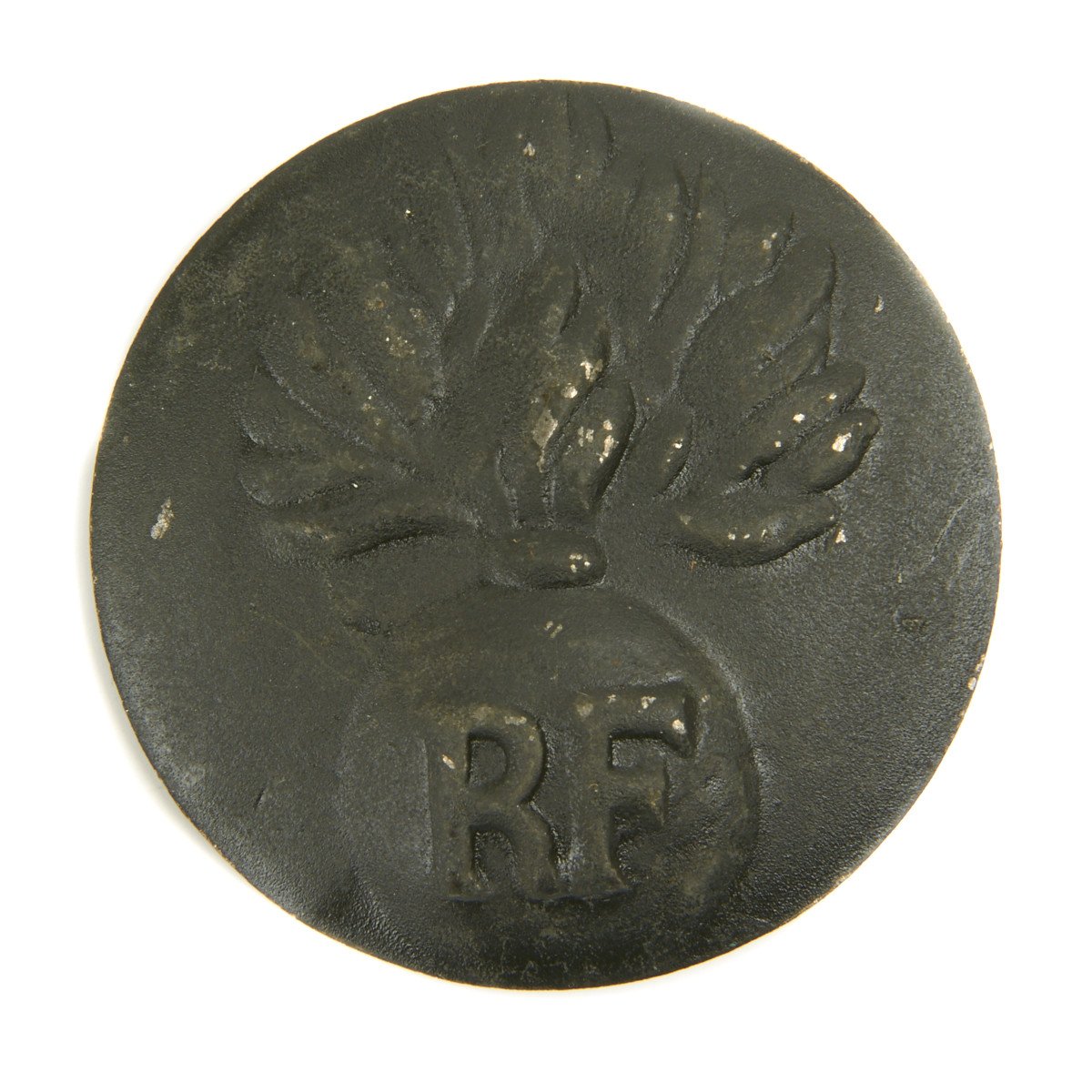 New Made Item: Standard issue on French steel helmets in WWI and WWII were these circular metal badges showing flaming bomb with "RF" in the center for Republique Francais. O.D. in color with folding securing pins in rear.