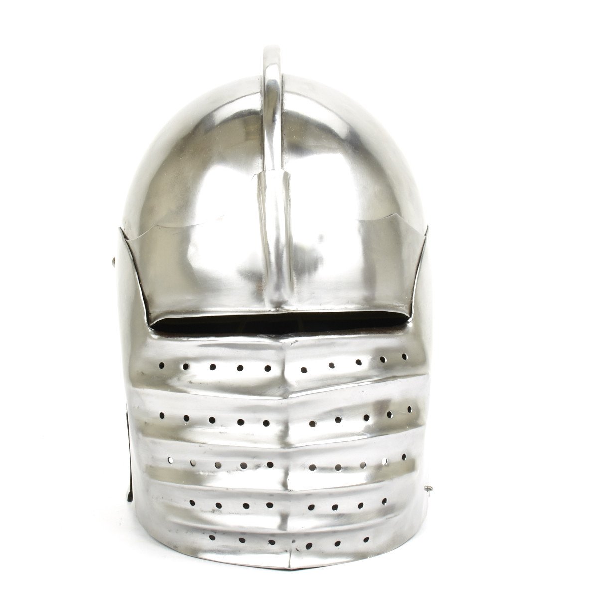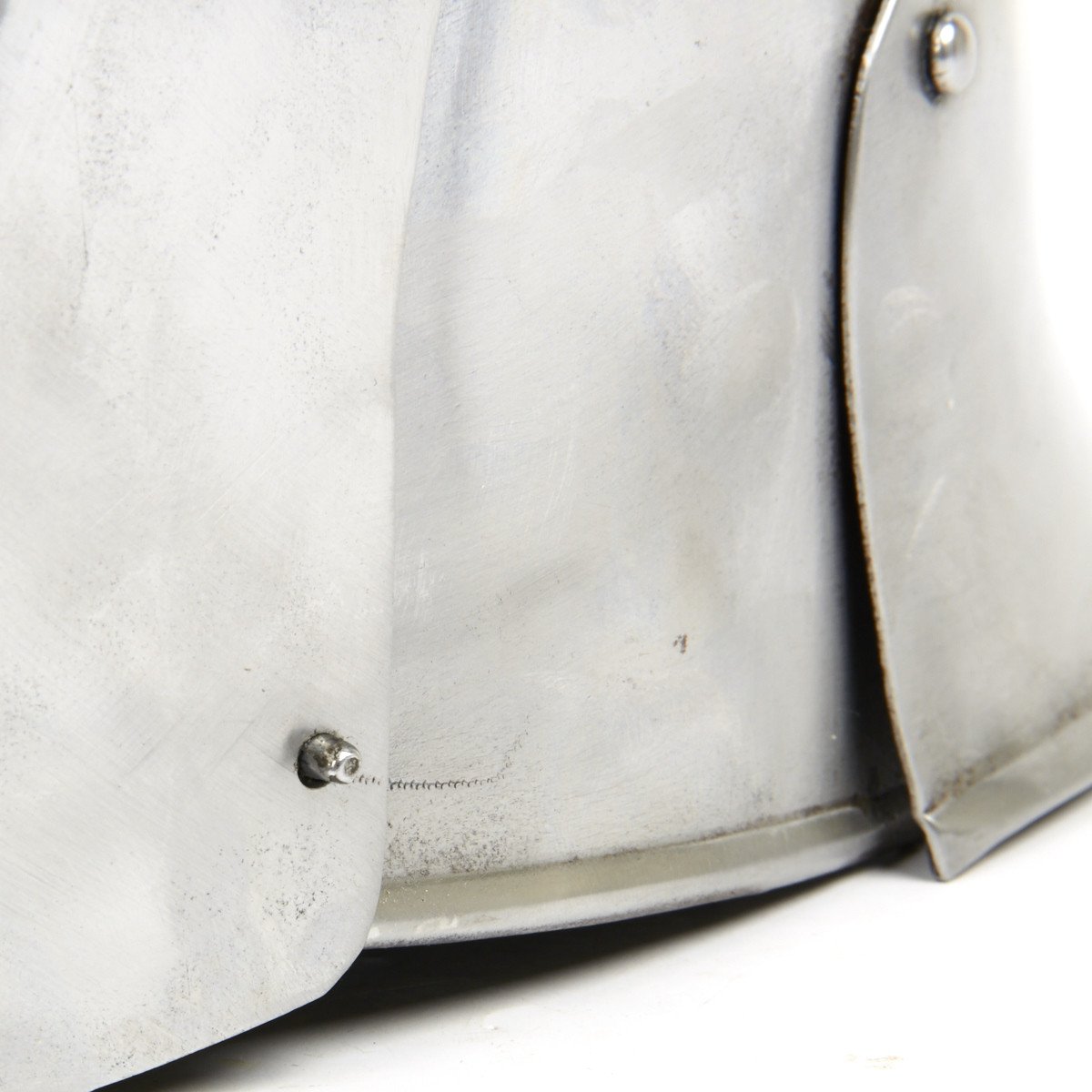 This excellent replica is constructed of 18-gauge steel, which provides a perfect middle ground for both weight and protection. The helmet features an internal leather lining and is fully wearable, either for costume use or beyond. With its unique look and feel, this German Closed Bellows Helmet would make a great addition to any suit of German gothic armor or it would make a great individual display piece on it own.