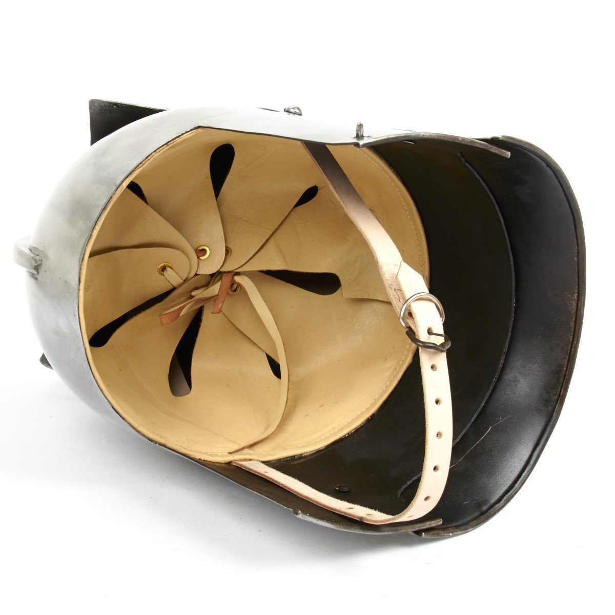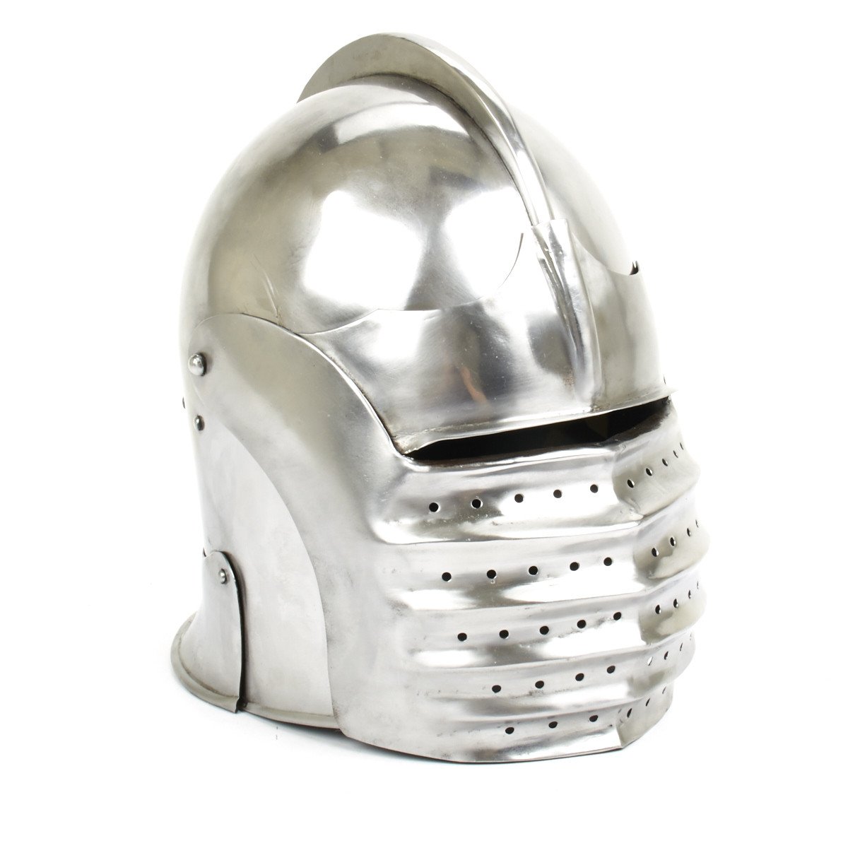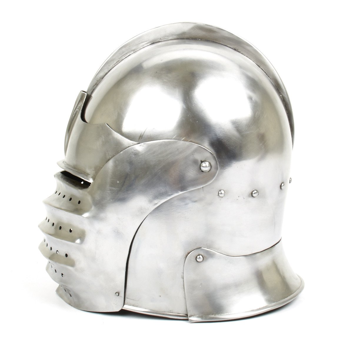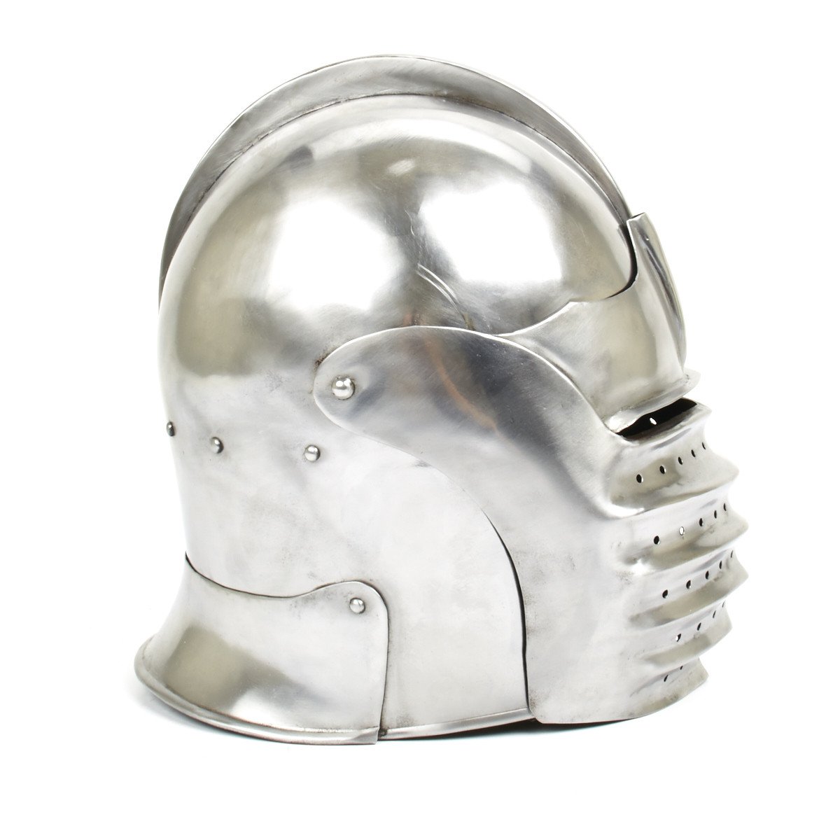 New Made Item: This German Closed Bellows Helmet replicates a 17th century piece of armor that would have been the favorite of many warriors, thanks to its protective strength. This helmet is surprisingly simple in its design and simplicity is typically the most effective design of all.