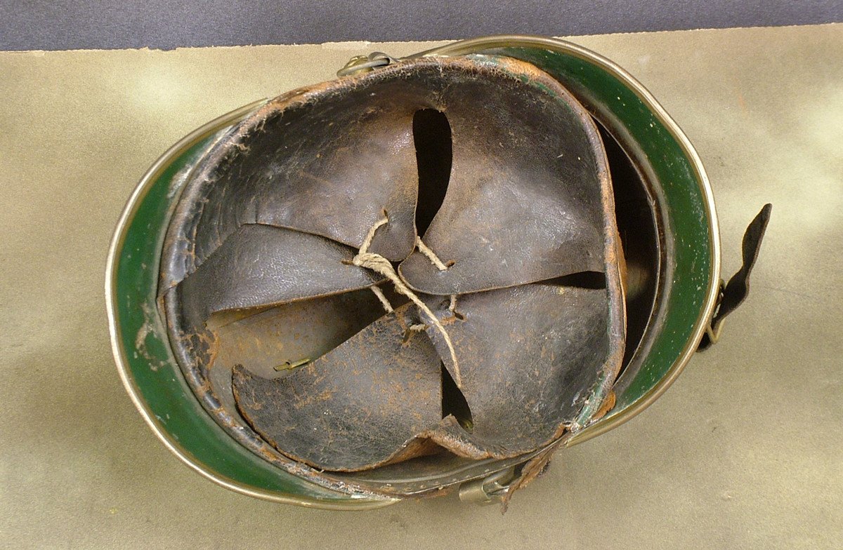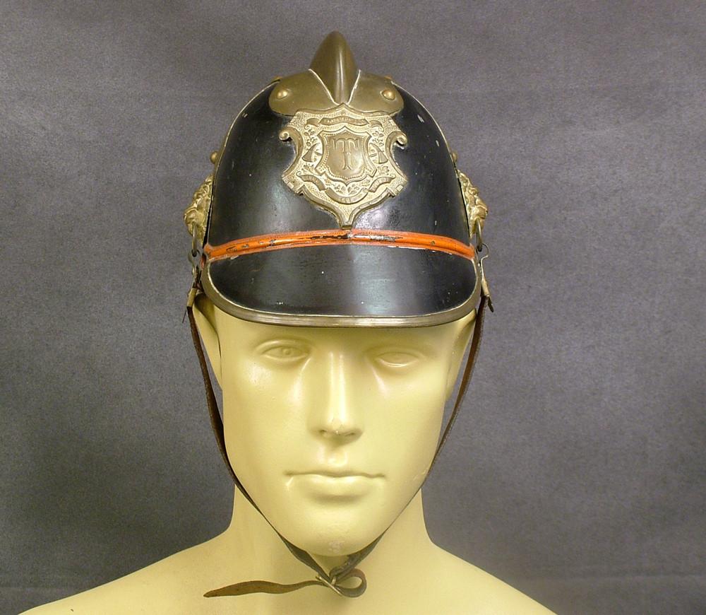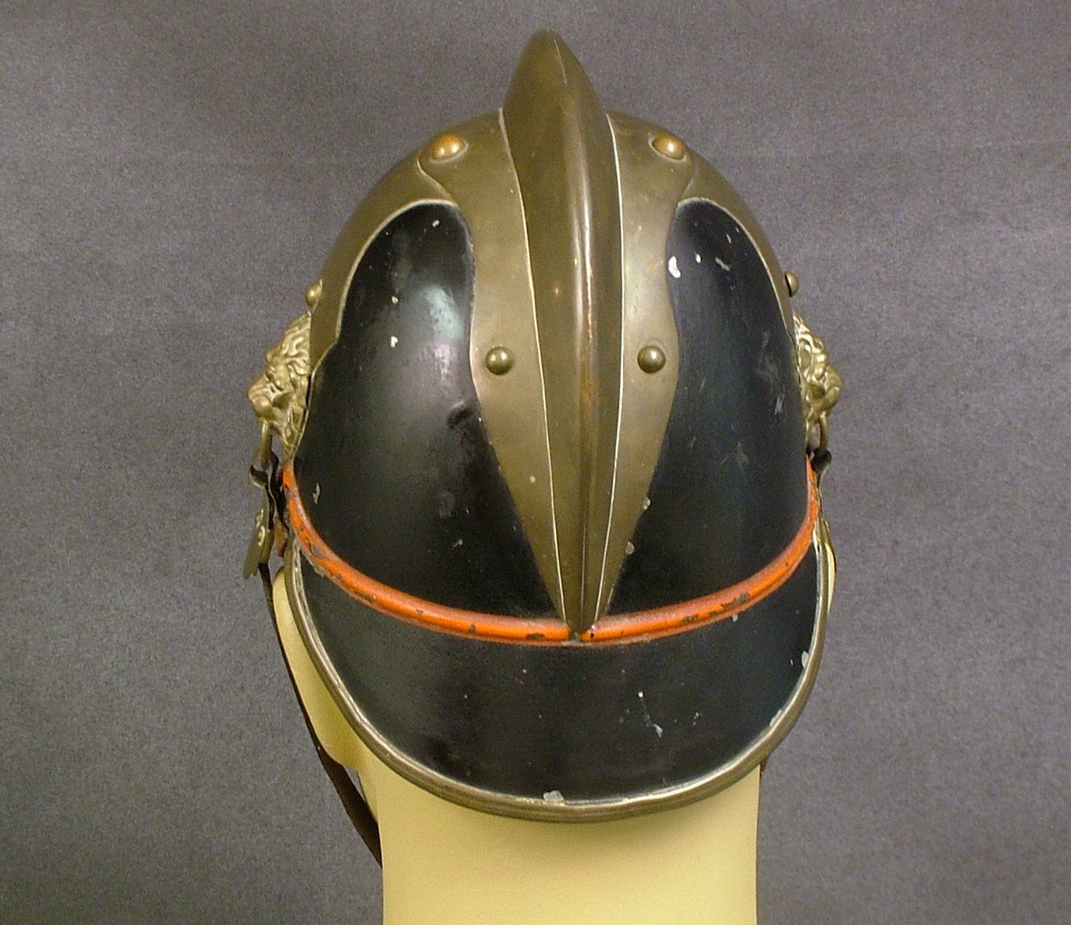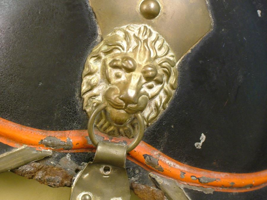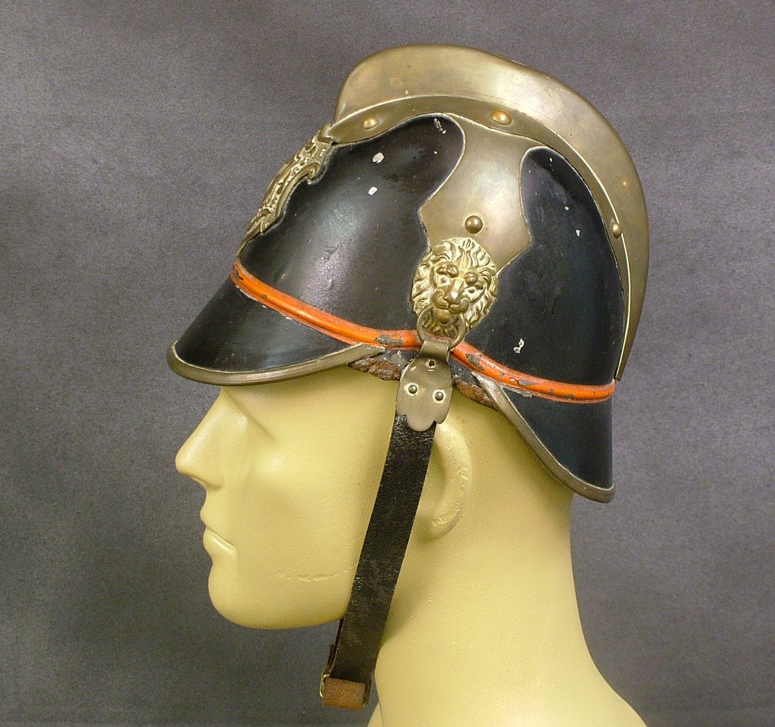 Substantial Brass Helmet "Crest" with side brass side panel supports and "Lion Head" ear bosses. Helmet comes complete with original black leather liner, appears complete but somewhat detached and original black leather, brass mounted, chin strap still present. A very nice original helmet with brass trim around front and rear brim, like most WW1 era German Helmets this is on the small side which, once again, underscores the advances in nutrition over the last century. A wonderful display piece in excellent overall condition.