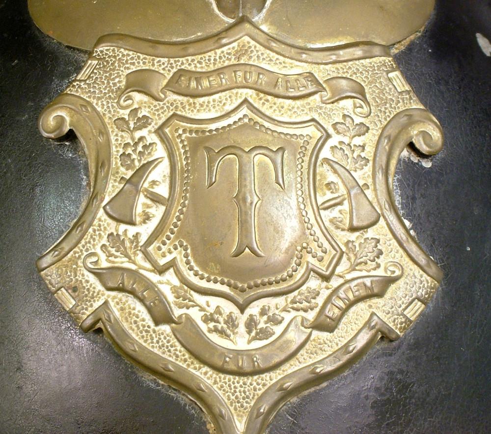 Original Item: One Only. This is a classic Bavarian Fireman's Black Steel Helmet with profuse all brass mounts. Helmet plate bearing a large "T" in shield to center, surrounded by Axes on either side amid Oak leaf decoration and with ribbons to top and bottom. Reads; " Einer fur Alle, Alle fur Einen. (Translates from German to English to mean: "One for All, All for One").