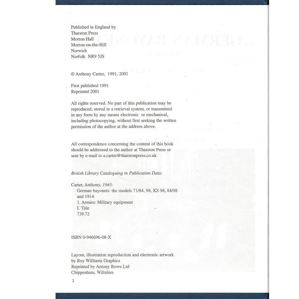 Tharston Press, 1991, 2001, Hard covers, blue cloth binding, 239 pages, 10 x 7_ in. size, many illustrations. Seitengewehr 71/84, Seitengewehr 84/98, Seitengewehr 98, Seitengewehr 1914, Foreign & post-war, &c. Unit markings, specification drawings, export variations & markings.