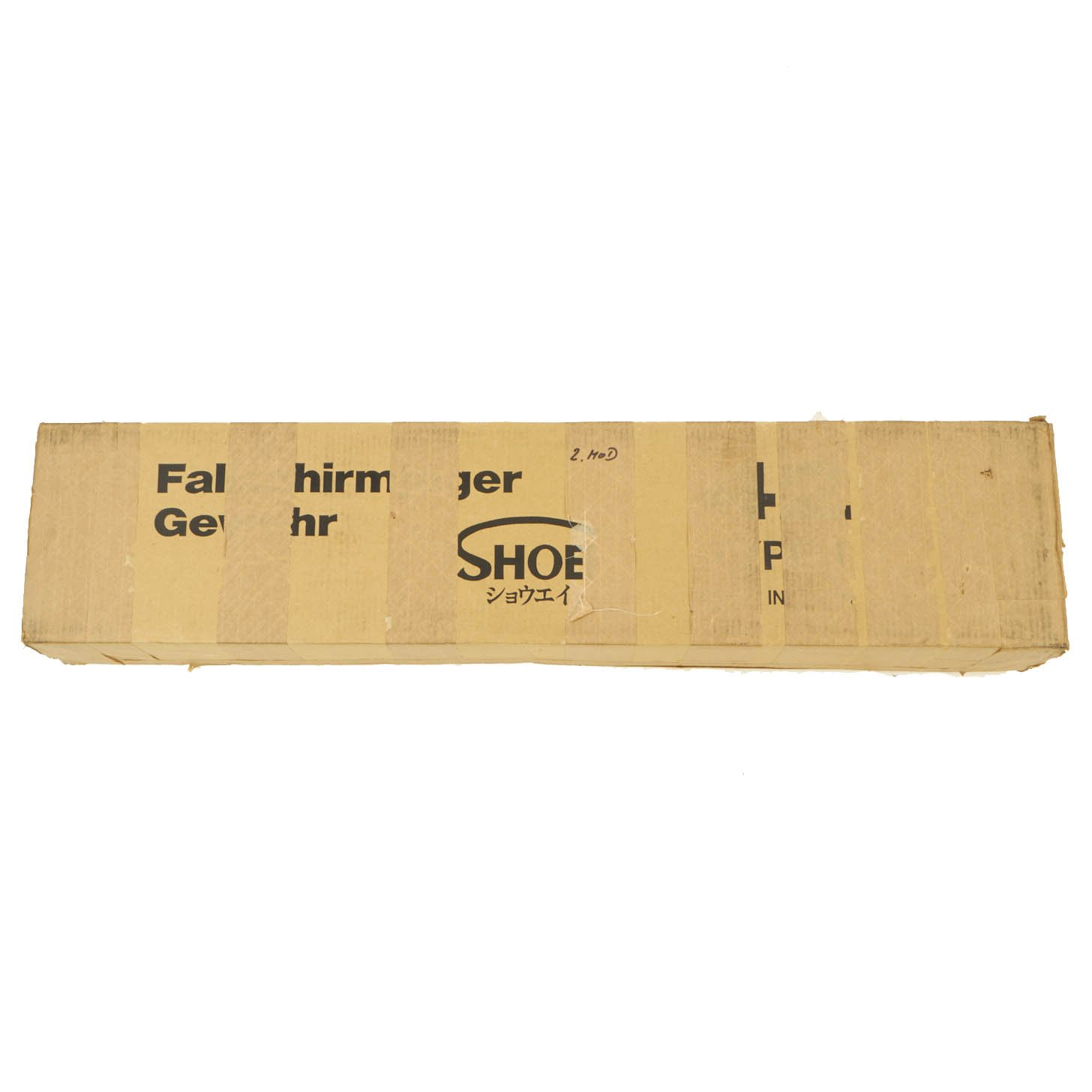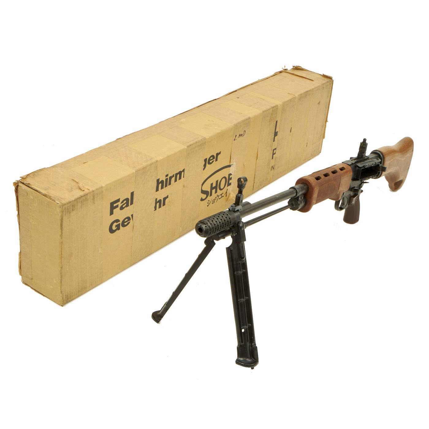 This is a quality 1:1 scale copy of the later pattern "Type II" FG42 paratrooper machine gun popular with modern re-enactors. Shoei manufactured these replica guns to be an exact copy and to be disassembled and operate the same as the original. These are all steel, everything moving as needed, fully cocking when the charging handle is pulled back, and trigger to fire the bolt forward. The best of the best in replica dummy Firearms which has no become a collectible in its own right.