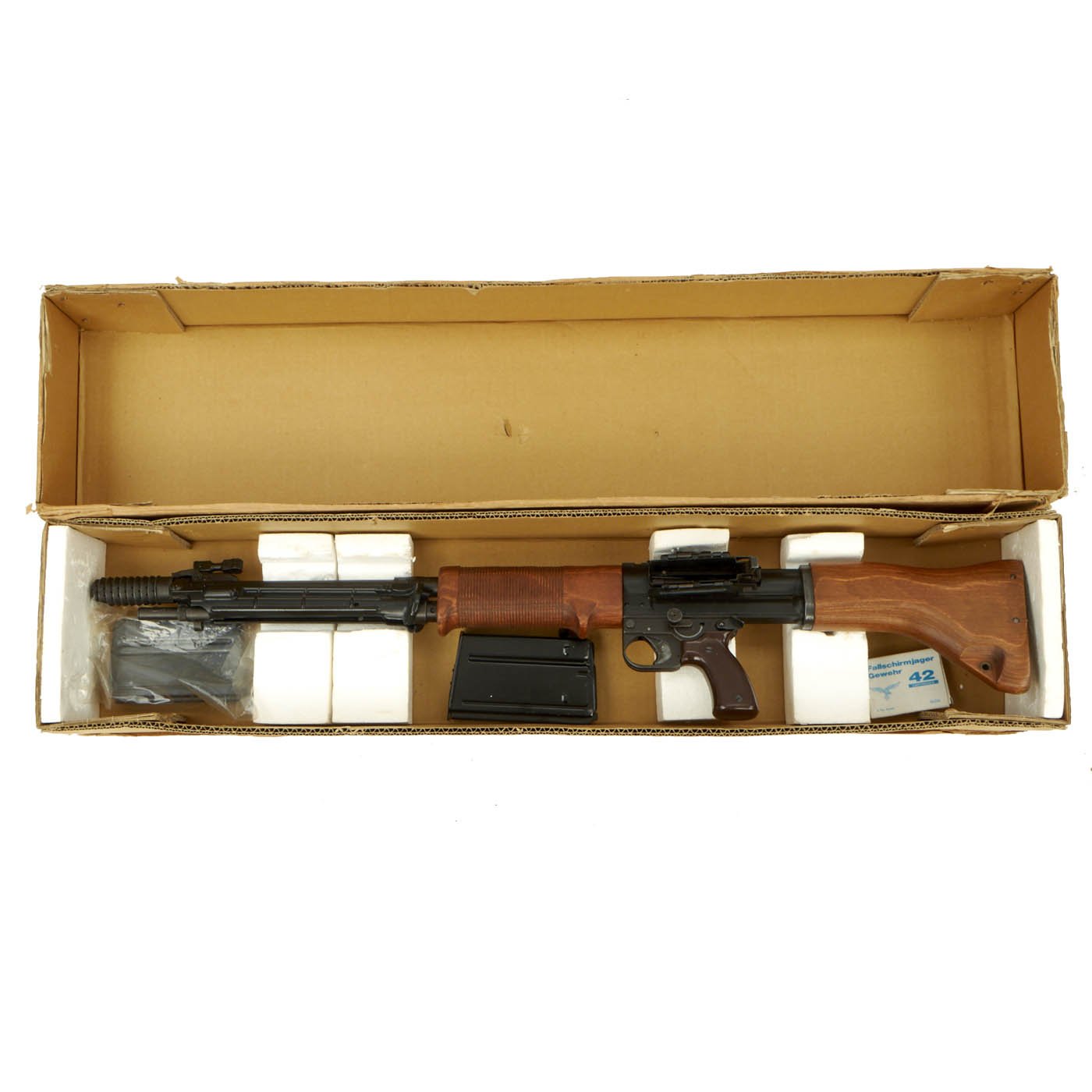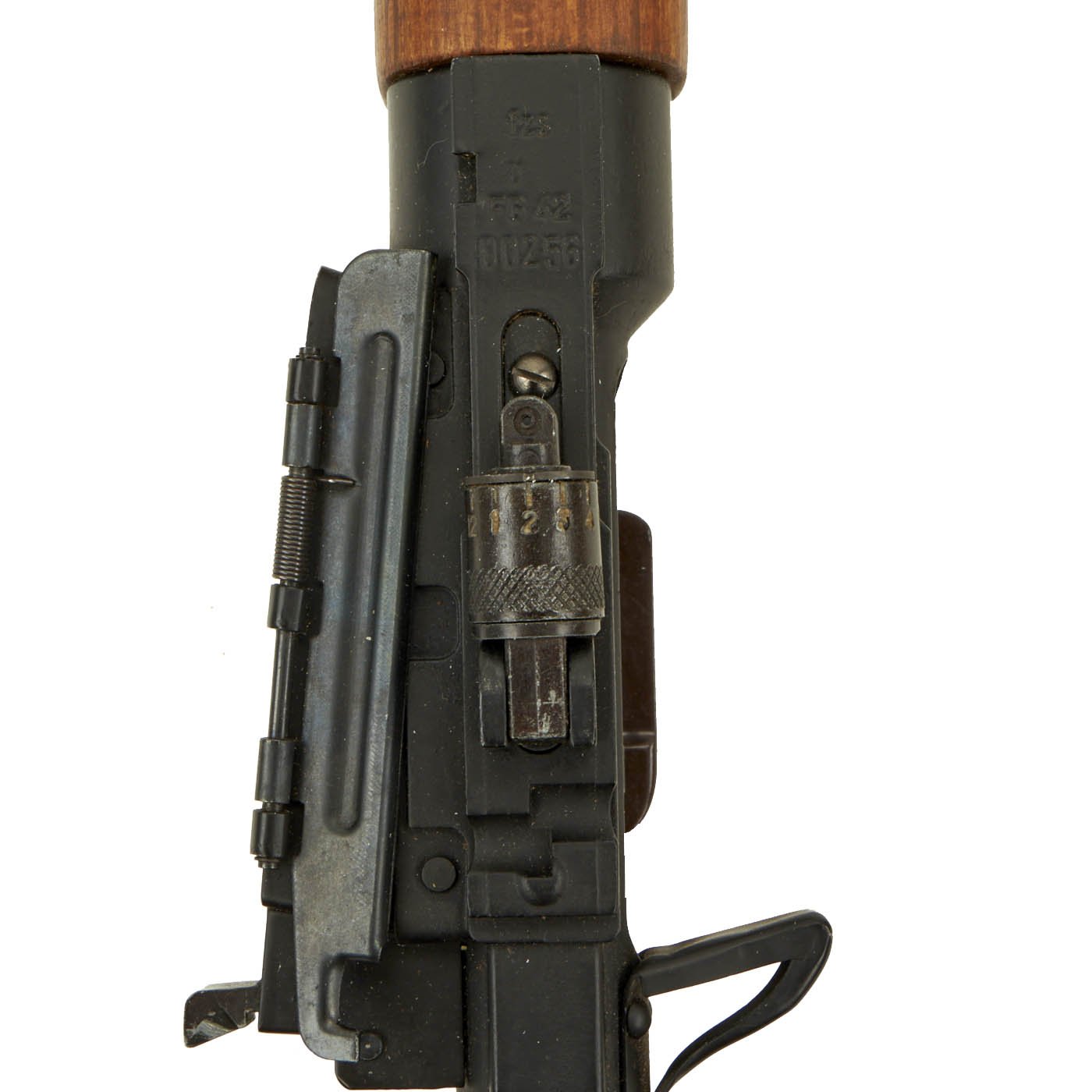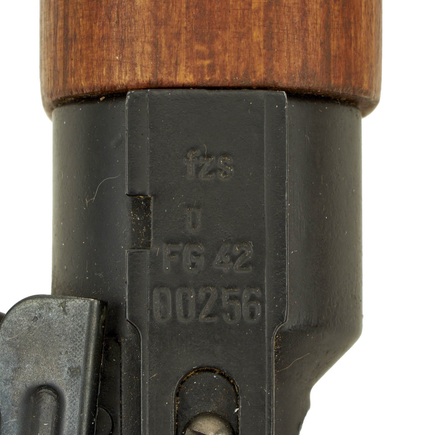 This example is Serial #00256, with a 20 1/2" barrel. This replica is not capable of being fired. The rifle is made of metal parts which are in excellent condition and have very little to no handling wear. The top of the receiver plate is marked "fzs/u", similar to the original German markings. The laminate wood forearm and buttstock are excellent and rifle features a brown plastic pistol grip. Other features include flip-up front and rear sights, and a folding bipod. The original box is included with two magazines.