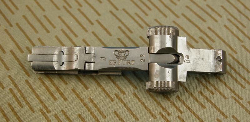 Original Item: German Luger toggle assembly, including the breech block, front toggle, and rear toggle. This set also includes the extractor, extractor spring, and pin; front and rear toggle pins; and coupling link pin. The front toggle link is marked with a crown over ERFURT. All parts with a serial number have the same two-digit number, 22. The assembly is blued and in excellent condition.