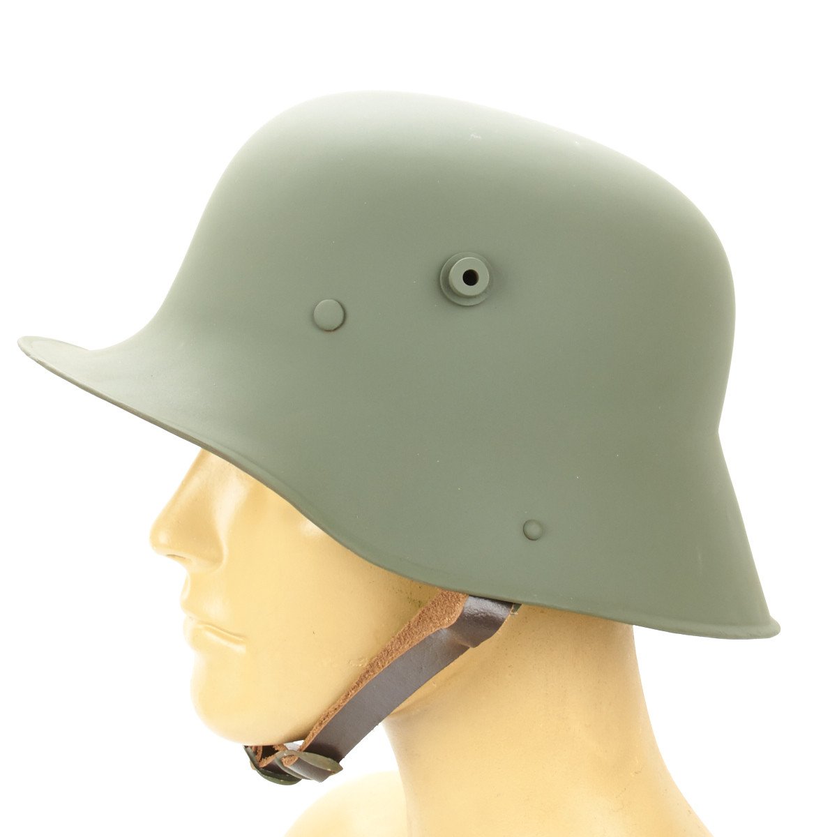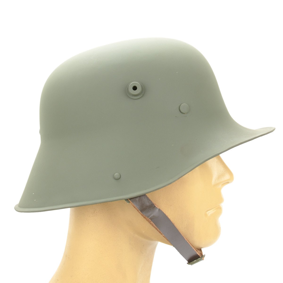 New Made Item: This is a quality all steel First Model German 1916 Steel Helmet reproduction. It comes complete with the following early model features: A primitive three piece padded leather liner, and Pickelhaulbe style thick leather adjustable chin strap with securing rings to the inside of the helmet bowl. Many helmets with this type of chin strap were later converted to the M17 or M18 standard, as the chin strap was prone to falling off. Later liner-mounted chin straps were far more secure, which is why the original configuration is rarely seen. Both of these features were changed for the M-1918 Production. This M16 also has the required "horns" for ventilation and for mounting the Sniper Brow Plate. It also has the signature German Helmet rolled edge. It certainly has been worth the wait!