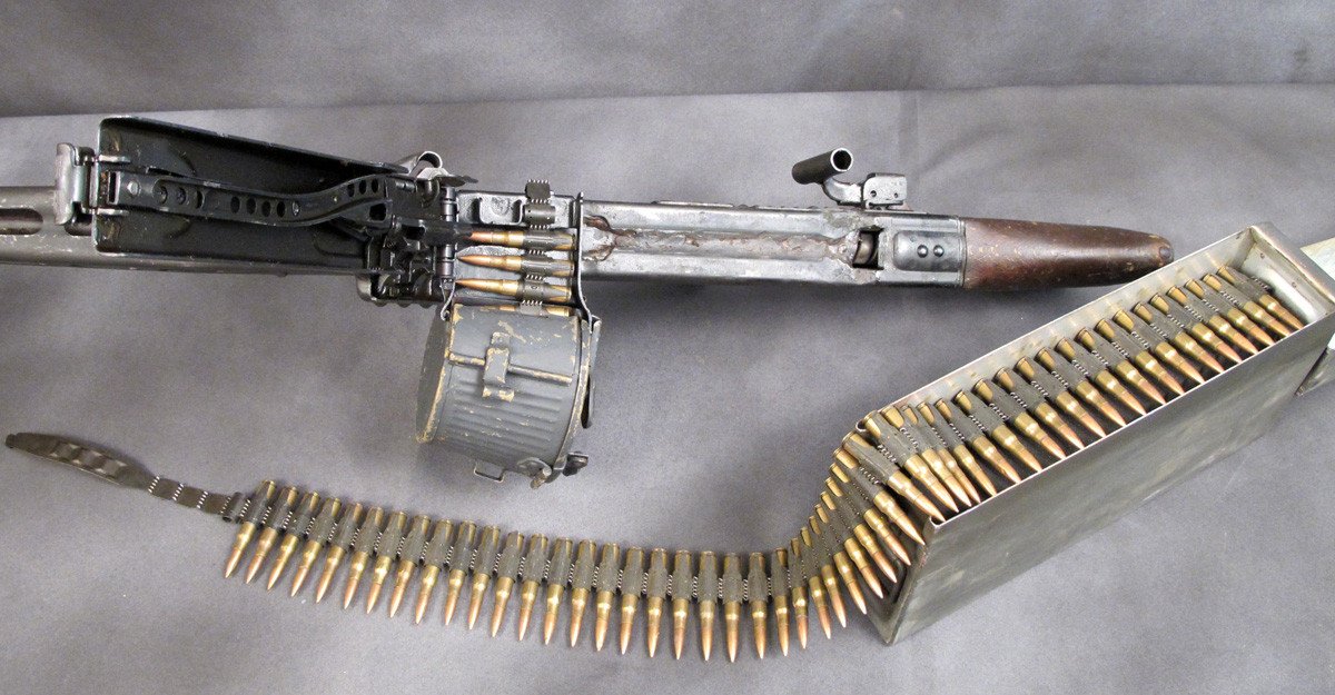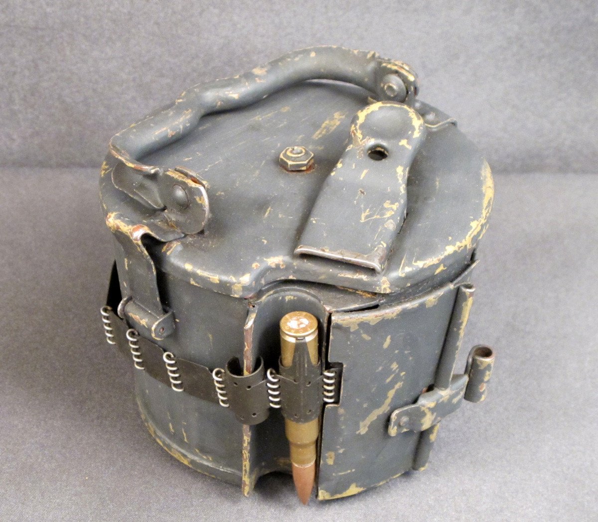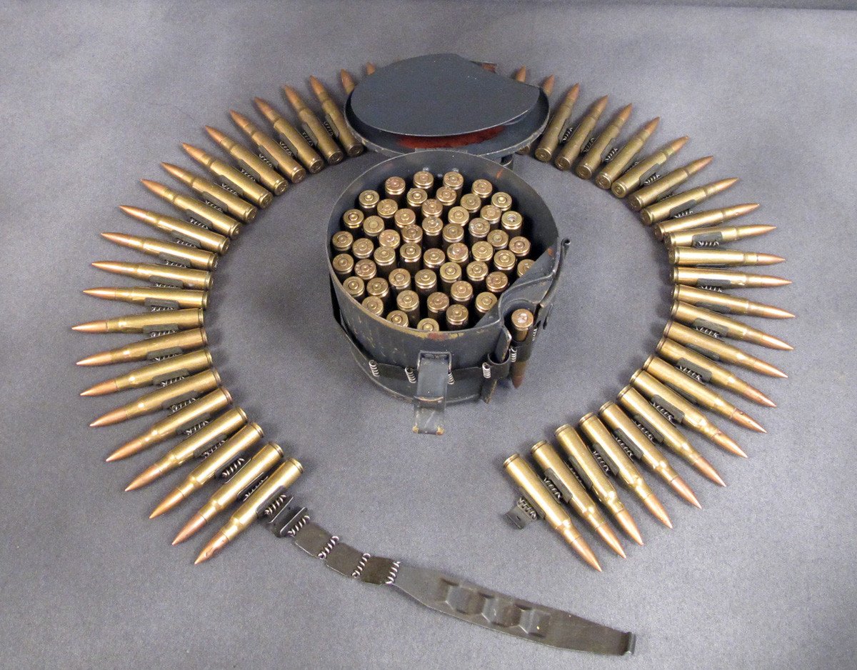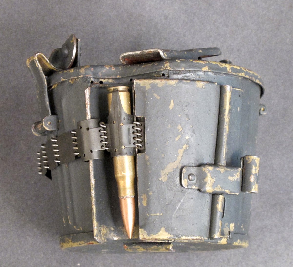 Original Item: German MG 34 & MG 42 ammunition basket belt can with WW2-type 7.92 x 57 mm cartridges in an original 50-round belt and starter tab. In this new offering, IMA is including an original starter tab and the two extra cartridges it requires. Great to display with your MG 34 or MG 42 display guns. The can, and belt with dummy ammunition and starter tab are a perfect complement to a display MG 34 or MG 42; used correctly with a belt drum (Gurttrommel), the combination creates a truly exciting display. When originally used by the Wehrmacht, the correct set-up of the belt drum with ammunition included a starter tab that is tucked into the square trap on the exterior of the drum for transport. The basis of German WW2 belts for the famous MG 34 and MG 42 universal machine guns was a 50-round non-disintegrating section. These sections could be linked together to create belts of any length. IMA has a very small quantity of 50-round belts complete with starter tabs, and 52 dummy 8-mm German cartridges. The dummy cartridges are made up from fired 8-mm cases with military 8-mm German projectiles. The projectiles have cupronickel jackets, which were used extensively in both world wars. (Very Good/Excellent Condition) Few Only. Not available for Export.