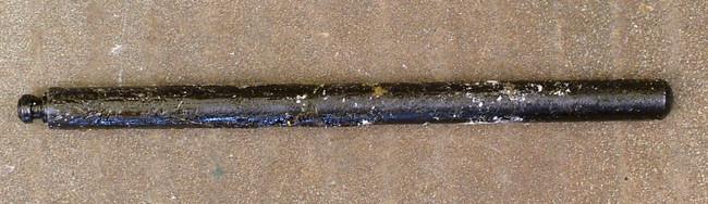 ?_ Cylindrical Metal Oil Bottle with screw top and dipper which can fit inside butt trap of weapon.