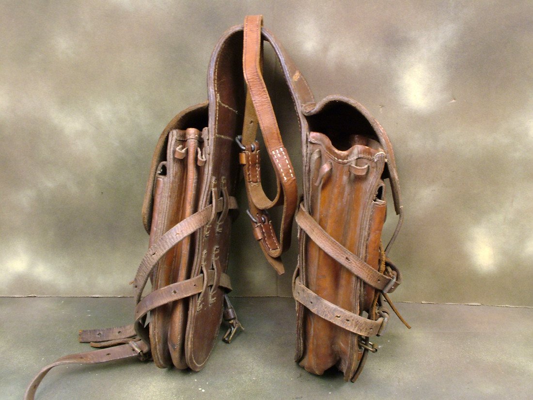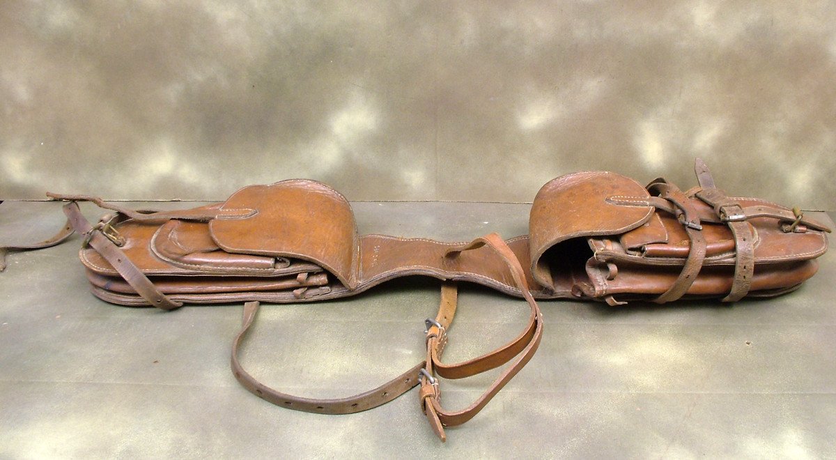 Original Item: One Only. Recently purchased from a Veteran's Collection; this gear just isn't found anywhere any more. Very high quality brown leather set of Saddle Bags for use with Horses in WWI and then with Motorcycles in WW2. Shown in detail in the printed ?Men-at-Arms Series # 234- German Combat Equipments 1939-45". Illustration page "E? following script page 24, item #5. Complete with straps and in very superior condition, this rig bears various marking, numbers etc but of course most importantly a Waffen amt, code and date of 1940. However, of most interest; upon closer examination located on reverse side from the Waffen amt marking, code and 1940 date there appears to be a very faint WW1 Makers stamp, looks like Berlin 1918(?) That being the case, this set must be a very rare WWI Cavalry Set refurbished and reissued in WW2 most probably for Motorcycle use.