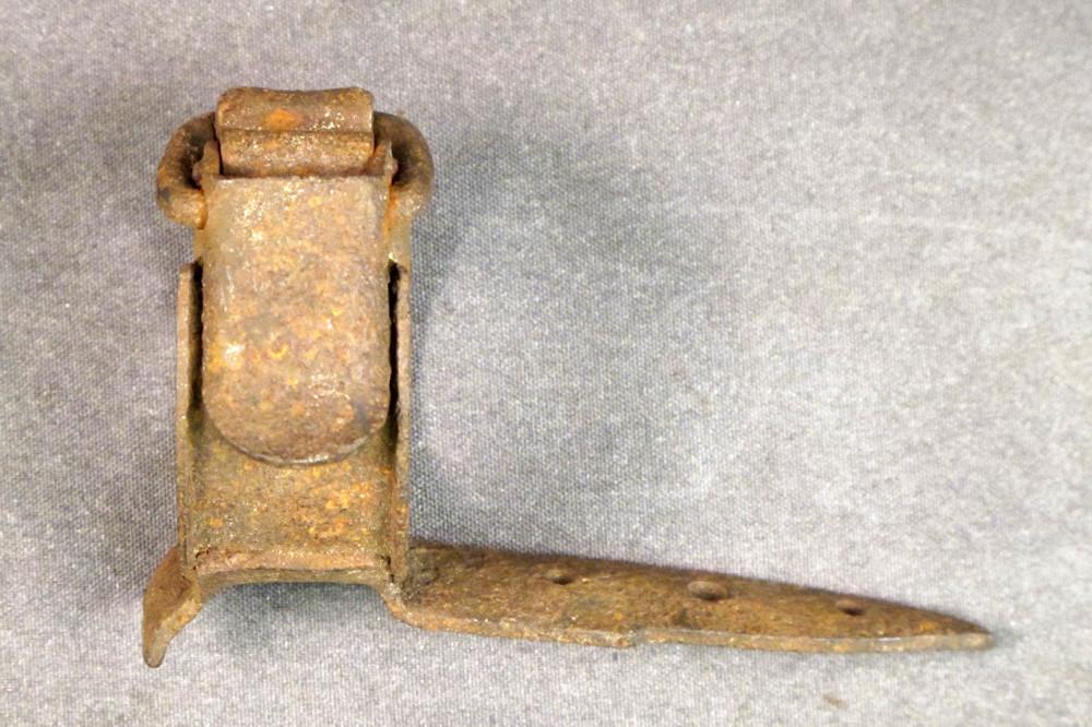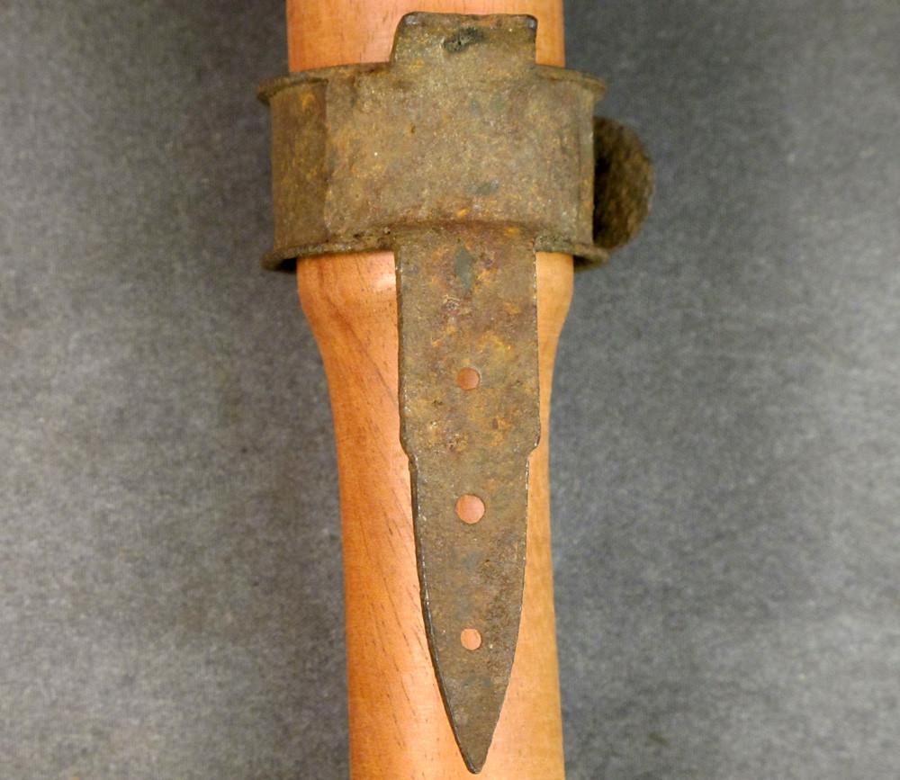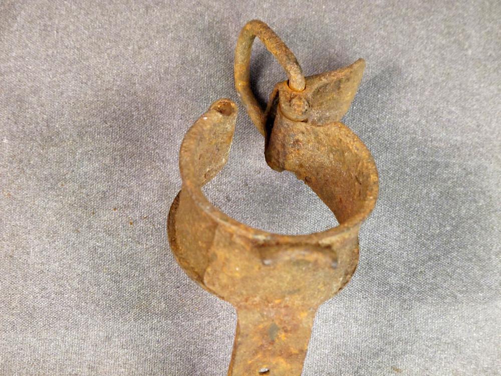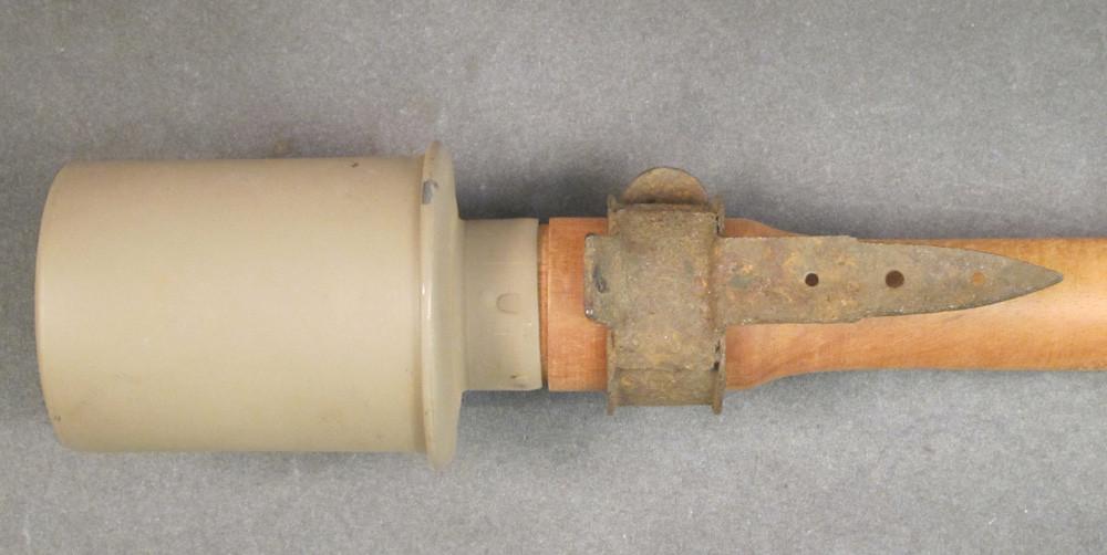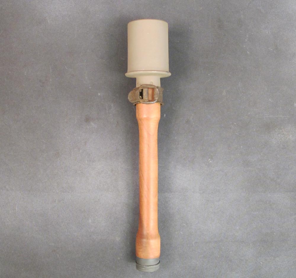 Original Item: Rusted but never used. Very limited quantity that was apparently found in storage in northern France and a new arrival at IMA. These are ratchet catch closing Steel Collars welded to pointed and predrilled steel mounting bar intended to be nailed to a tree, gate post, or anywhere that could conceal a potato masher grenade. Insert the shaft into the collar then secured the stick grenade while a wire was attached to the firing cord. Once set, the idea was that the wire would be tripped, kicked, gate opened thereby setting off the grenade to the great disappointment of whoever triggered the booby trap. Clearly this was an accessory that was only used once hence never seen on the surplus market. Fascinating and clearly rare comes rusted but very solid with no discernible markings. Very few available.Steel mount only, stick grenade available separately.
