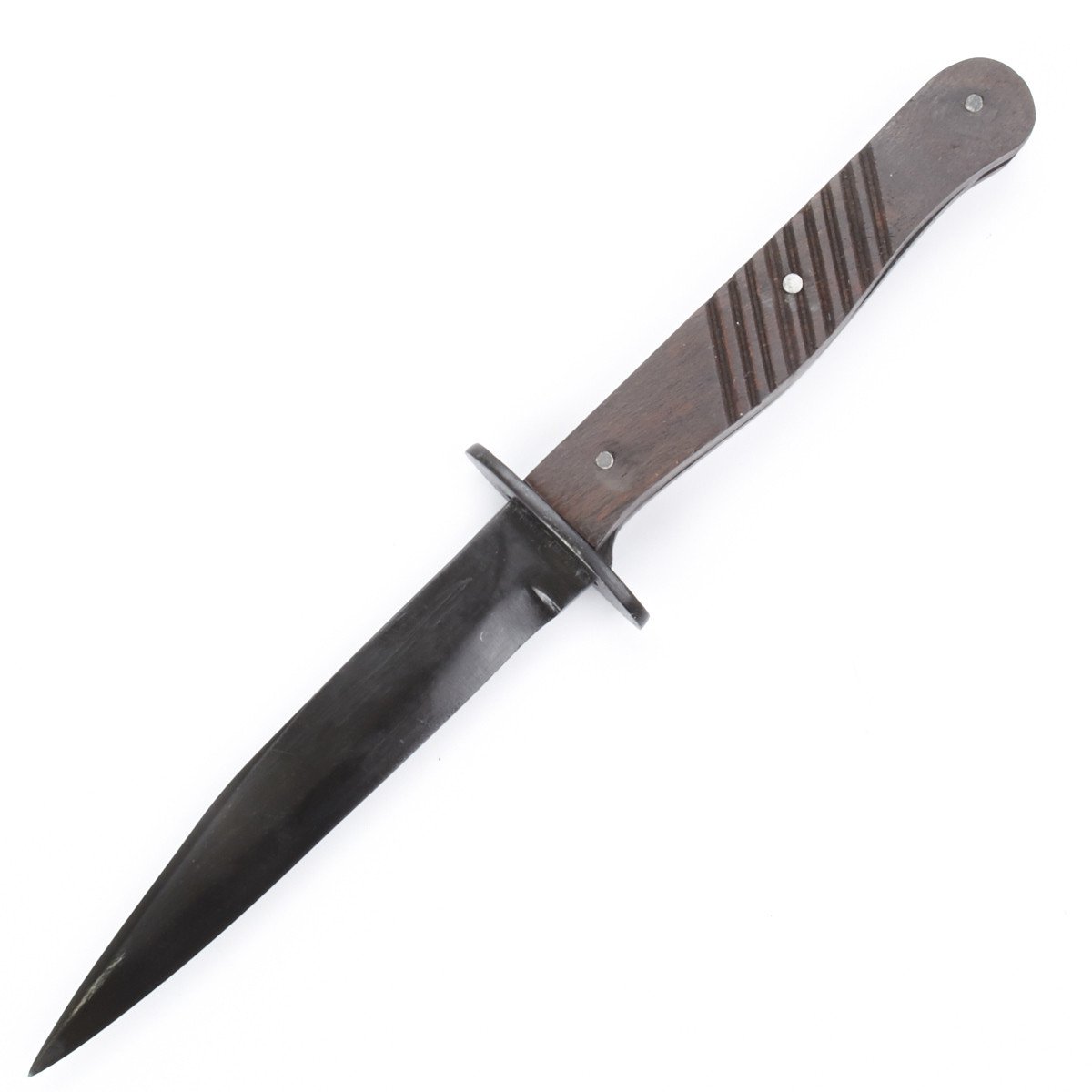 New Made Item: A fine example of the German Trench Knife of WW2, with ribbed wood grip panels and blued metal finish. Many of the originals were made for WW1 and then reissued and reused in WW2 with new scabbards and a blued finish. A classic hand-to-hand combat weapon of both World War One and Two. Ideal for Collectors and Reenactors.