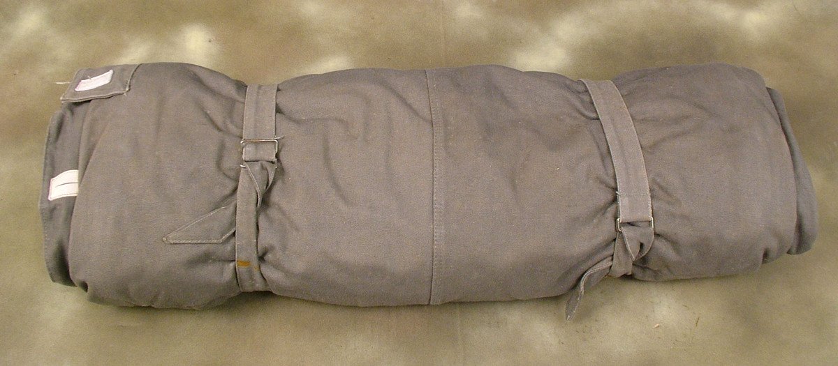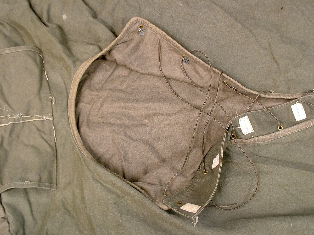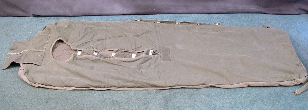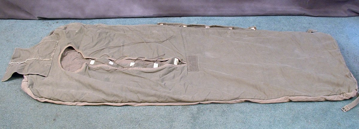 Original Item: Just what we all need for a cold night in the forest. Remember Stalingrad? Well, if the Germans had more of these maybe they would have made it all the way to Moscow! These are large, rugged canvas sleeping bags, which bear no markings but are consistent with German WW2 specifications. WW2 style Construction details include WW2 flat metal buttons, double layers of leather-reinforced buttonholes, brass grommets, and leather/canvas tie down thong. The exterior of the bag is a strong canvas material, while the interior is soft flannel. The bag encloses the sleeper?s entire body except for a small facial opening, suggesting applications in Scandinavia, or the Eastern Front. The facial opening is provided with a loose covering flap for inclement weather. A long opening (27 inches, 69 cm) on the left side allows access to a space between the outer cover and the insulation.