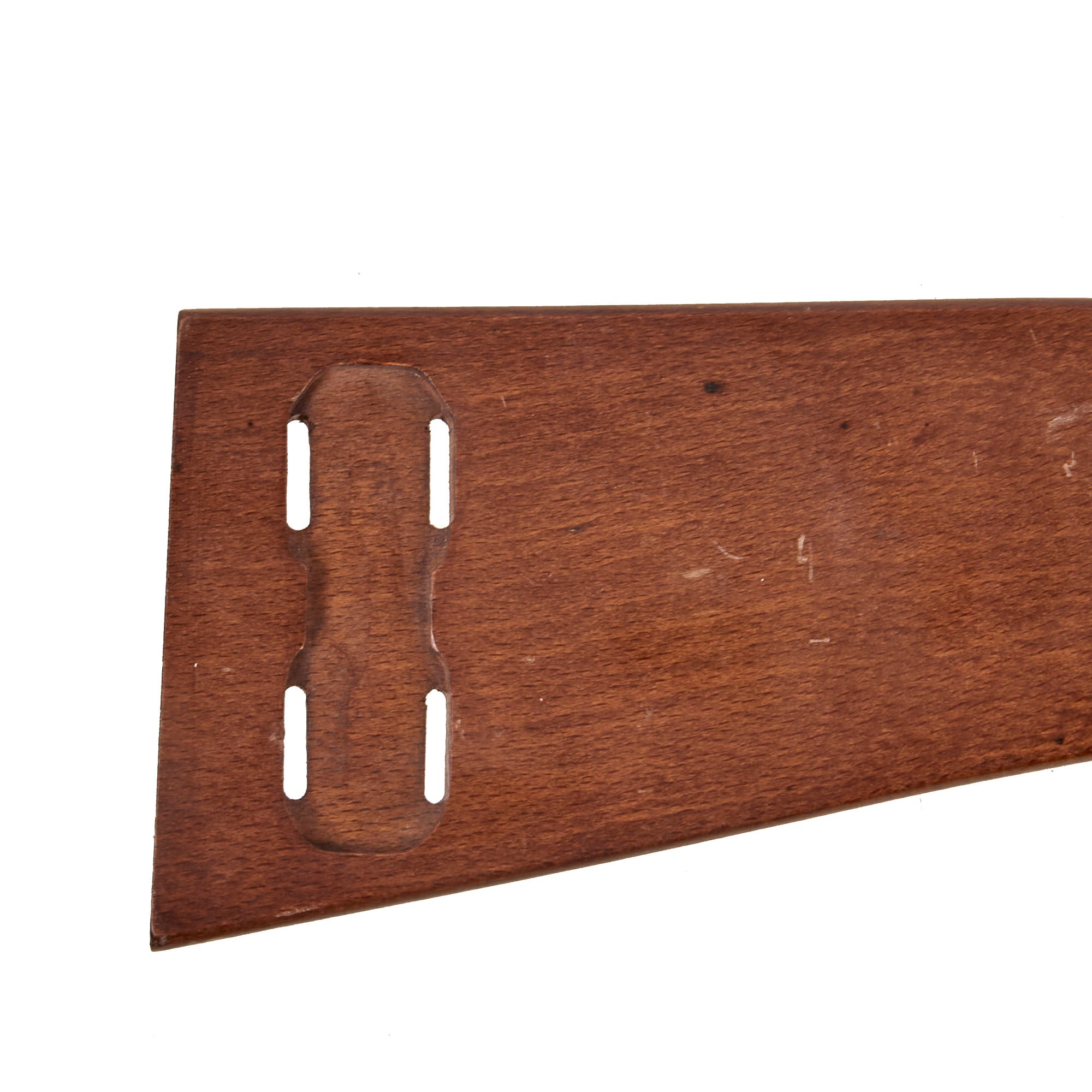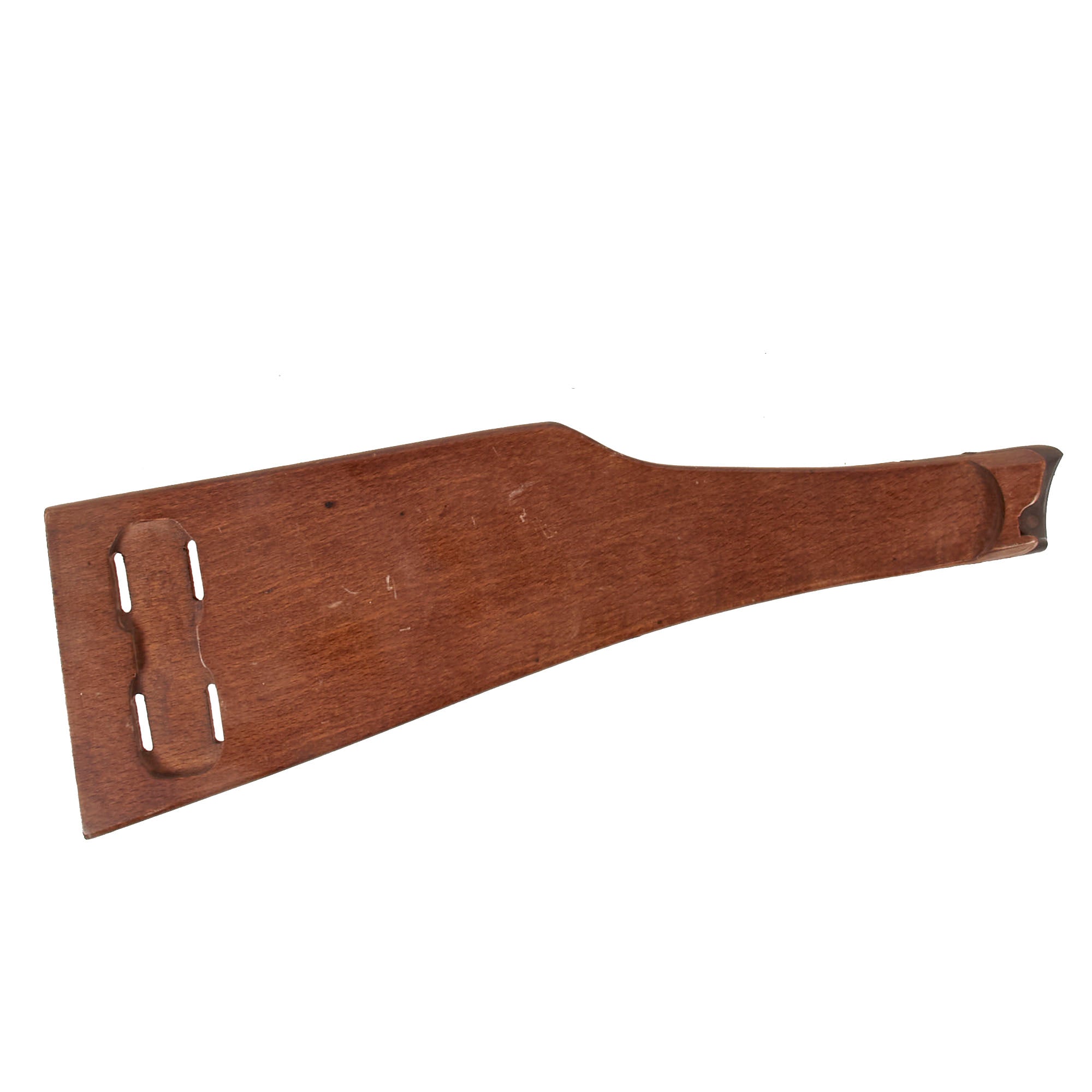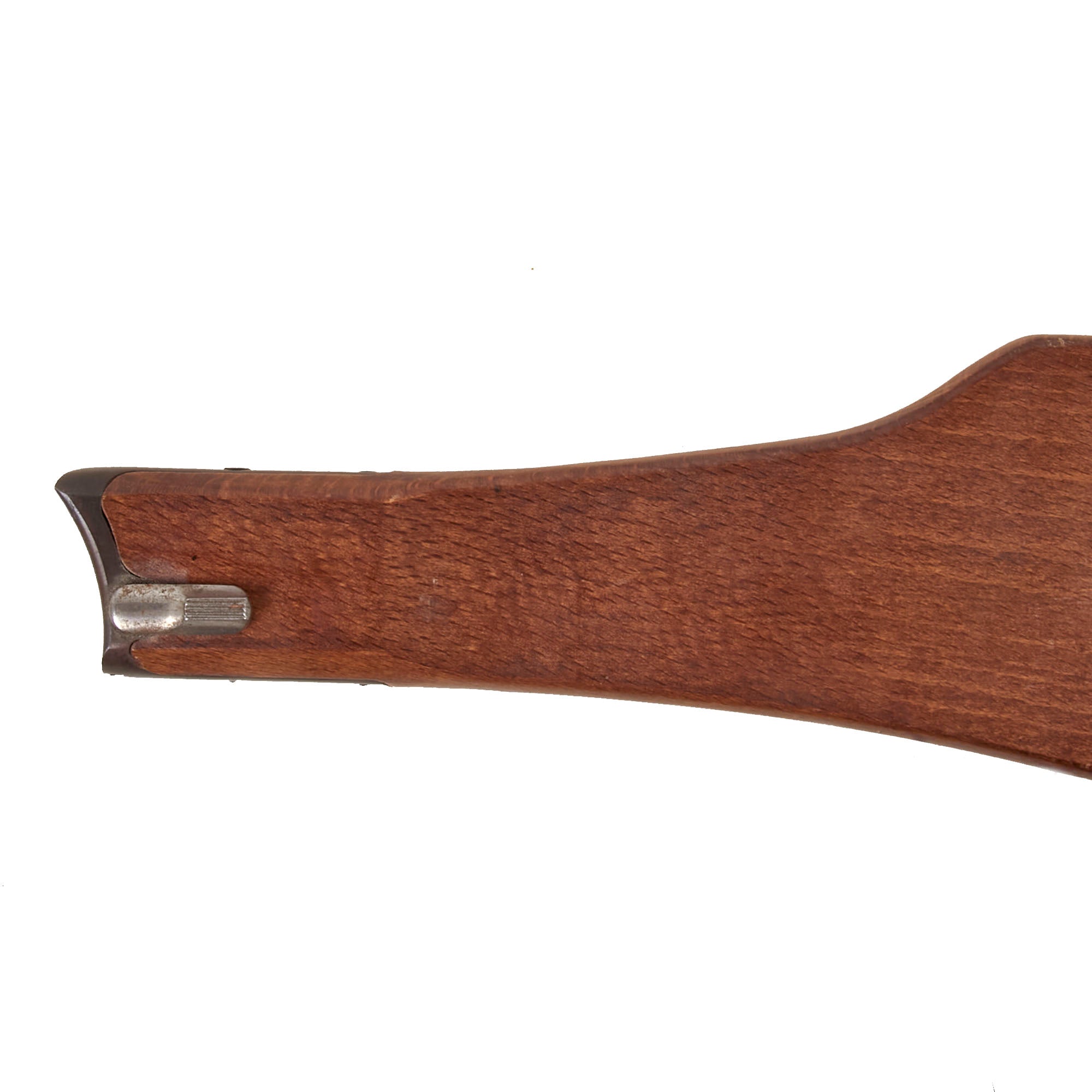 Early Reproduction Item: This is a lovely early reproduction wood stock for the Luger Lange Pistole 08, usually referred to as the "Artillery Luger." The stock likely dates to the 1950s/1960s. This P08 variation was equipped with a 200 mm (7.9 in) barrel, an 8-position tangent rear sight (calibrated to 800 meters (870 yd)) and a board-type shoulder stock with an attached leather holster. In the event of close combat, the pistol was intended to be used as a carbine with the shoulder stock attached to a lug mounted on the heel of the pistol frame. When set for long range use the rear sight element visibly moves to the left to compensate for spin drift. While initially intended for use by German artillery units who could not be encumbered by the long and heavy K.98 rifle, the LP 08 was also used by Aviation units (prior to equipping aircraft with machine guns) as well as the Infantry, primarily on the Western front during World War I.