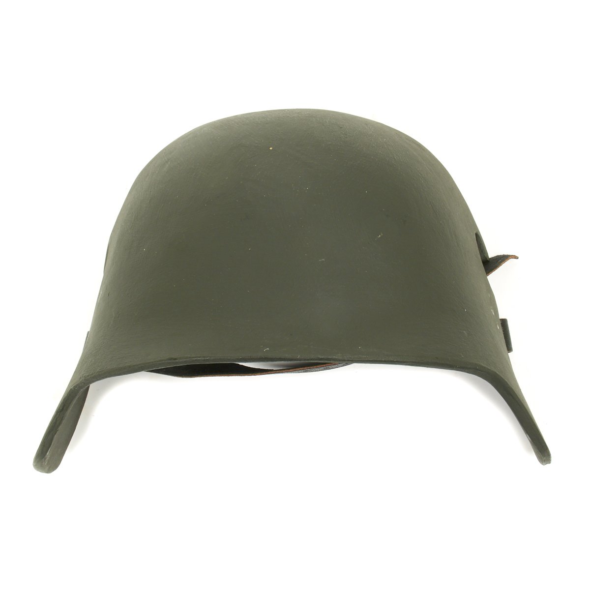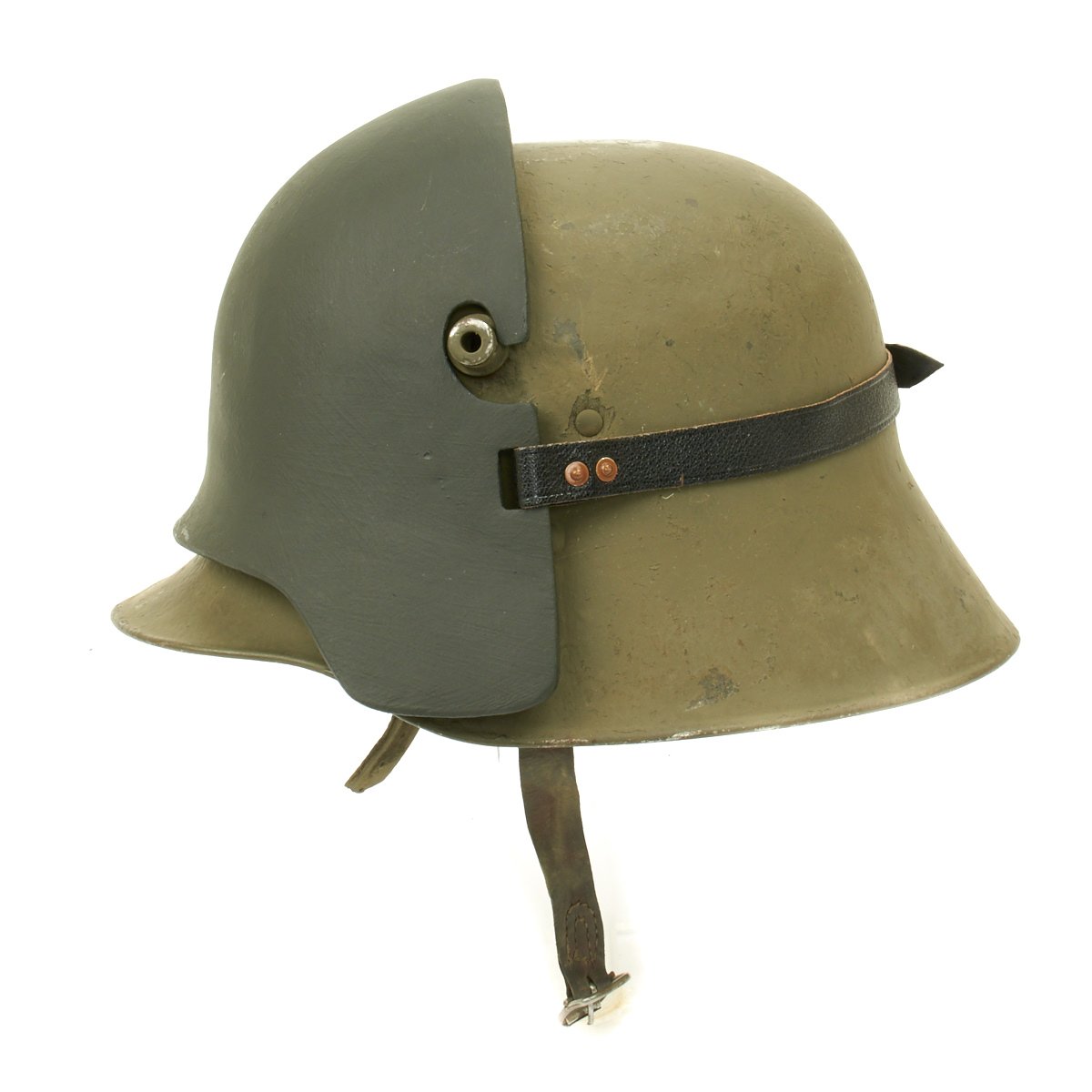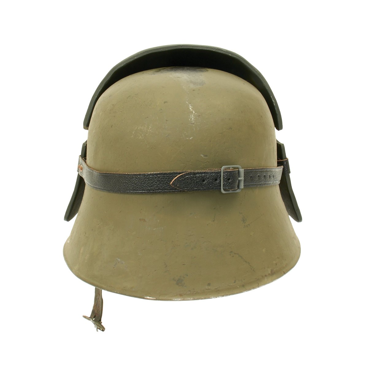 These are designed to hook onto the protruding vent lugs of the traditional Models M1916, M1917 and M1918 German helmets, they were secured with a leather strap and buckle to the rear of the helmet. The Ventilation lugs on smaller helmets were "stepped", so one size fits all.
