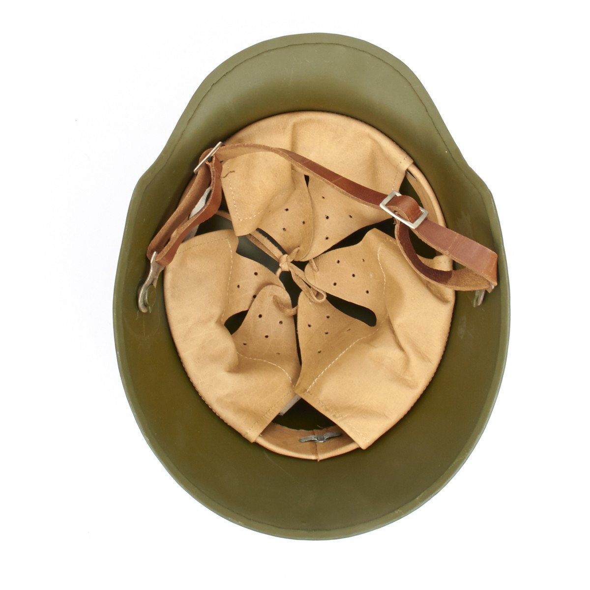 The shell is comprised of 1.8mm thick steel with rolled edge making this one of the most hefty and historically accurate M16's on the market today. It also has all the signature features including an early model genuine leather three tongue padded liner, correct leather liner helmet band, pickelhaulbe type thick leather adjustable chin strap with securing rings on the inside of the helmet bowl. Many helmets with this type of chin strap were later converted to the M17 or M18 standard, as the chin strap was prone to falling off. Later liner-mounted chin straps were far more secure, which is why the original configuration is rarely seen. The chinstrap on these helmets may require fitting and/or adjustment to properly grip the mounting lugs. This M16 also has the required ventilation horns also used for mounting a stirnpanzer sniper brow plate.