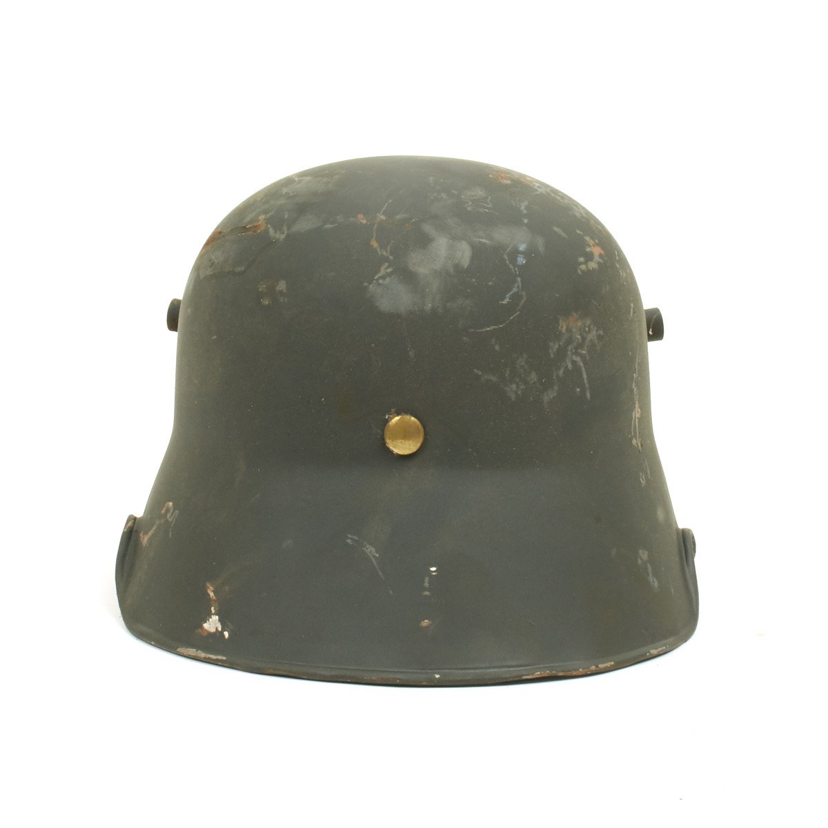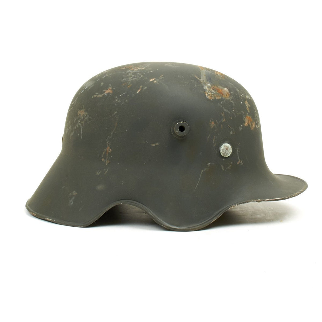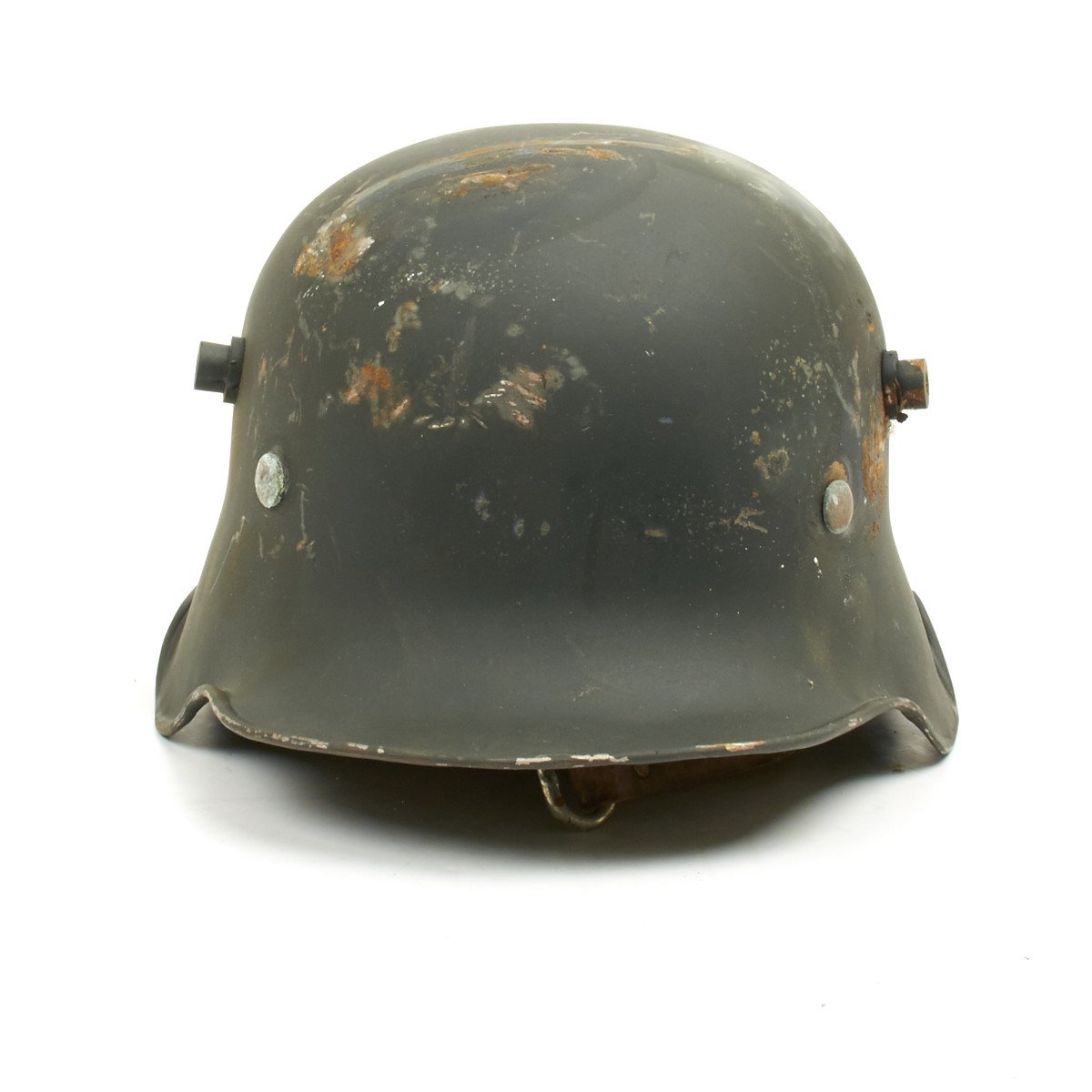 Officially designated the M-1918 German Helmet this extremely rare model with ear cutouts most probably to facilitate the use of trench telephones and/or better hearing has long been referred to as the Cavalry Helmet. Complete with full leather liner and chinstrap, this is a new made example of an extremely rare and high profile German WWI steel helmet.