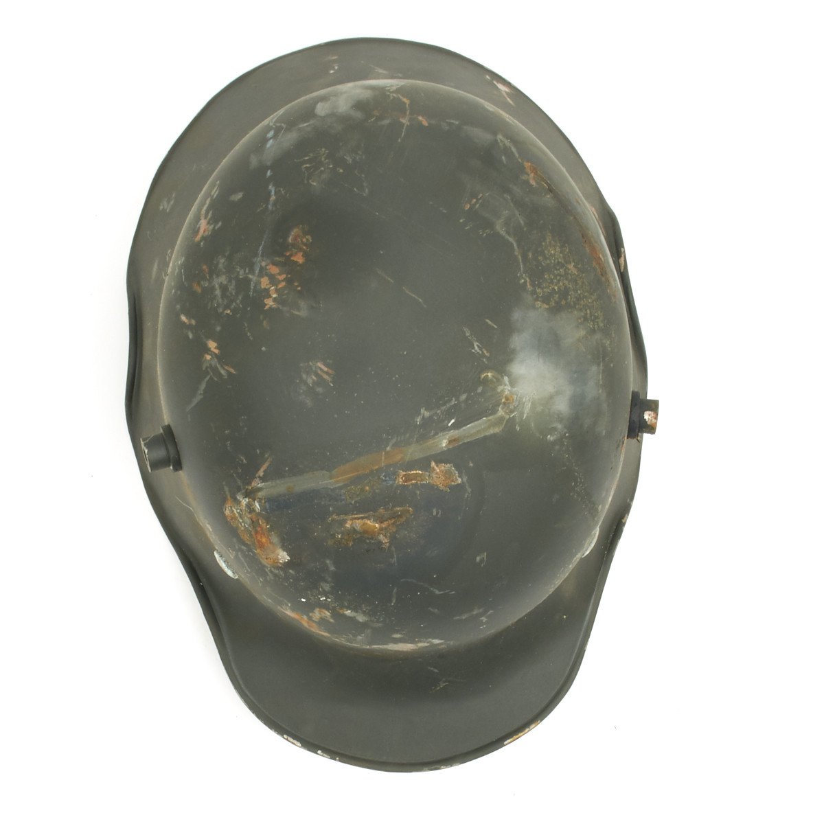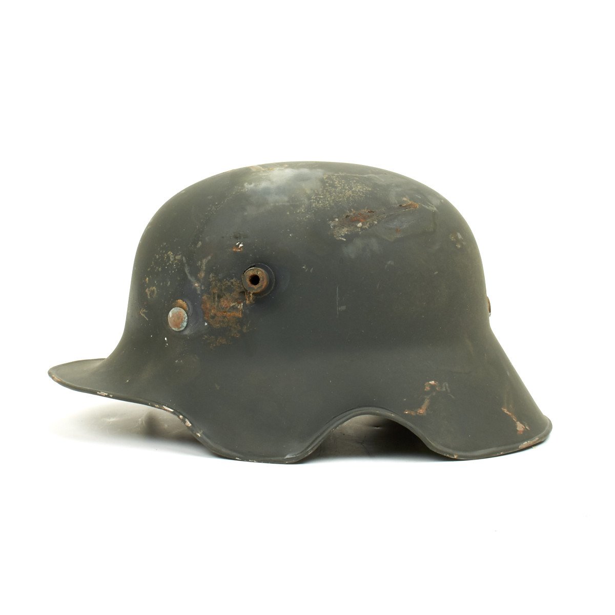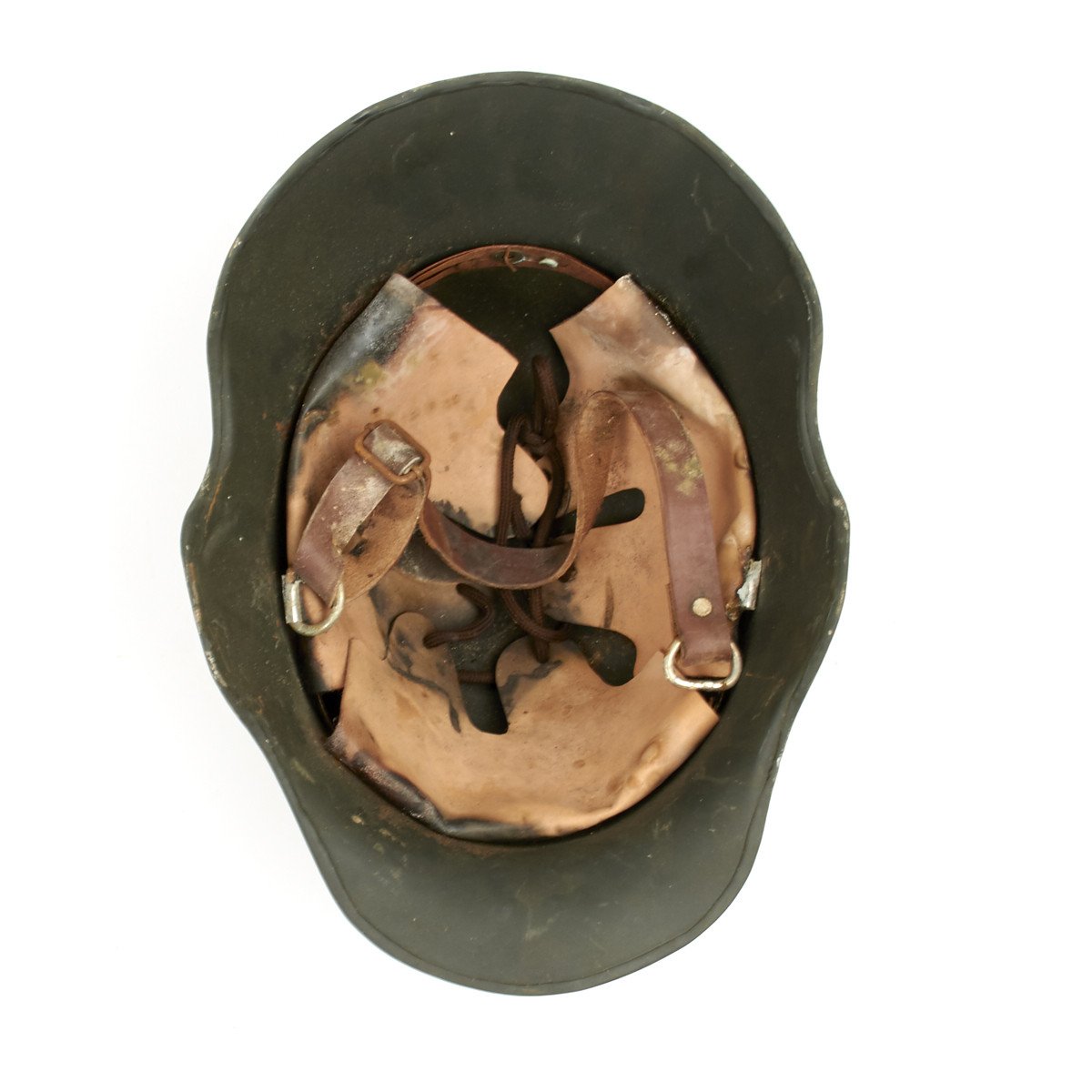 Officially designated the M-1918 German Helmet this extremely rare model with ear cutouts most probably to facilitate the use of trench telephones and/or better hearing has long been referred to as the Cavalry Helmet. Complete with full leather liner and chinstrap, this is a new made example of an extremely rare and high profile German WWI steel helmet.