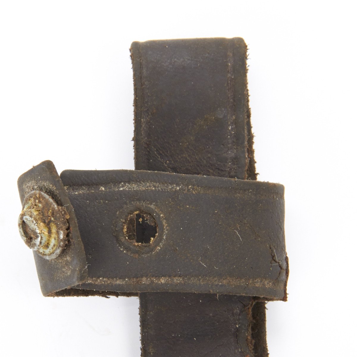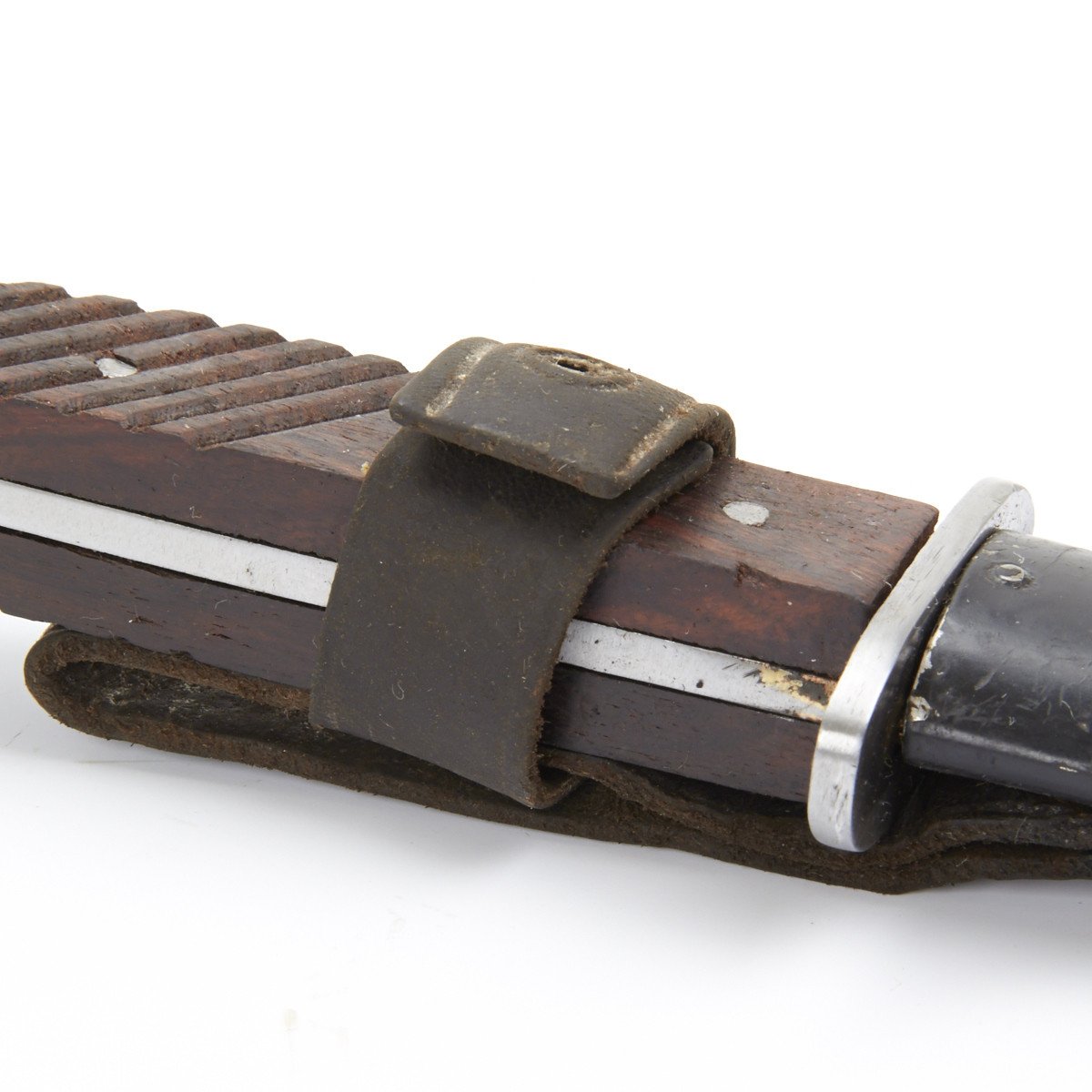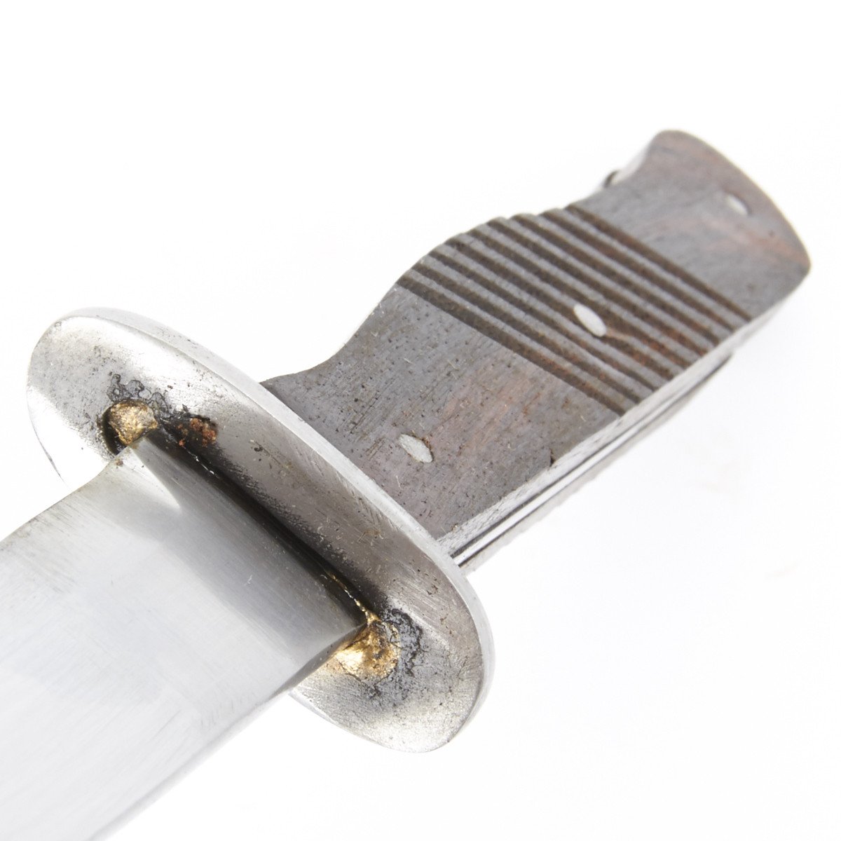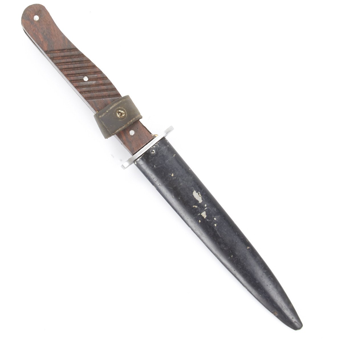 These original blued steel Scabbards are in good condition but each leather suspension frog has suffered from almost 100 years of wear and abuse, now torn, tatty and incomplete. In WW2 these earlier Daggers were reissued, most often with a blued metal finish, in a custom boot scabbard without a frog but with a long spring for inserting into the top of a jackboot. IMA also offers a reproduction of this WW2 issue weapon. But, now we are able to offer the WW1 trench dagger, new made in the correct bright finish together with an Original WW1 trench knife scabbard.