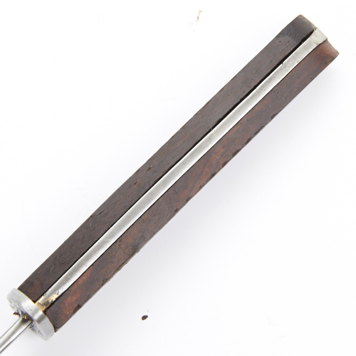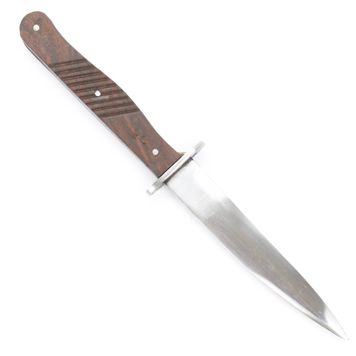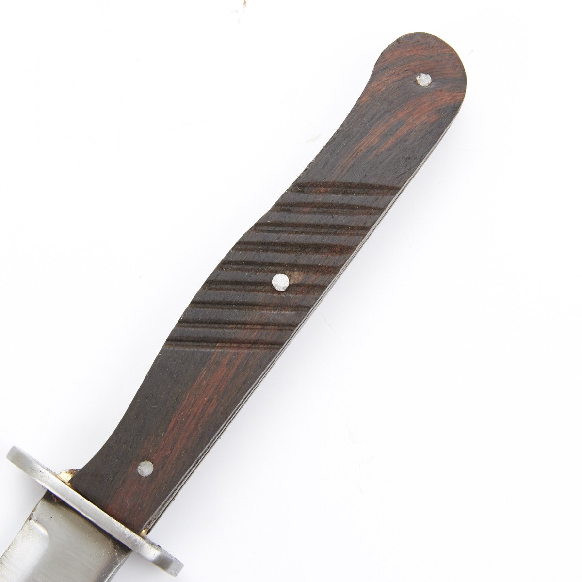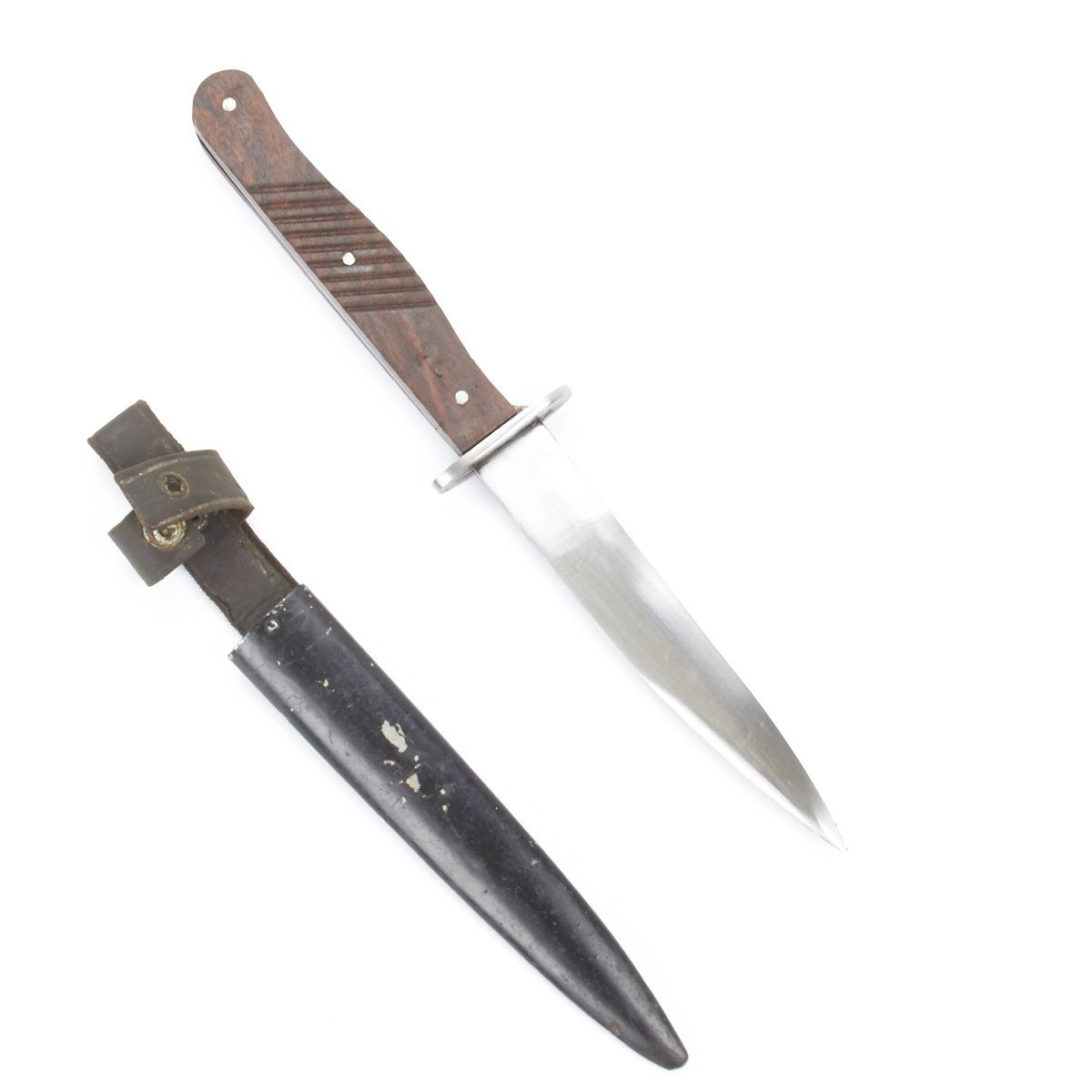 These original blued steel Scabbards are in good condition but each leather suspension frog has suffered from almost 100 years of wear and abuse, now torn, tatty and incomplete. In WW2 these earlier Daggers were reissued, most often with a blued metal finish, in a custom boot scabbard without a frog but with a long spring for inserting into the top of a jackboot. IMA also offers a reproduction of this WW2 issue weapon. But, now we are able to offer the WW1 trench dagger, new made in the correct bright finish together with an Original WW1 trench knife scabbard.