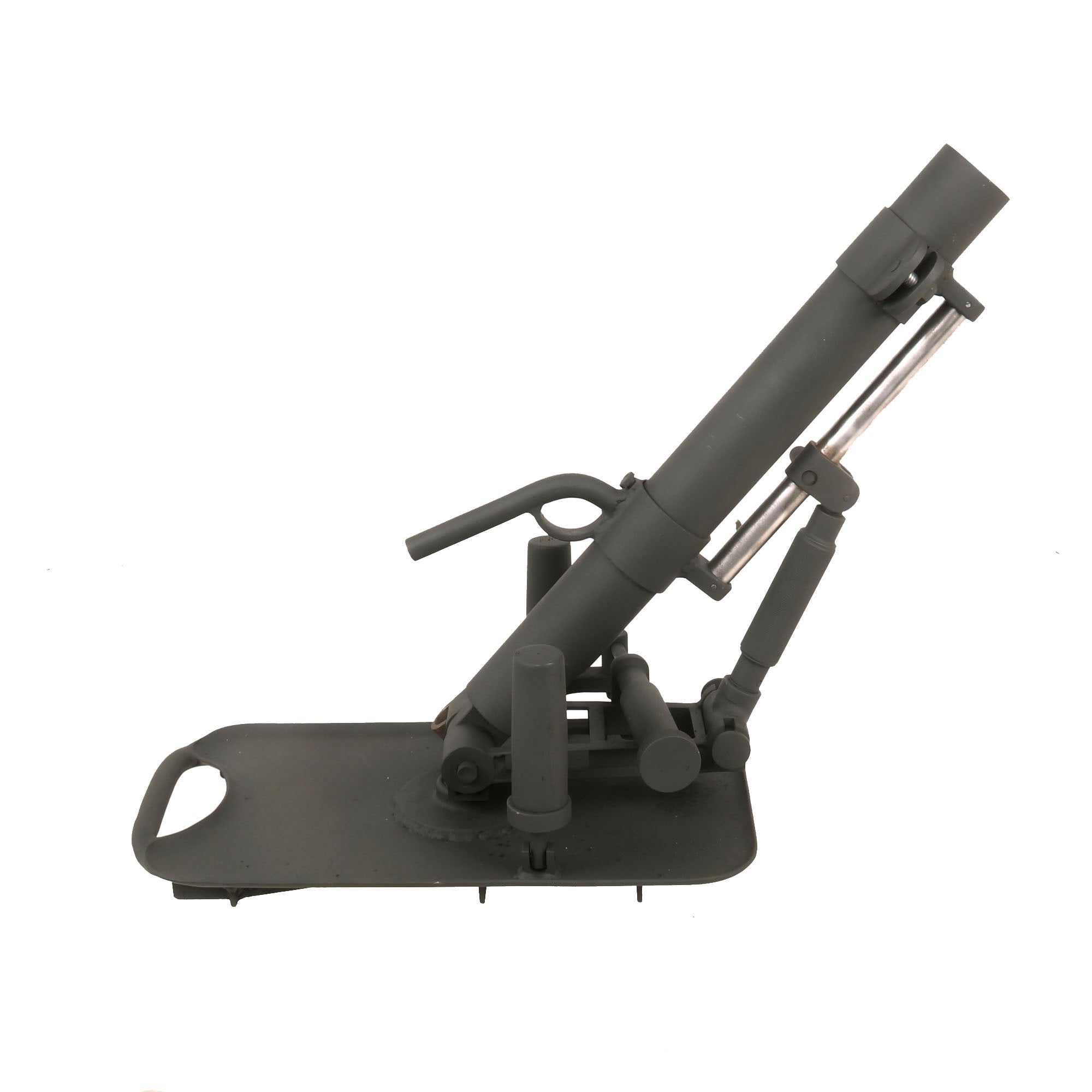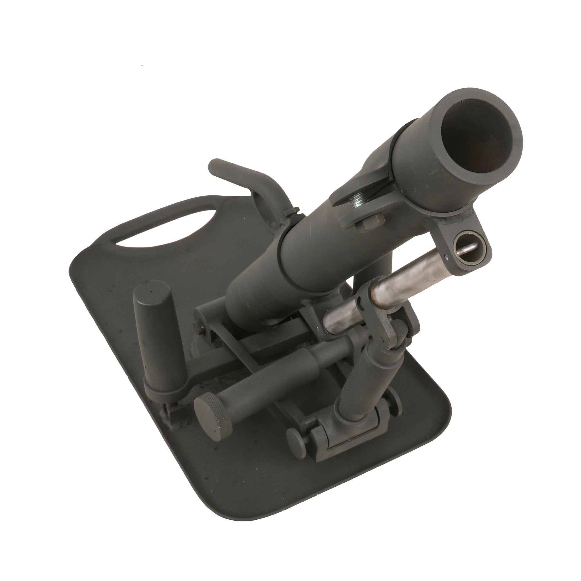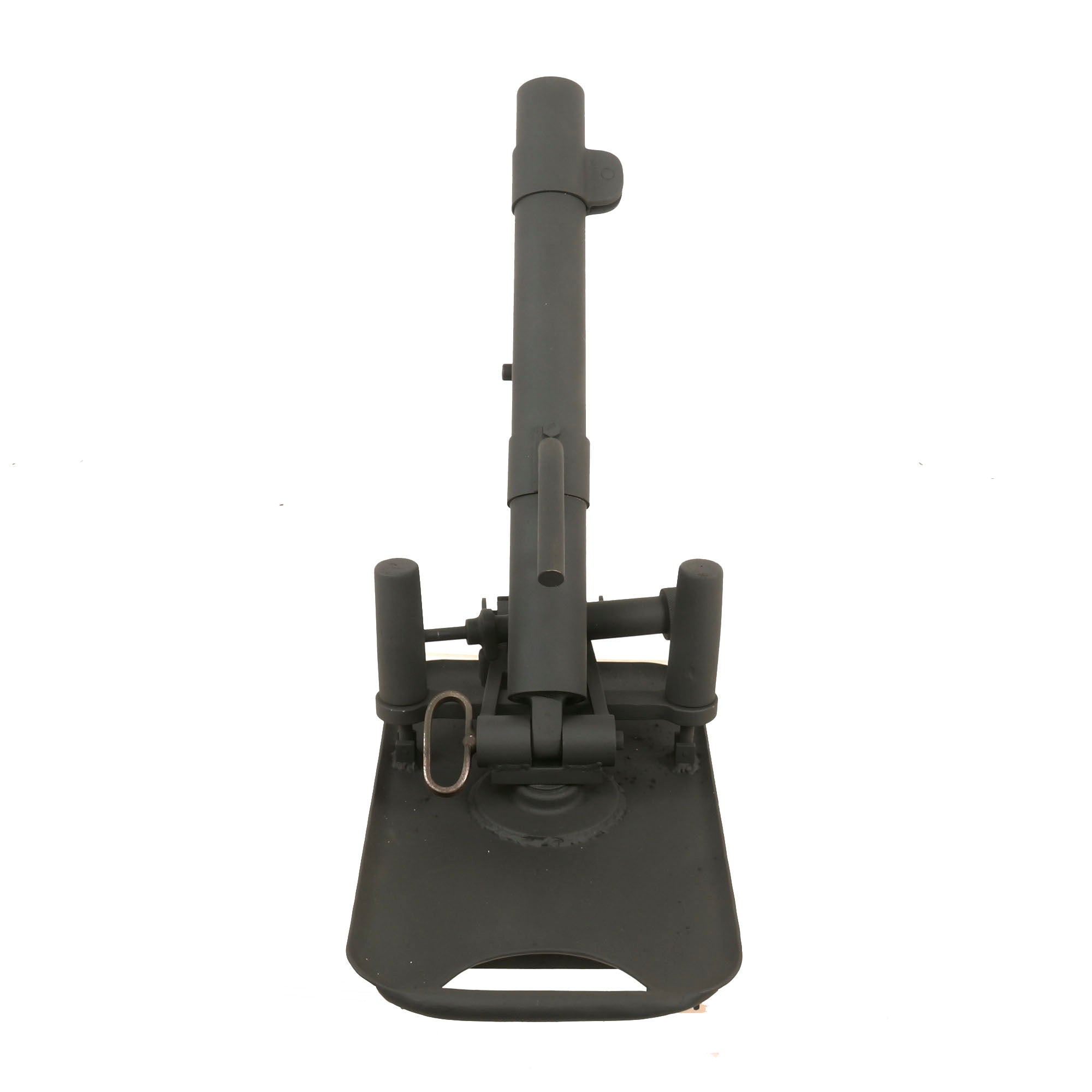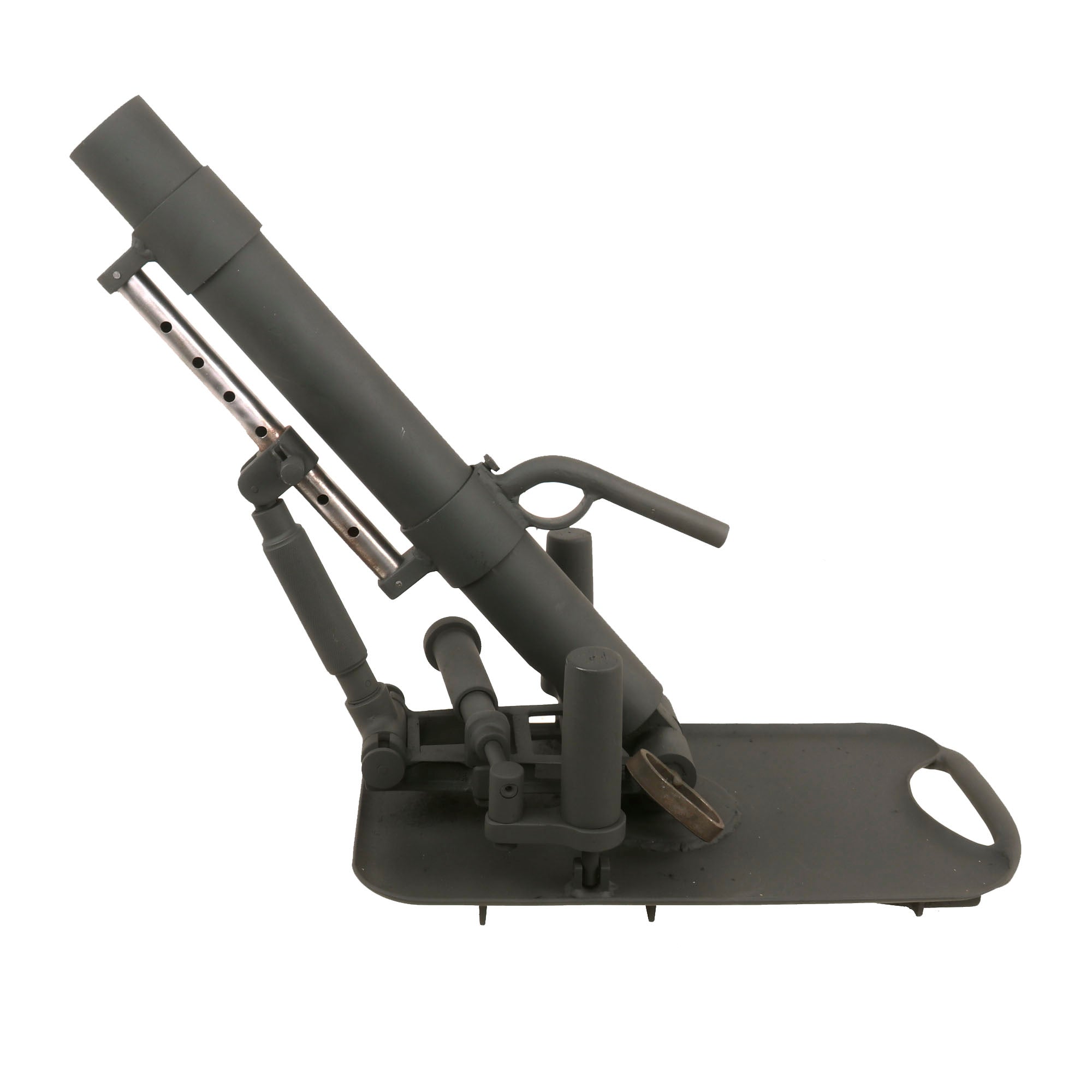 German 5cm Leichter Granatwerfer 36 Mortars are EXTREMELY scarce on the collector's market, and we have only ever had one or two in the past. Given their rarity, someone elected to make this fantastic 1:1 scale fabricated steel replica, which is extremely well executed. It looks to be made mostly of steel, constructed around a 3.8cm completely inert steel tube. The replica mortar even has functional traverse and elevation controls, and the squeeze buttons at the bottom of the elevation support even push in, allowing the display mortar to be folded up as an original. The pin going through the base of the tube can also be removed, allowing the tube to be detached from the base. This must have taken a very long amount of time to construct!