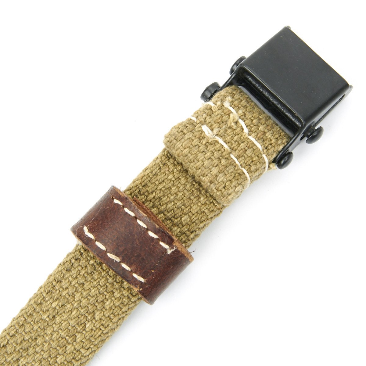 New Made Item: This is a top quality Mauser K98k heavy cotton web leather rifle sling with leather fittings. Our stunning reproduction is correctly weaved complete with steel buckle and keeper. These were the type issued to Rommel's Afrika Korps and are marked with German WW2 Makers code, date, and waffenamt marking . Correct for all German WWII Rifles. Fabulous!