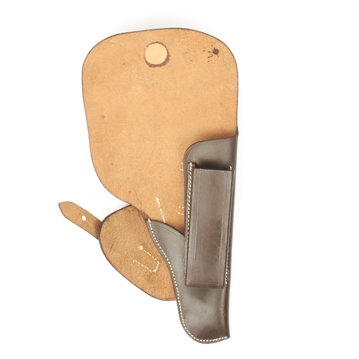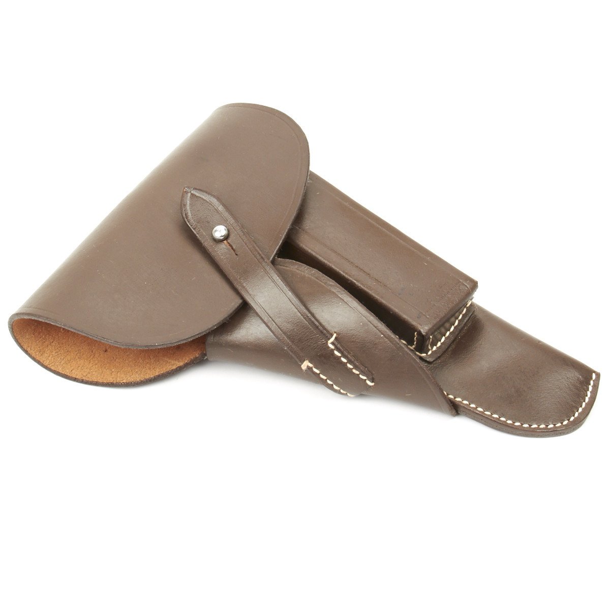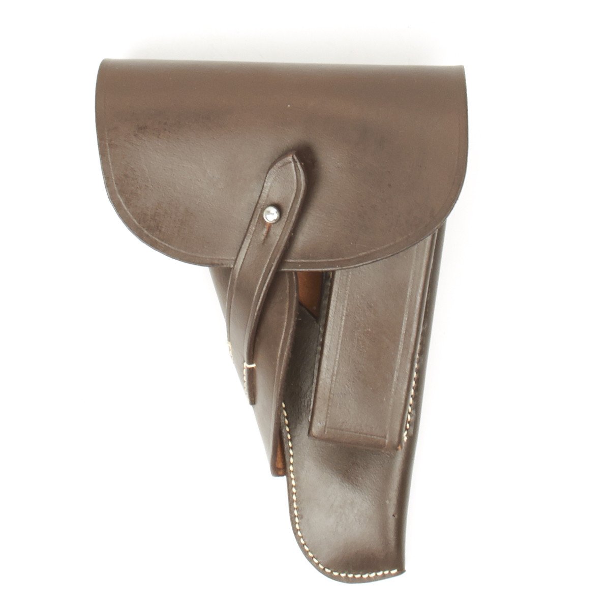 Now we have produced an exact replica of these NSDAP WWII High-Power holsters in deep chocolate brown leather complete with spare magazine pouch, belt loop, white stitching and replicated WWII period markings.
