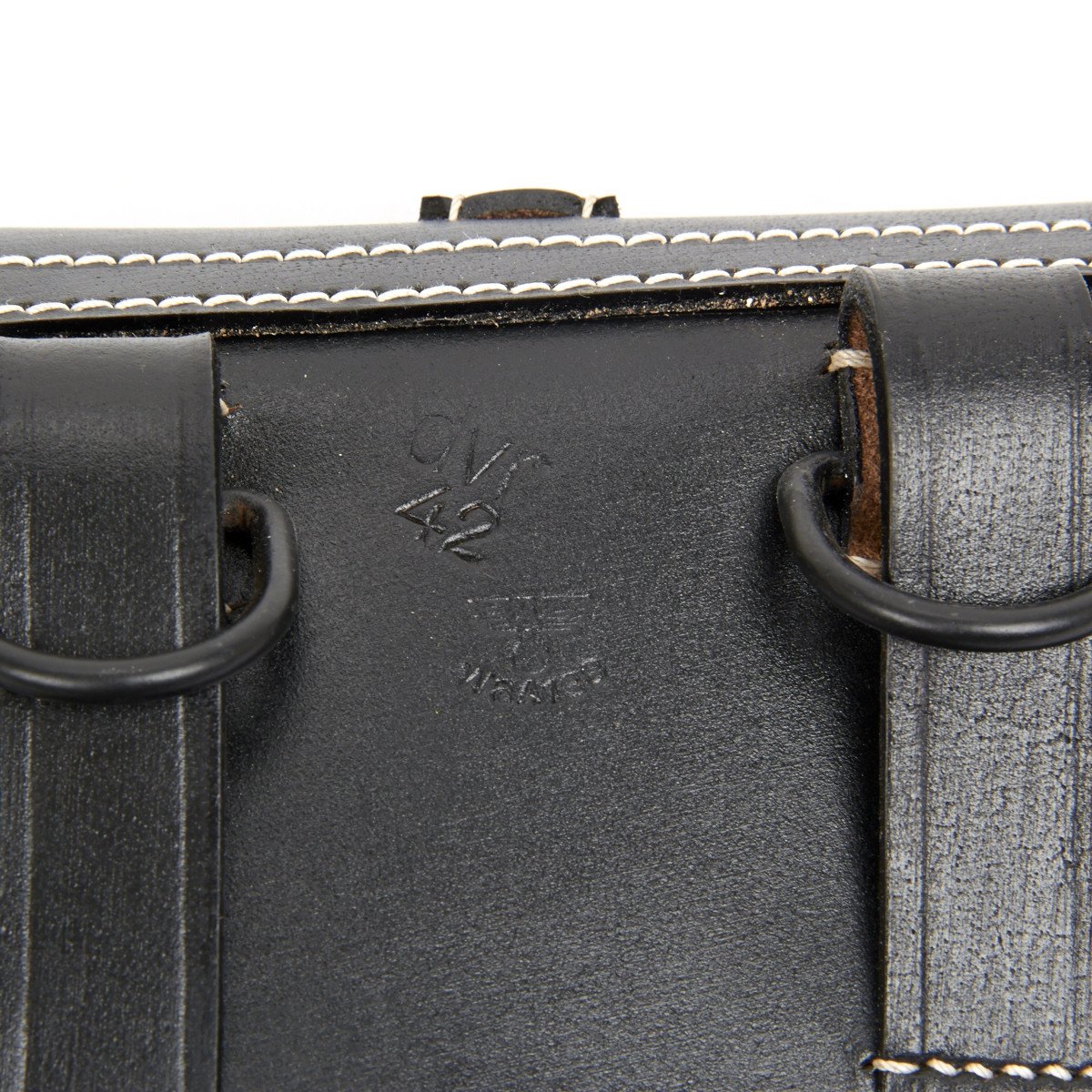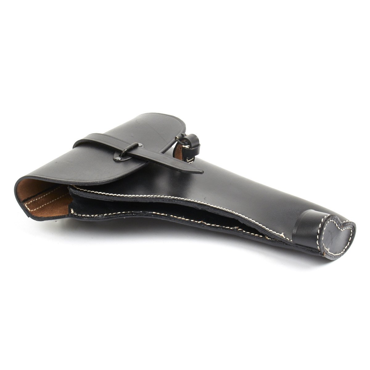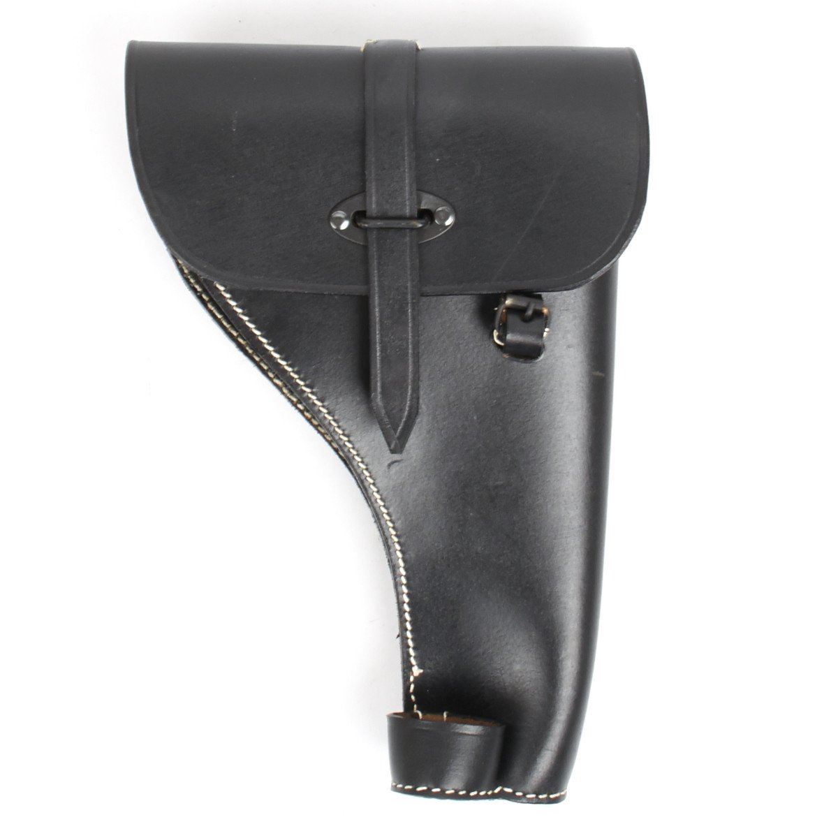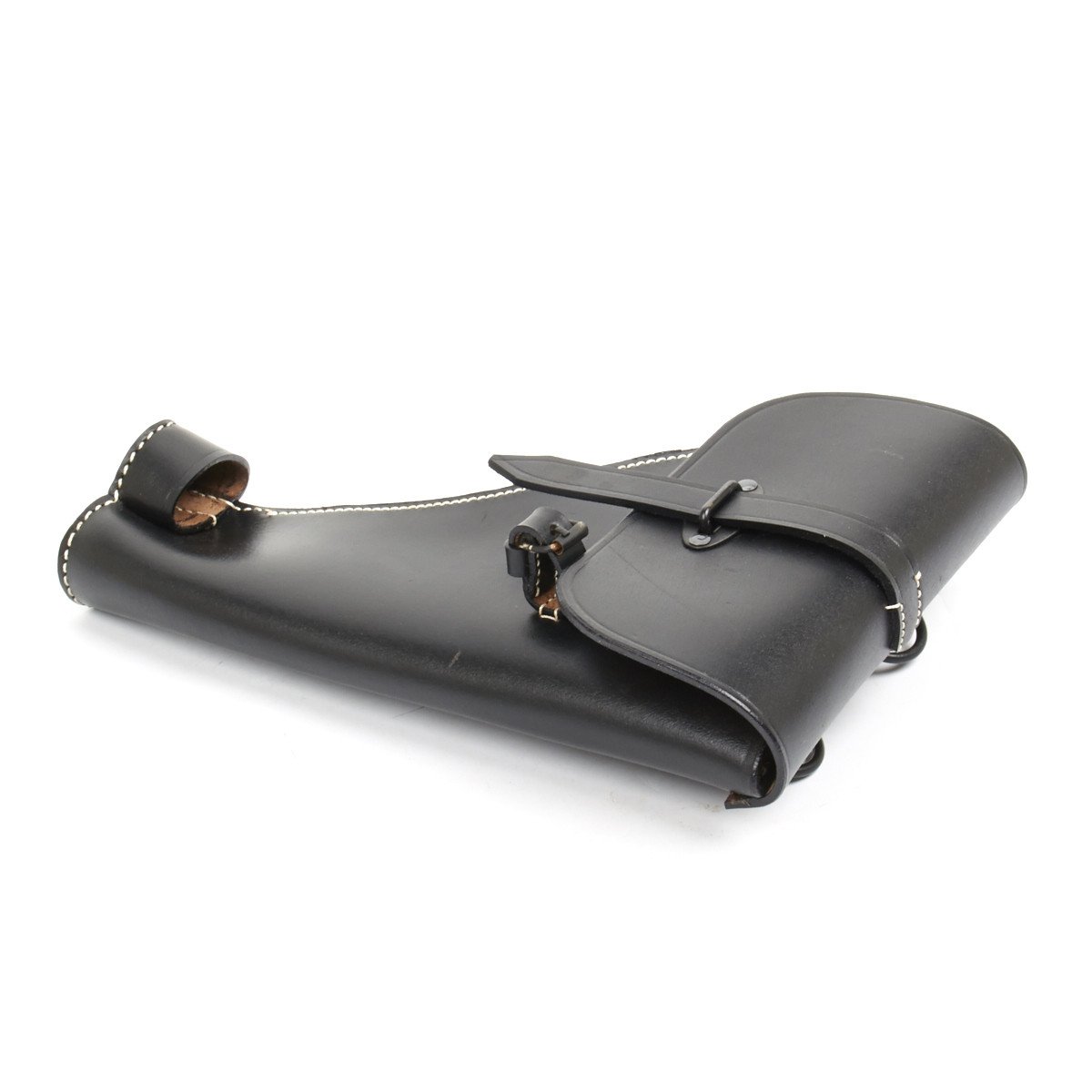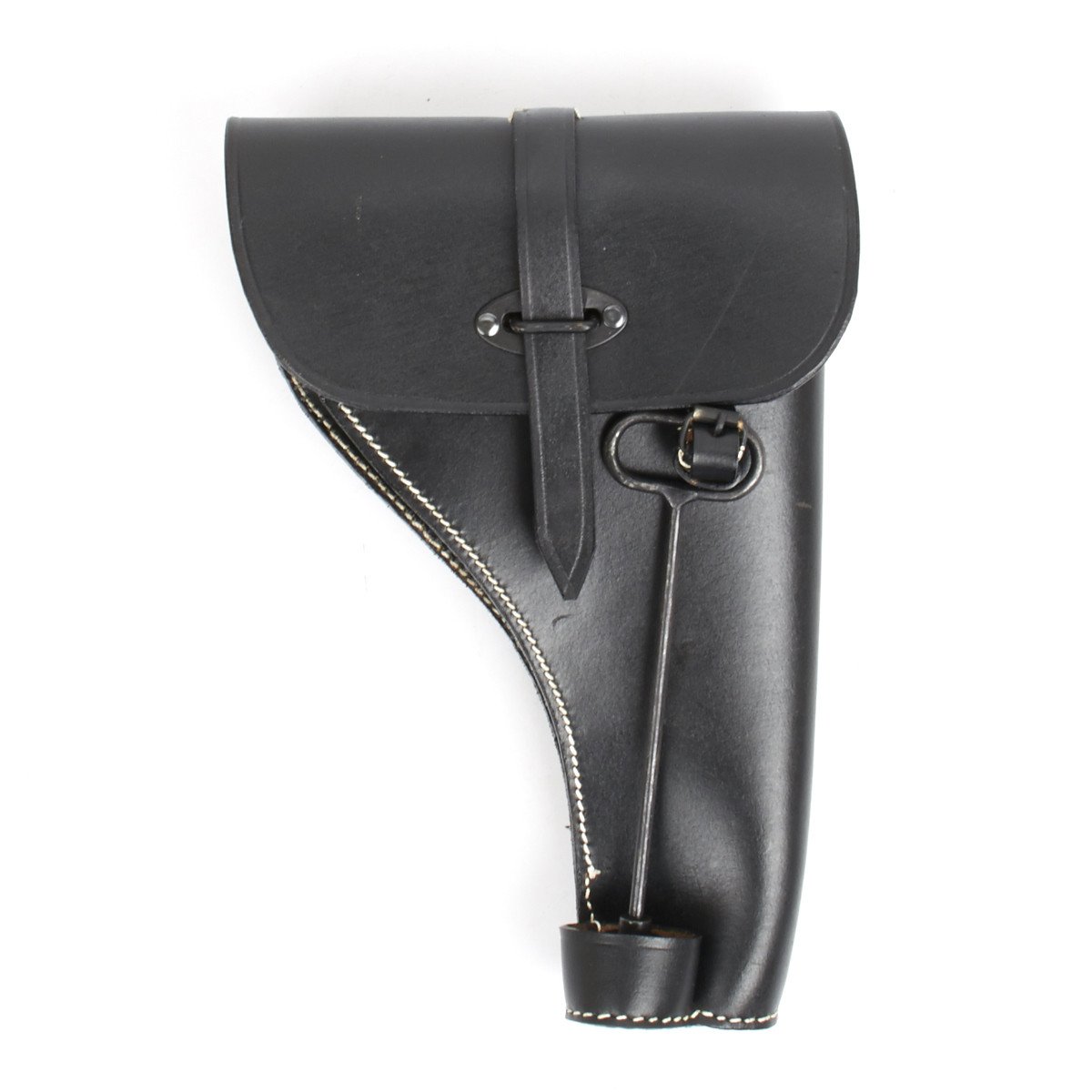 New Made Item: There were two basic models of Flare Pistol of German origin were used by German Forces in WW2: The first was a Model 28 introduced by Walther, firstly in Steel and by the mid 1930s in Aluminum. This was then followed by the Leuchpistole 42 which was also of aluminum construction. A standard all leather black holster was introduced for the Model 28 and was continued as it also accepted the Model 42. We have replicated these rare holsters, just as the originals, in quality black leather with white stitching. Each holster has two belt loops on the rear together with two D rings for use with a shoulder strap (not included). The holster flap closes over a Goalpost fixture through which a leather securing strap is located. Included on the front of the holster is the cleaning rod attachment buckle and cup into which a special cleaning rod can be held securely.