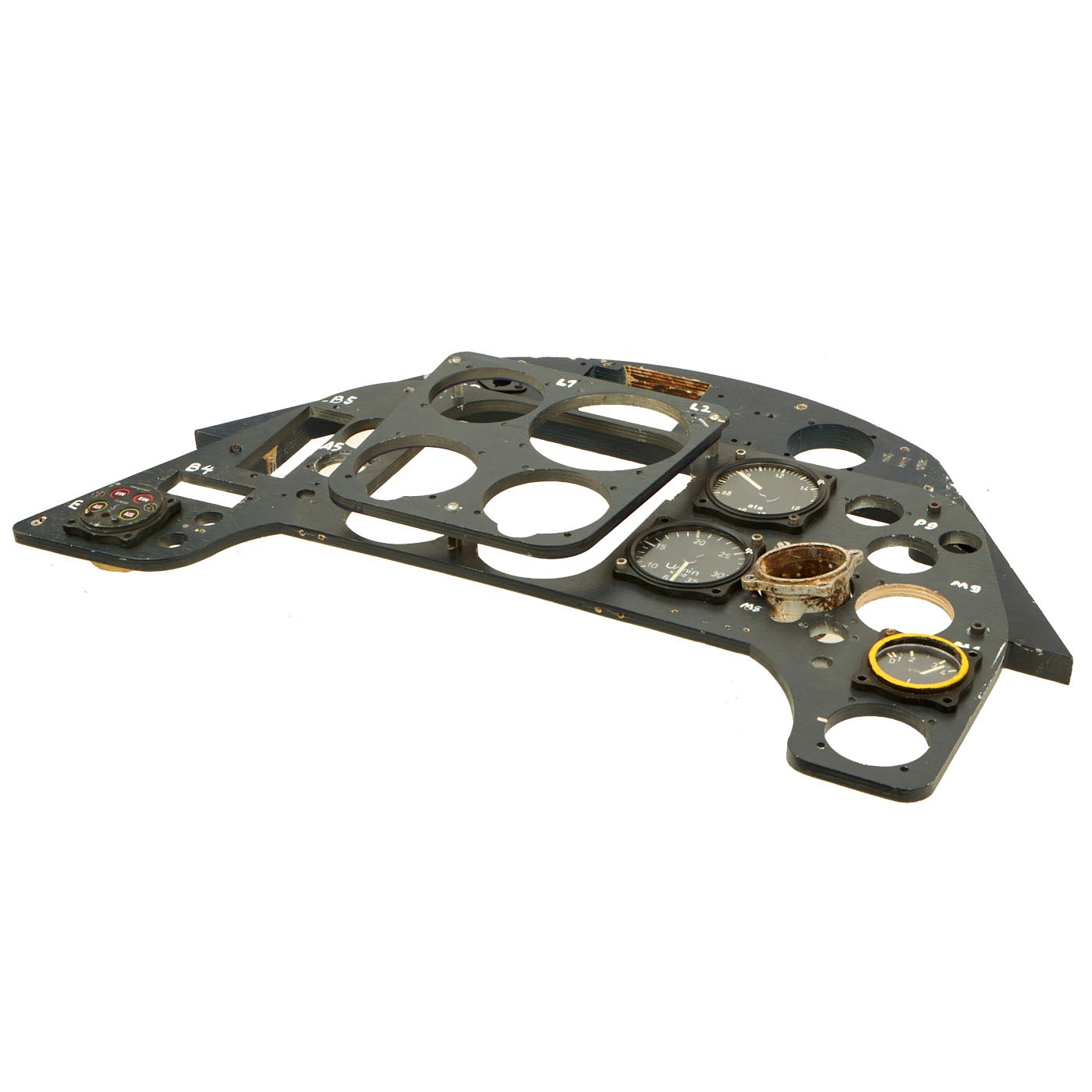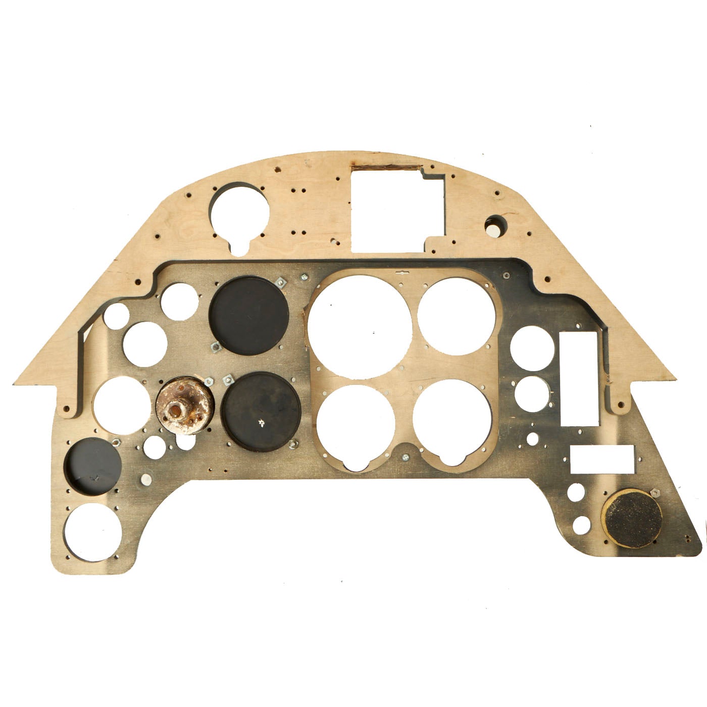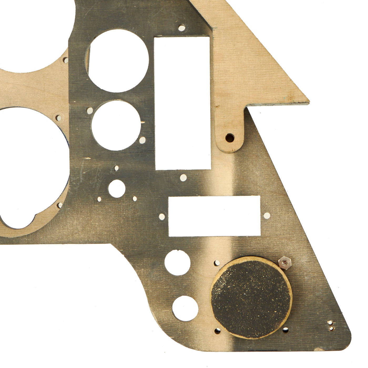 The panel comes with five instruments. One is cast in resin, which is the Undercarriage (Landing Gear) Indicator. The Manifold Pressure Gauge, Tachometer, and Fuel Gauge are exact copies of the original but are flat in shape and will illuminate under a black light, just as the originals did. The Pitch Gauge is an Original WWII relic housing without the face or internal mechanism. All other slots are made to fit original gauges, which can be located.