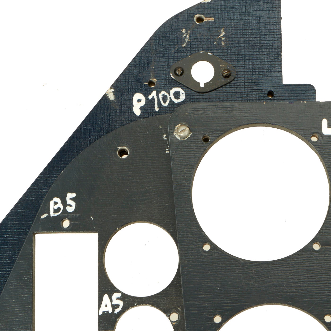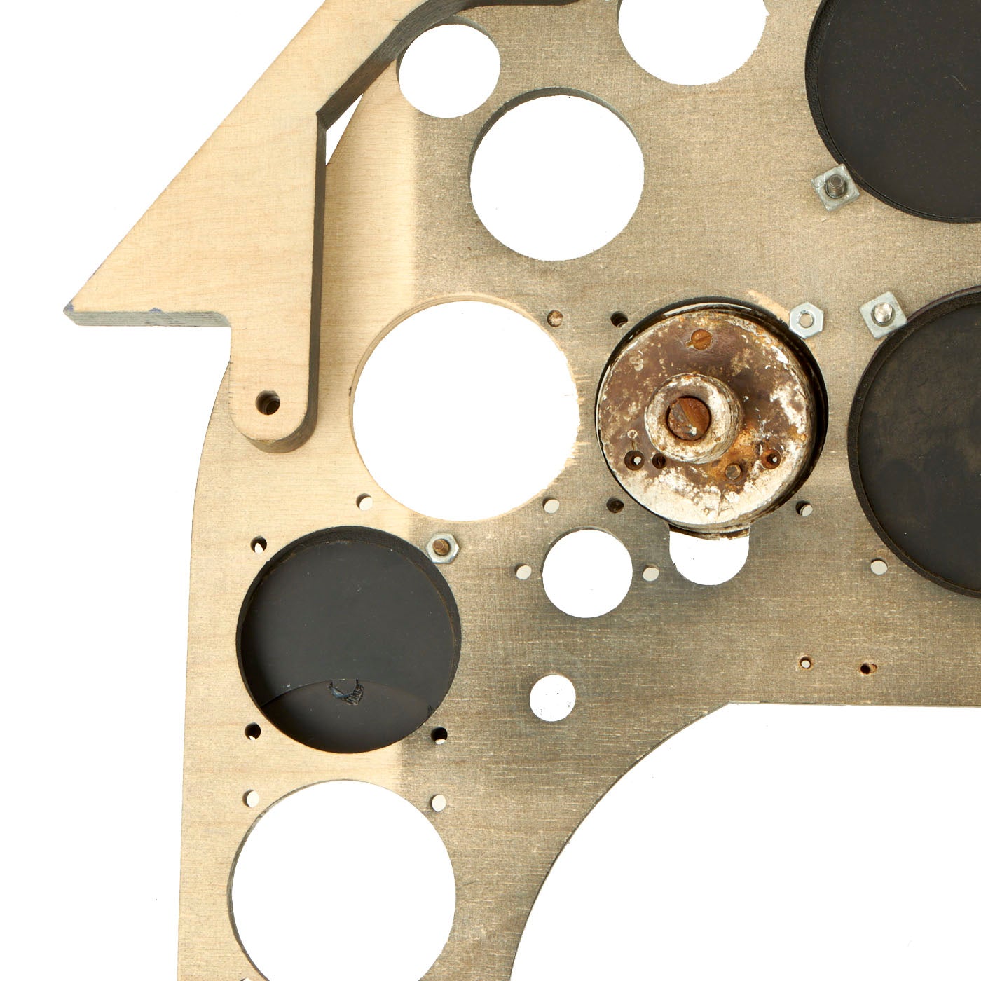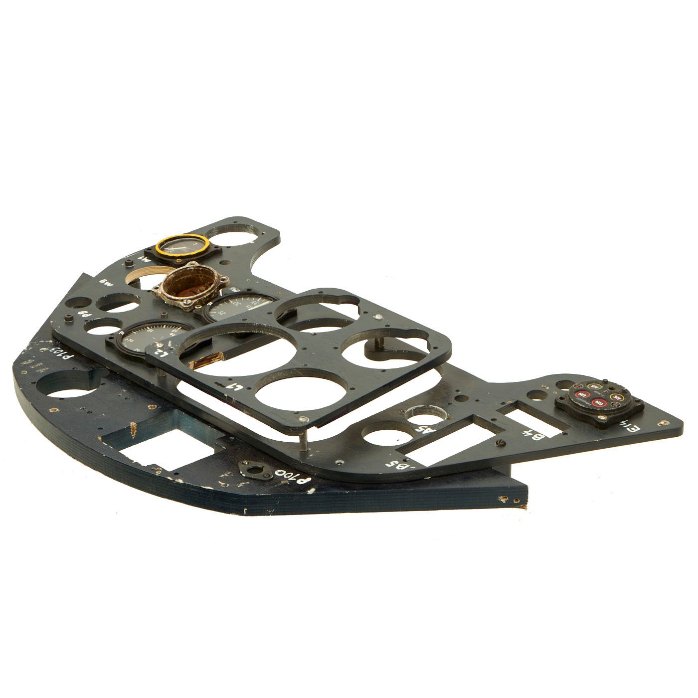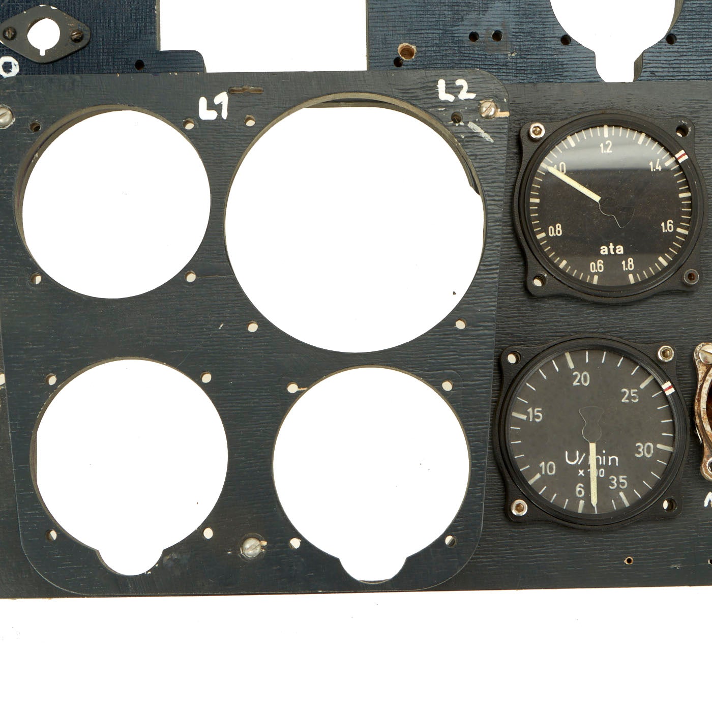The panel comes with five instruments. One is cast in resin, which is the Undercarriage (Landing Gear) Indicator. The Manifold Pressure Gauge, Tachometer, and Fuel Gauge are exact copies of the original but are flat in shape and will illuminate under a black light, just as the originals did. The Pitch Gauge is an Original WWII relic housing without the face or internal mechanism. All other slots are made to fit original gauges, which can be located.