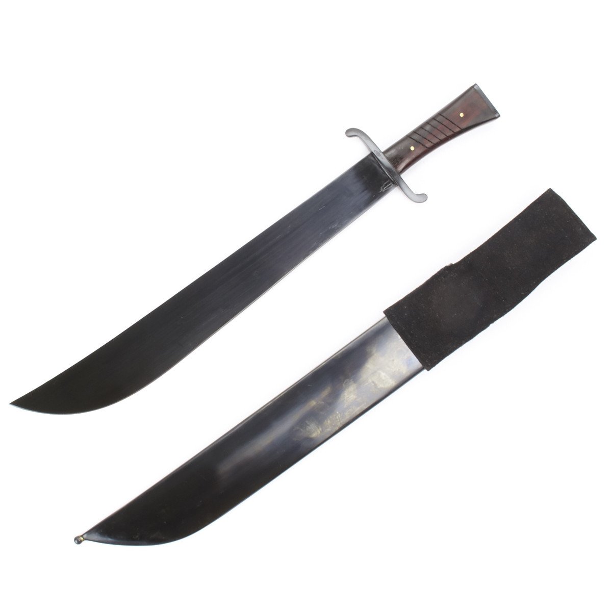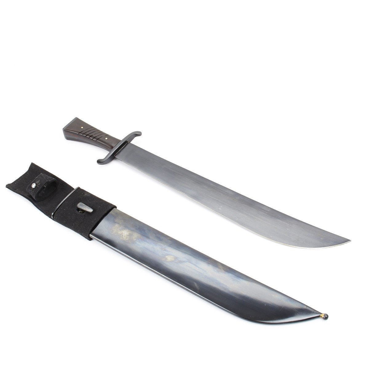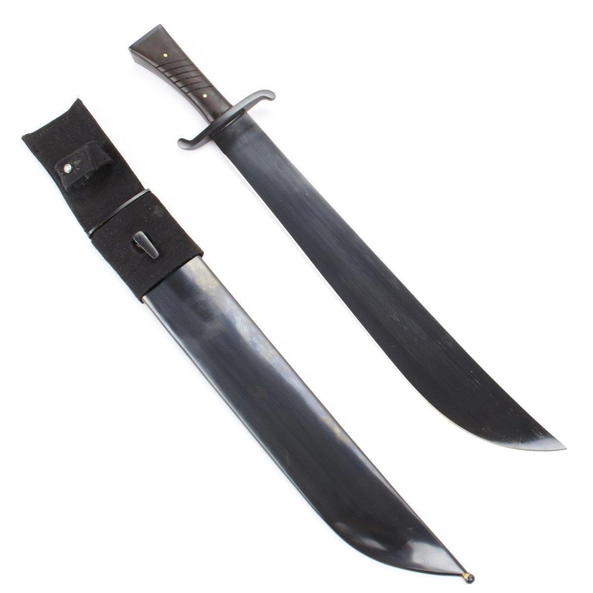 The 16-inch blade is made from 1095 high carbon steel, tempered in computer controlled kilns and honed to a RAZOR SHARP edge. Dark finished hardwood scales are pinned in place, in keeping with 1940's era construction. All metal, including Scabbard is deeply blued. Black canvas frog fits belts up to 2-3/4" wide.
