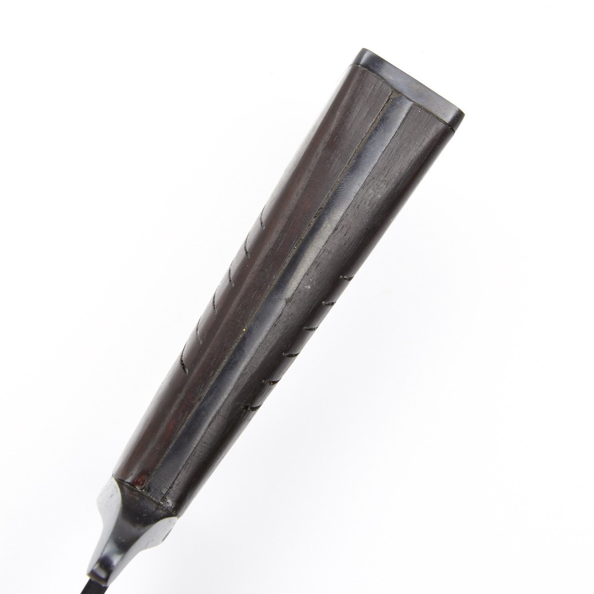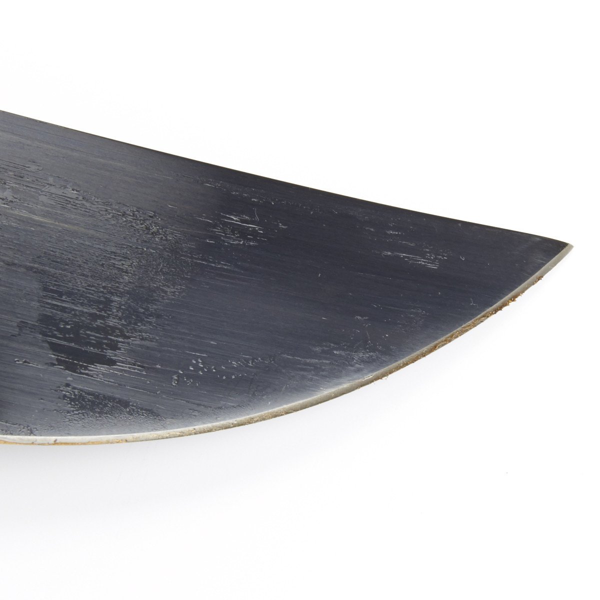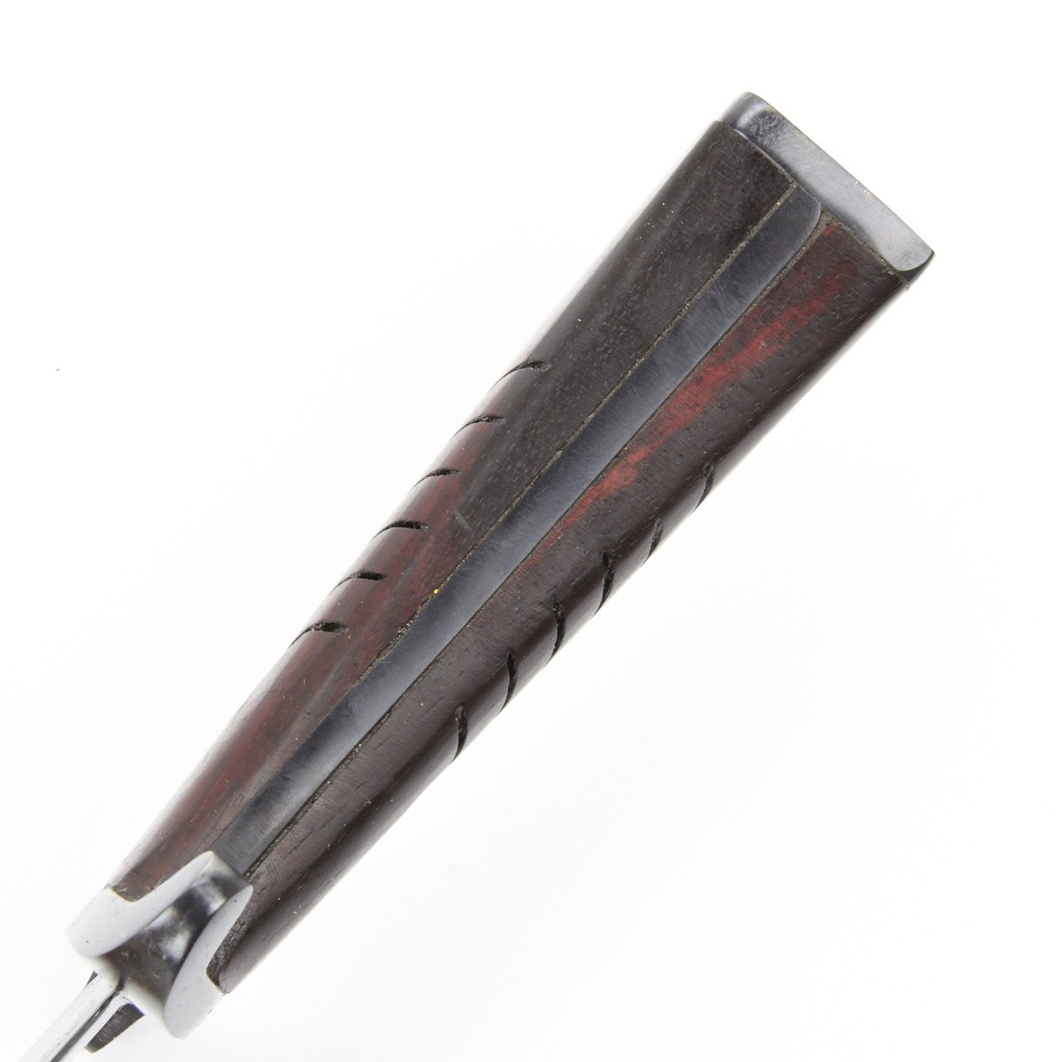 The 16-inch blade is made from 1095 high carbon steel, tempered in computer controlled kilns and honed to a RAZOR SHARP edge. Dark finished hardwood scales are pinned in place, in keeping with 1940's era construction. All metal, including Scabbard is deeply blued. Black canvas frog fits belts up to 2-3/4" wide.
