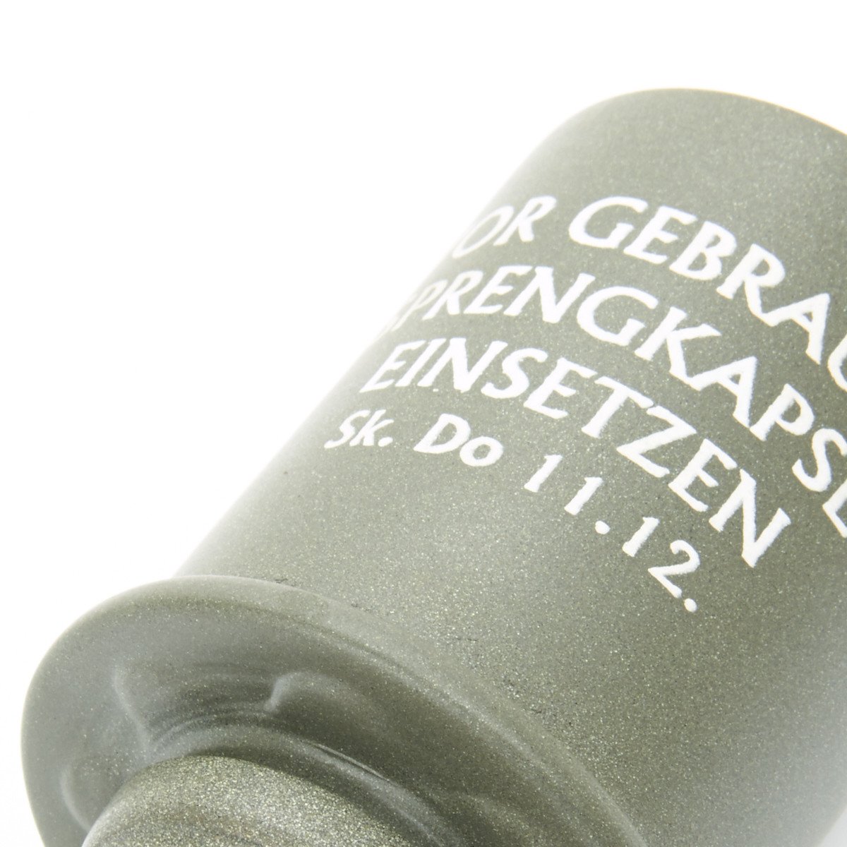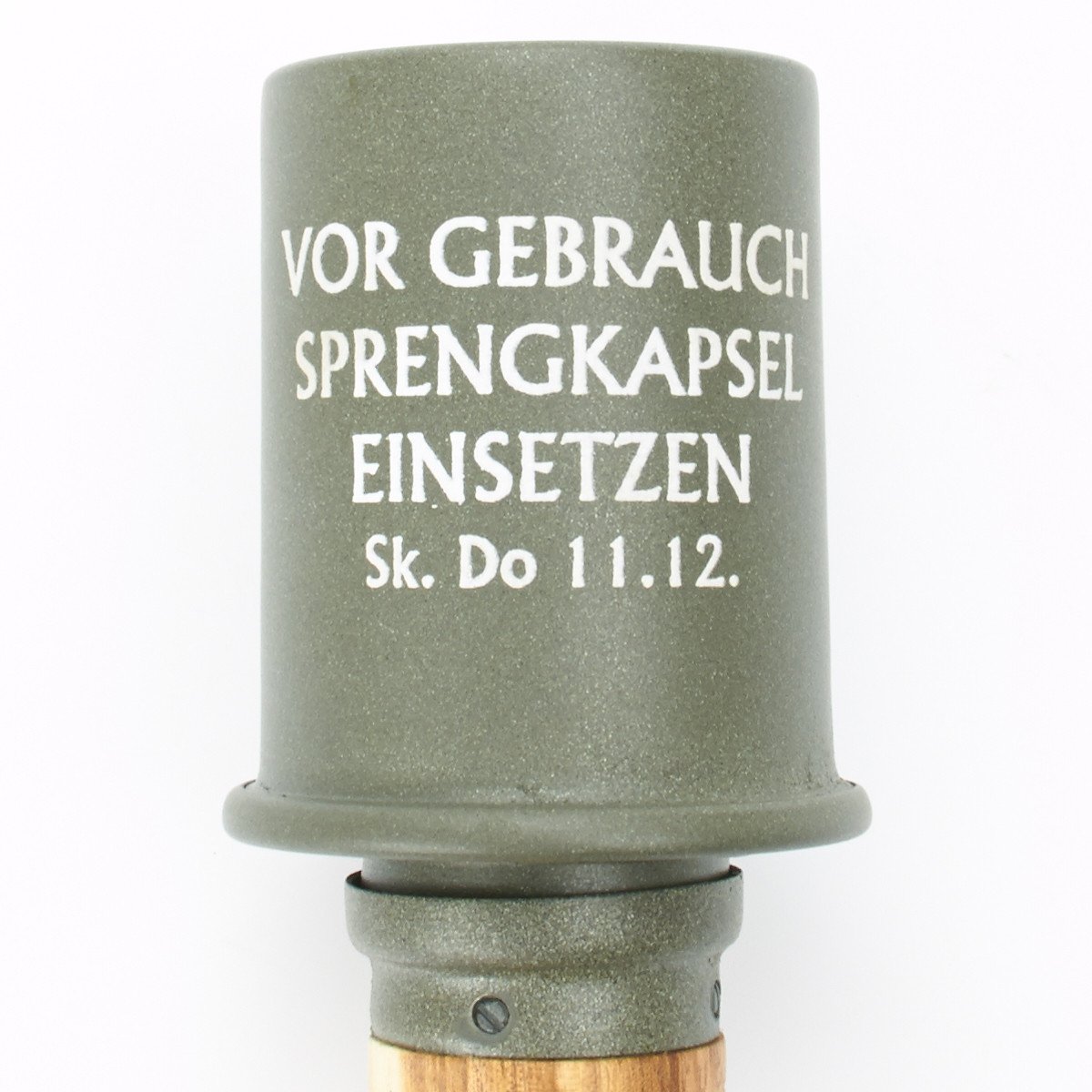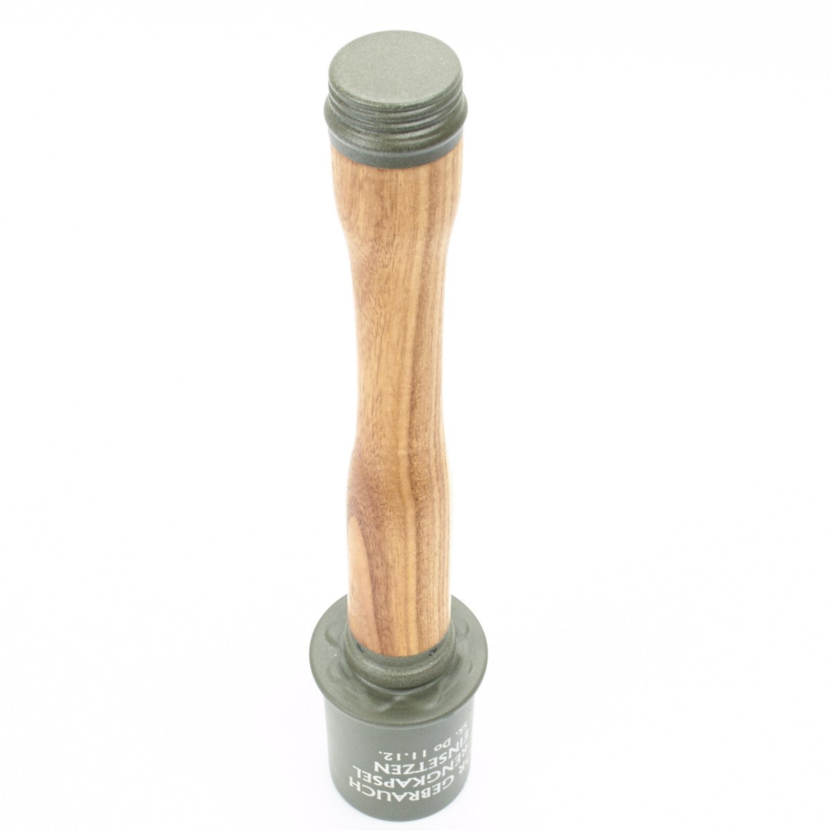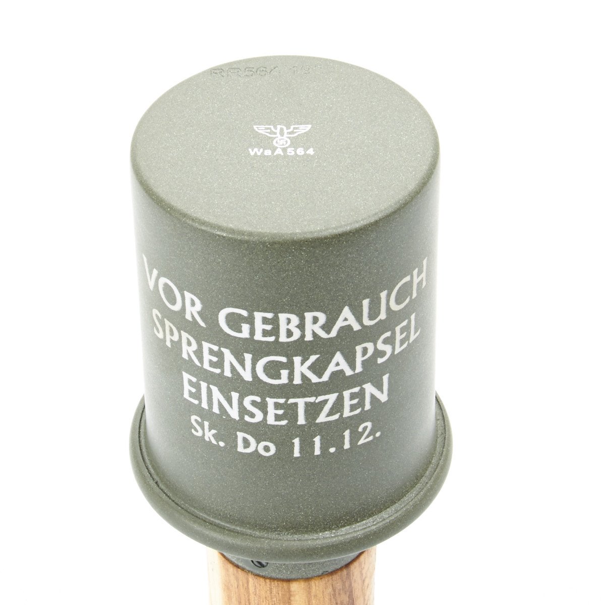 IMA's exclusive stunning replica features a removable threaded metal die-struck head, exactly like the genuine issue, with the correct manufacture's stamp, 1939 date, and proper painted lettering. The wooden handle is hollow as a correctly made metal screw cap base and porcelain bead on pull cord, also included is the copper fuse base under the screw off head. German olive drab paint is marked with arming instructions: VOR GEBRAUCH SPRENGKAPSEL EINSETZEN, which translates to "BEFORE USING, INSERT DETONATOR".