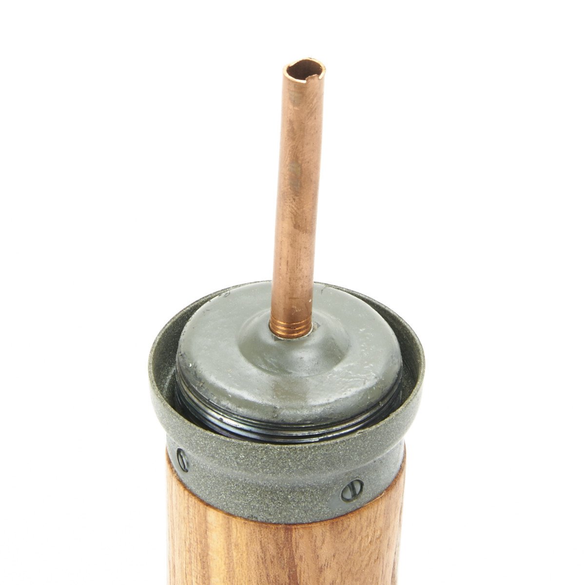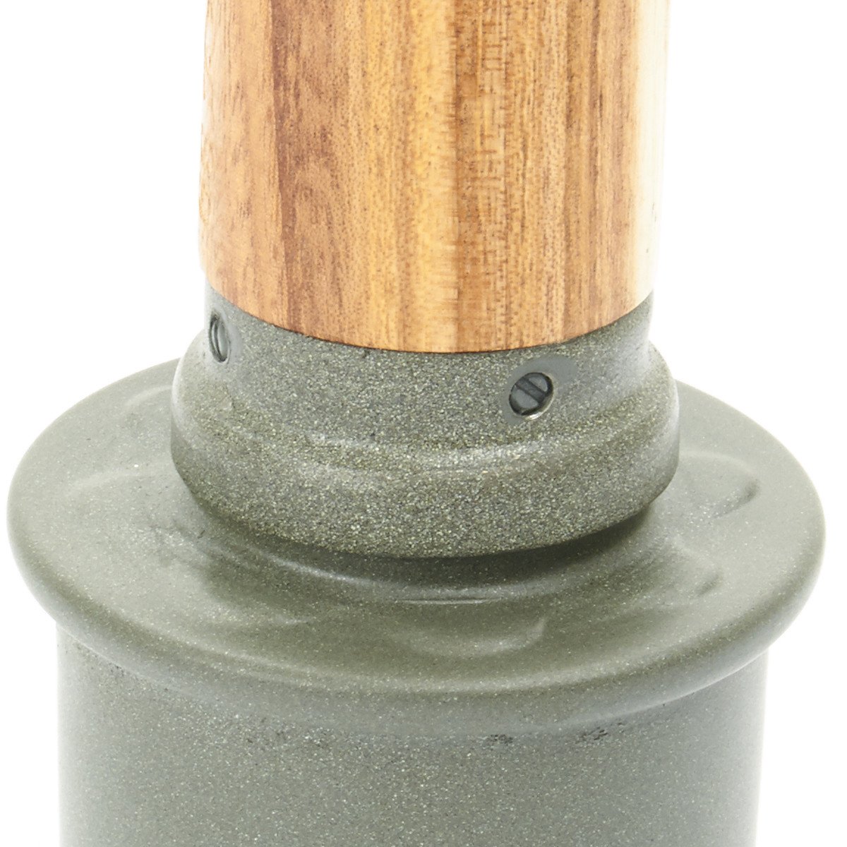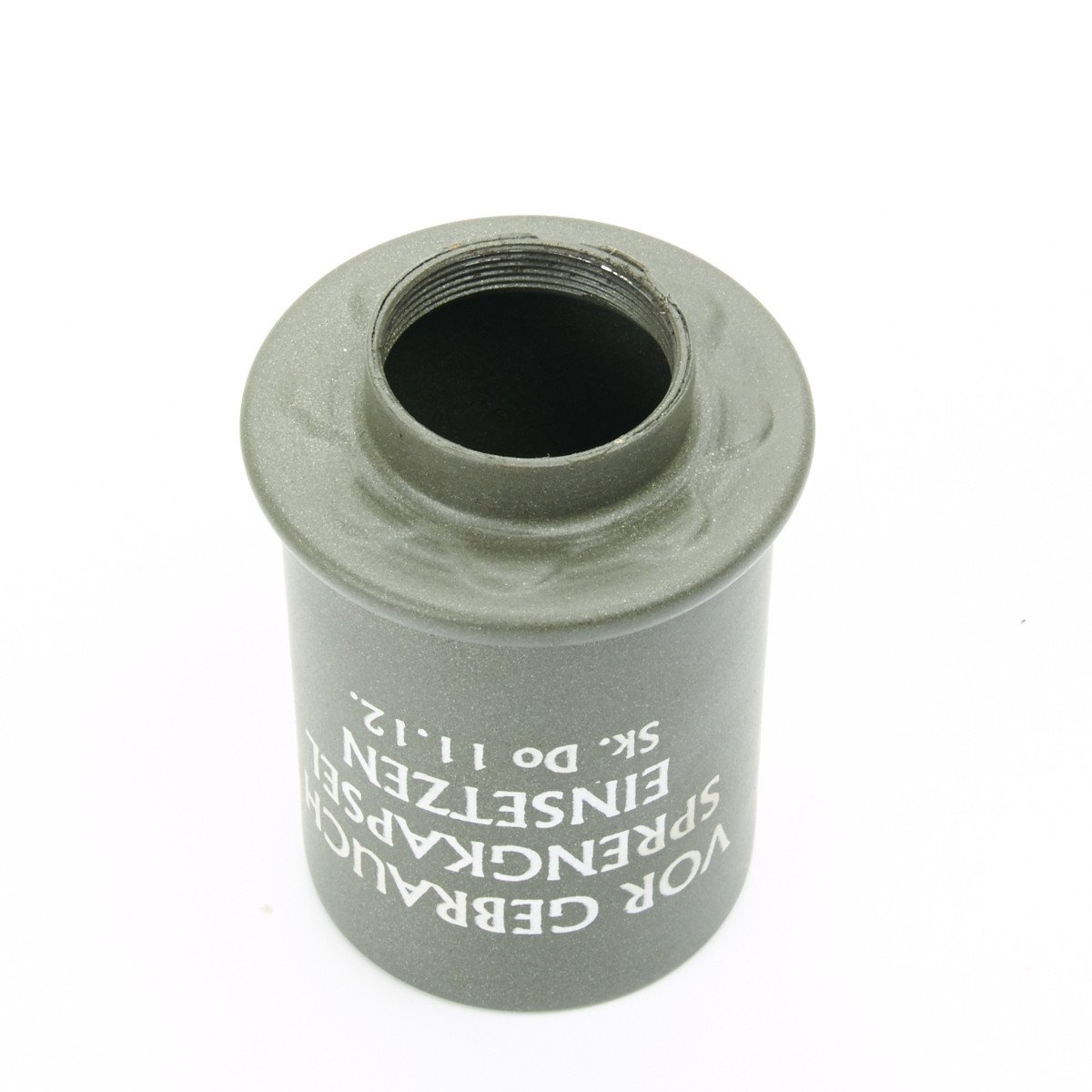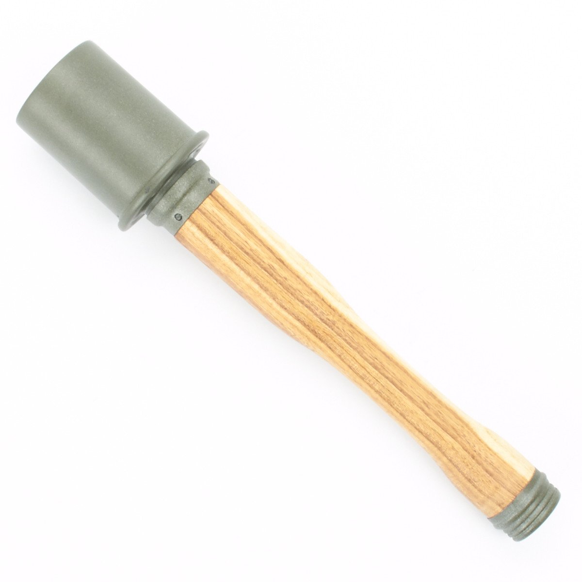 IMA's exclusive stunning replica features a removable threaded metal die-struck head, exactly like the genuine issue, with the correct manufacture's stamp, 1939 date, and proper painted lettering. The wooden handle is hollow as a correctly made metal screw cap base and porcelain bead on pull cord, also included is the copper fuse base under the screw off head. German olive drab paint is marked with arming instructions: VOR GEBRAUCH SPRENGKAPSEL EINSETZEN, which translates to "BEFORE USING, INSERT DETONATOR".