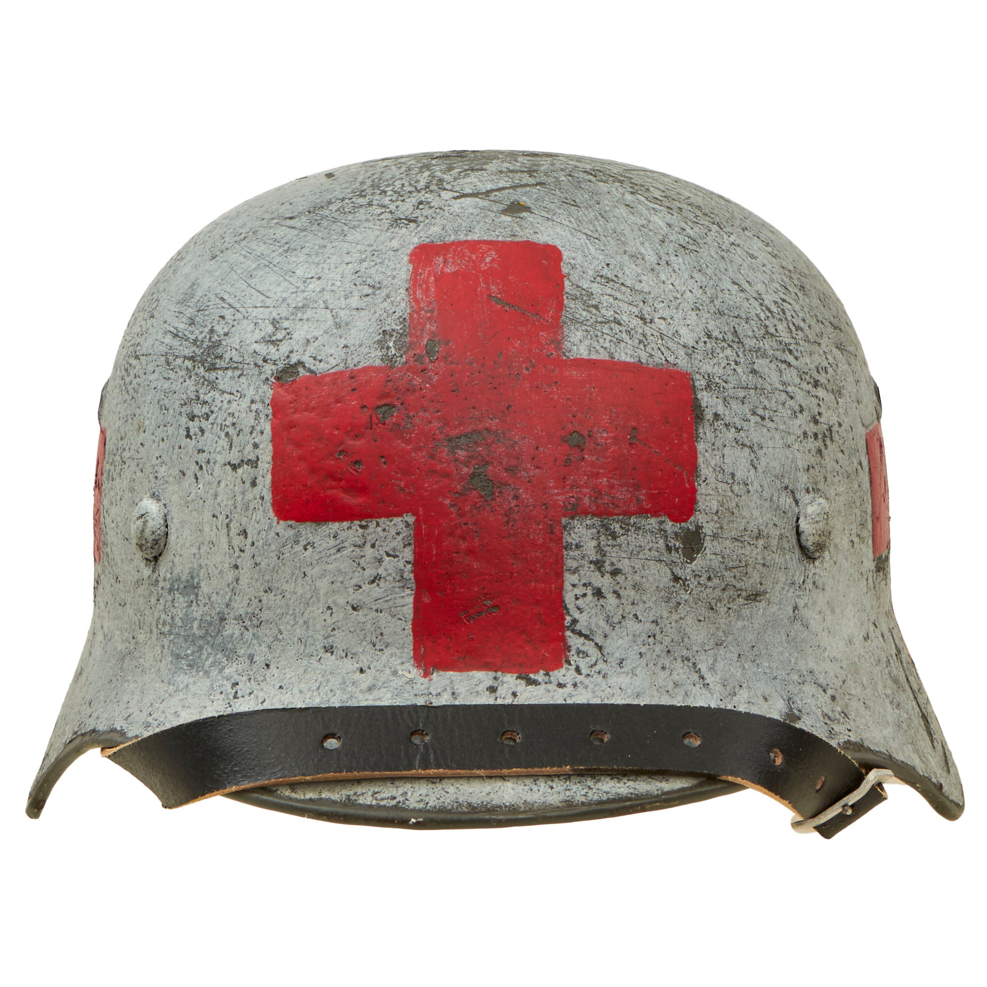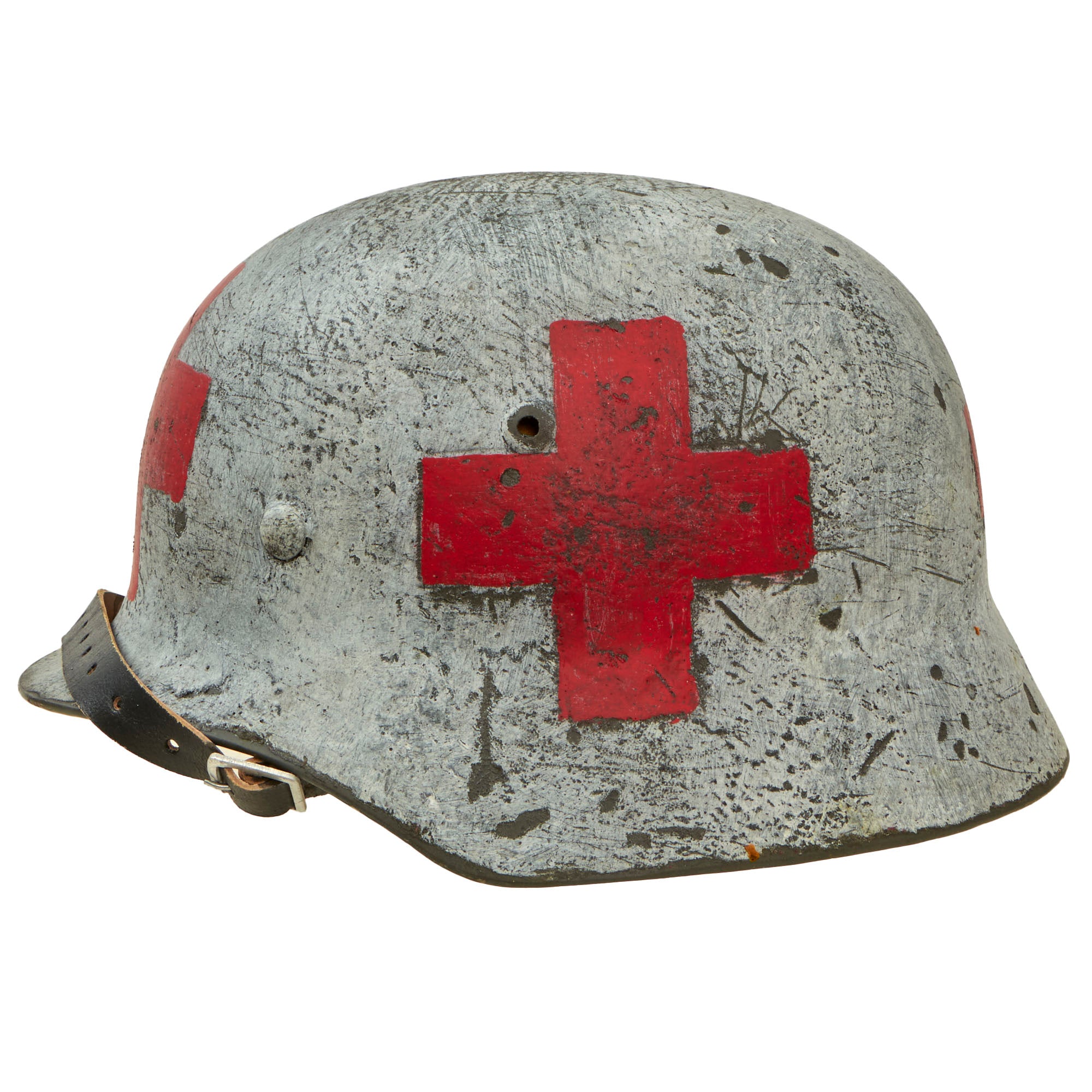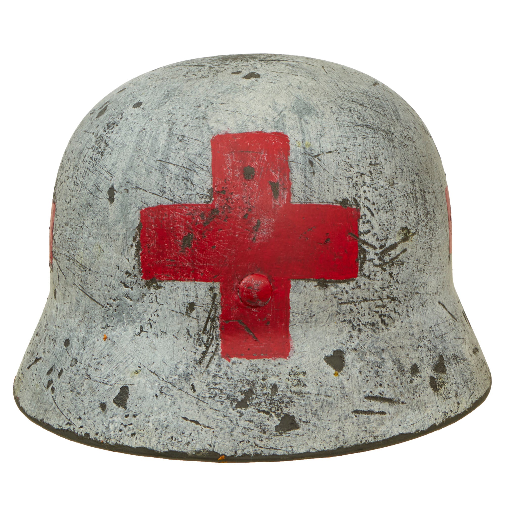 - By 1944 helmets had been over painted with white to blend with the snow. The red crosses are plainly seen repainted over the white for Sanität Medic Troops. This example has had a heavy wire put around the shell, with chicken wire strung across the crown. This allowed additional items such as fabric and foliage to be attached, improving the camouflage profile. As with the originals, any decals present were painted over.