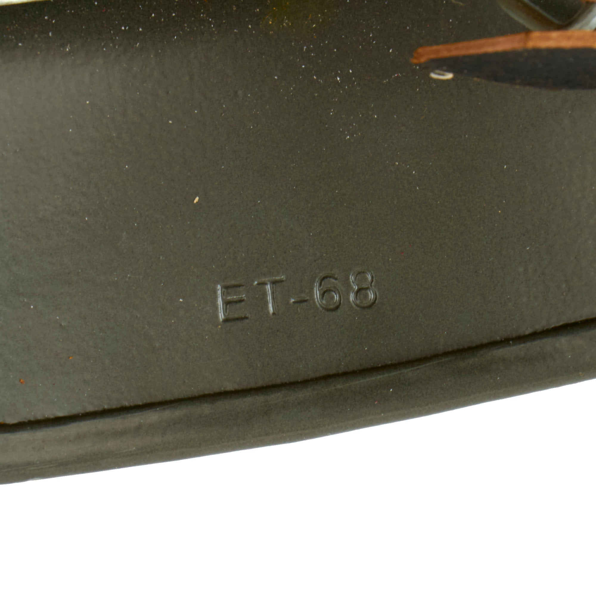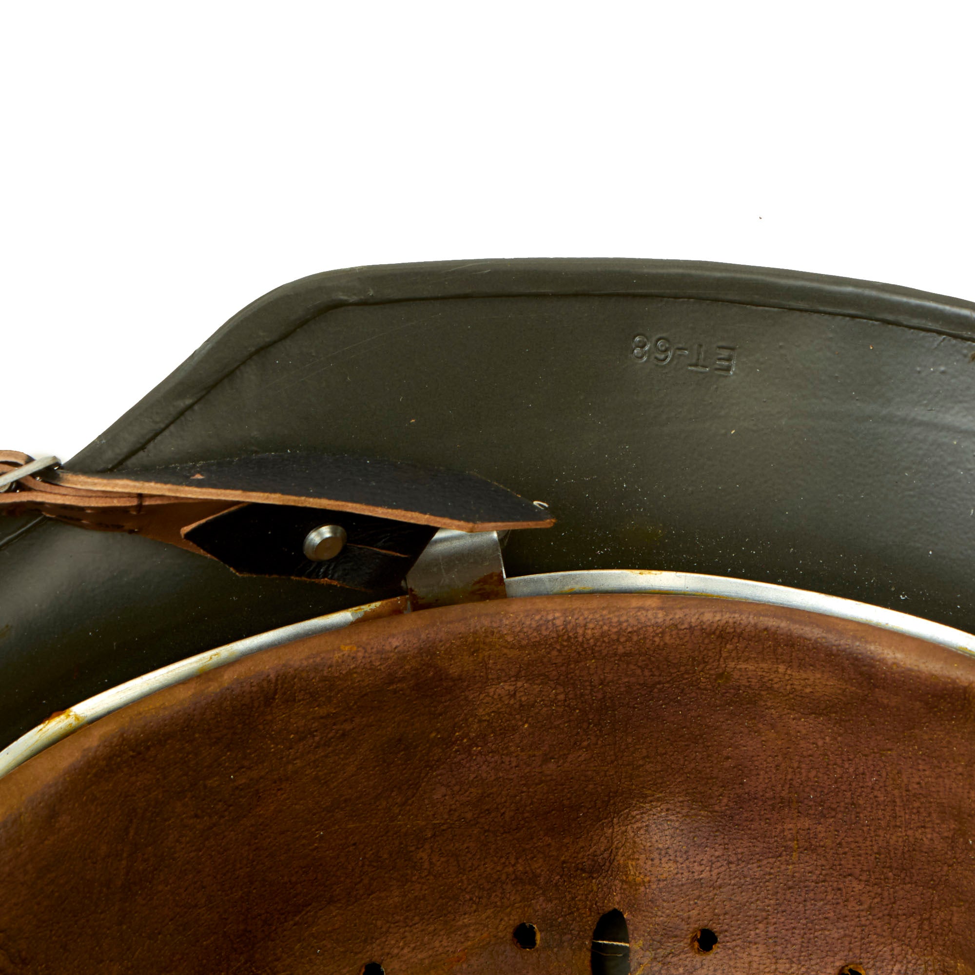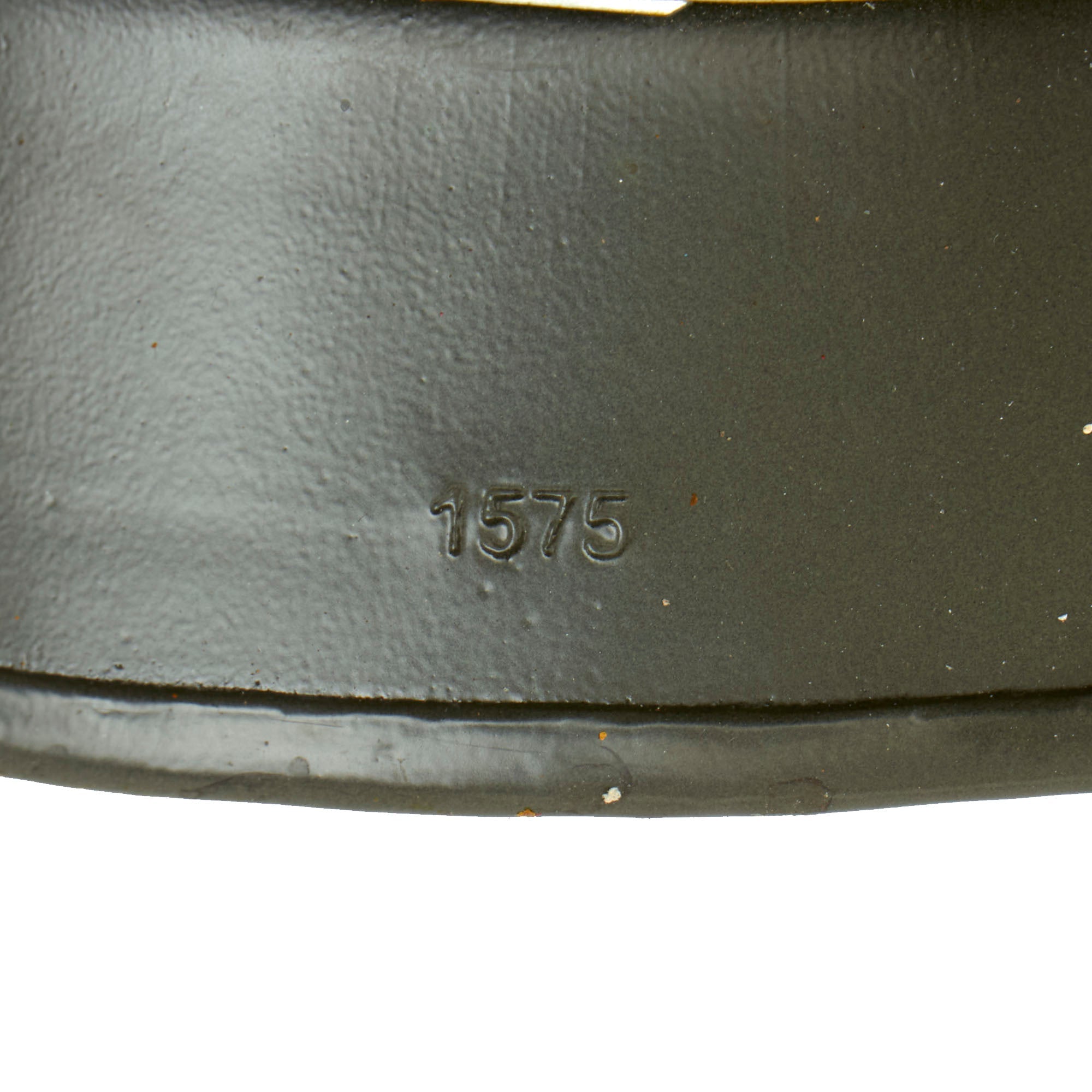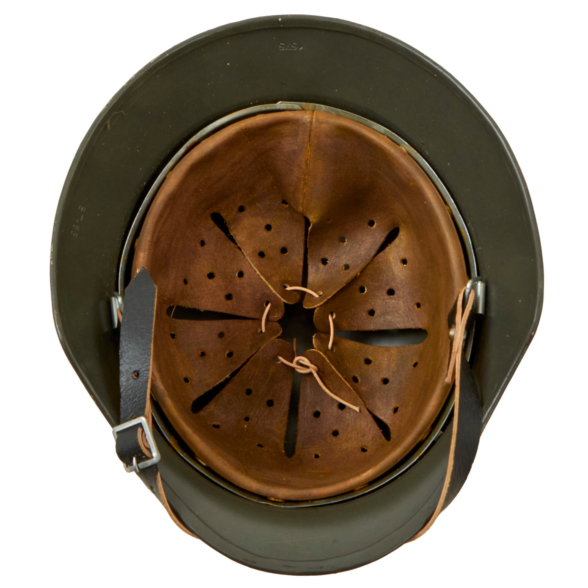 The shell is constructed of 1.8mm thick steel, exactly the same thickness used by the Germans in WWII. This means our helmet is as heavy and as solid as an original. The shell is large (size 68) and has the correct classic M1935 rolled edge as well as proper hollow rivet ventilation holes. For added authenticity we stamped the code 1575 at nape and ET - 68 over ear. There is also an ink dome stamp on the inside of the shell, in blue or yellow ink. The ink stamp will be faint or smeared for authenticity, and probably very hard to read.