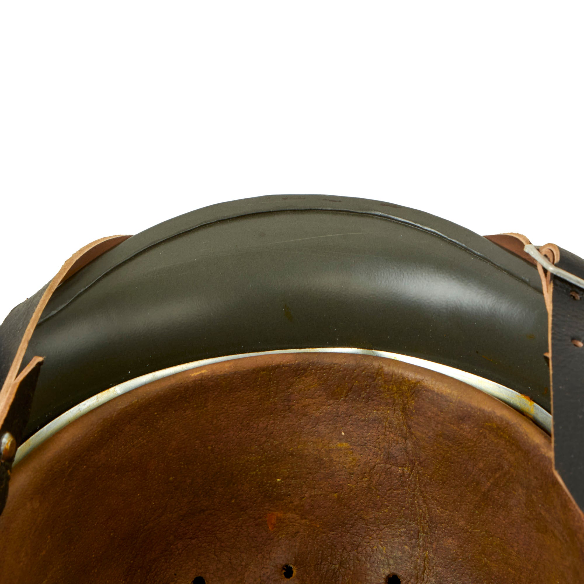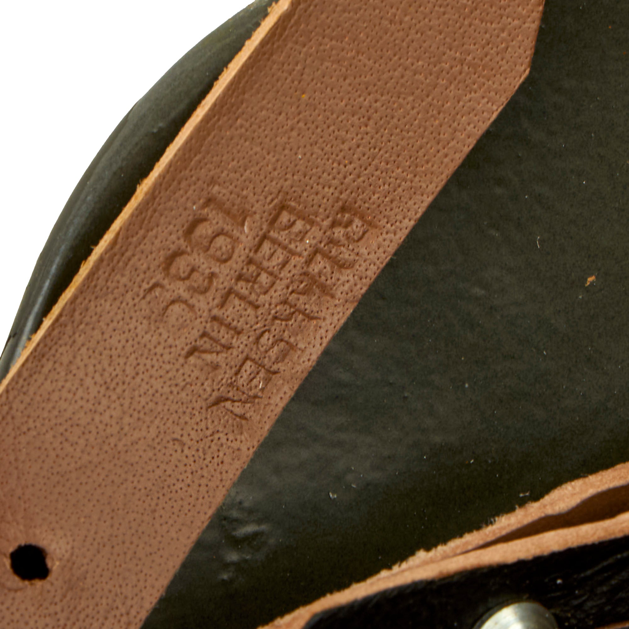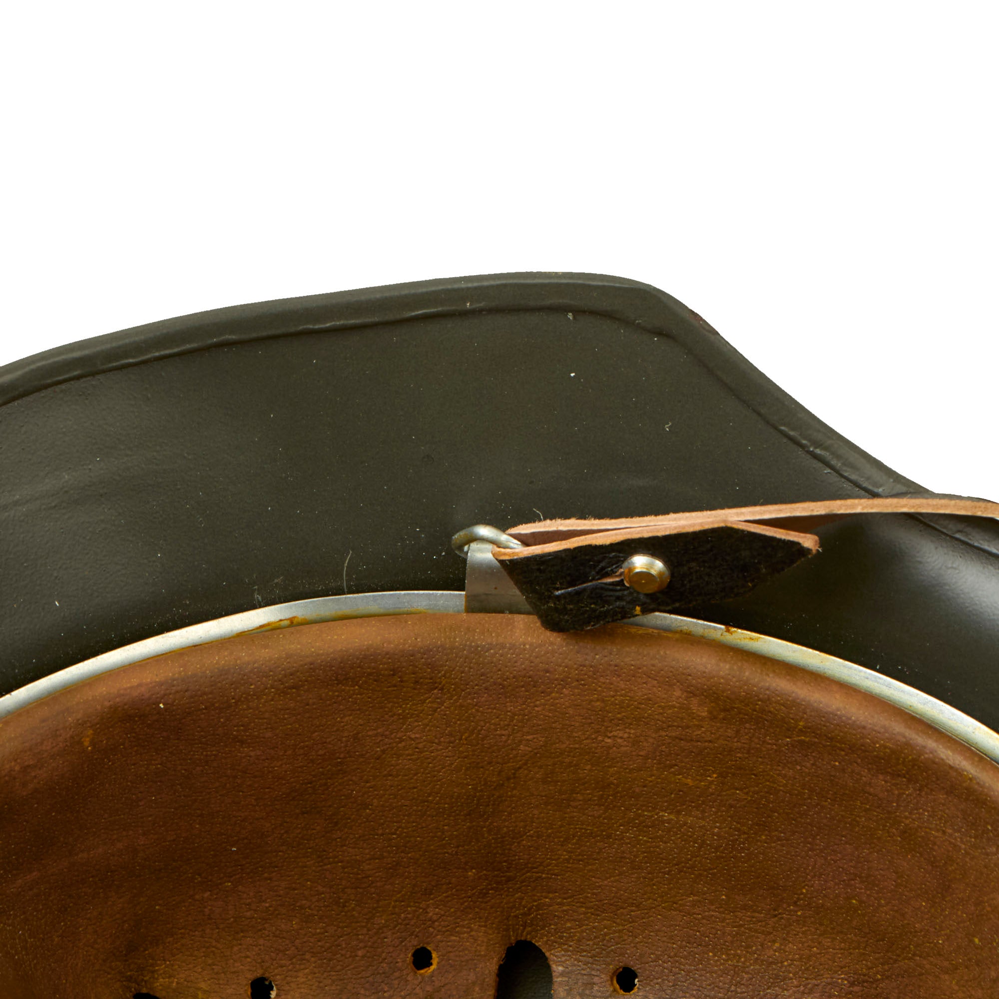 The liner comprised of soft (dark colored) genuine leather that, just like the originals, will turn brown with age, in correct eight finger configuration with central drawstring and an M1931 aluminum liner band that is maker marked, dated, and size stamped! Liner size can accommodate head sizes 7 (56cm) up to 7 5/8 (61cm). The all leather chinstrap has a black exterior with tan interior, comes with metal studs, correct aluminum buckle, and connects to the helmet with proper loops.