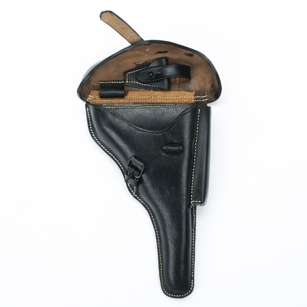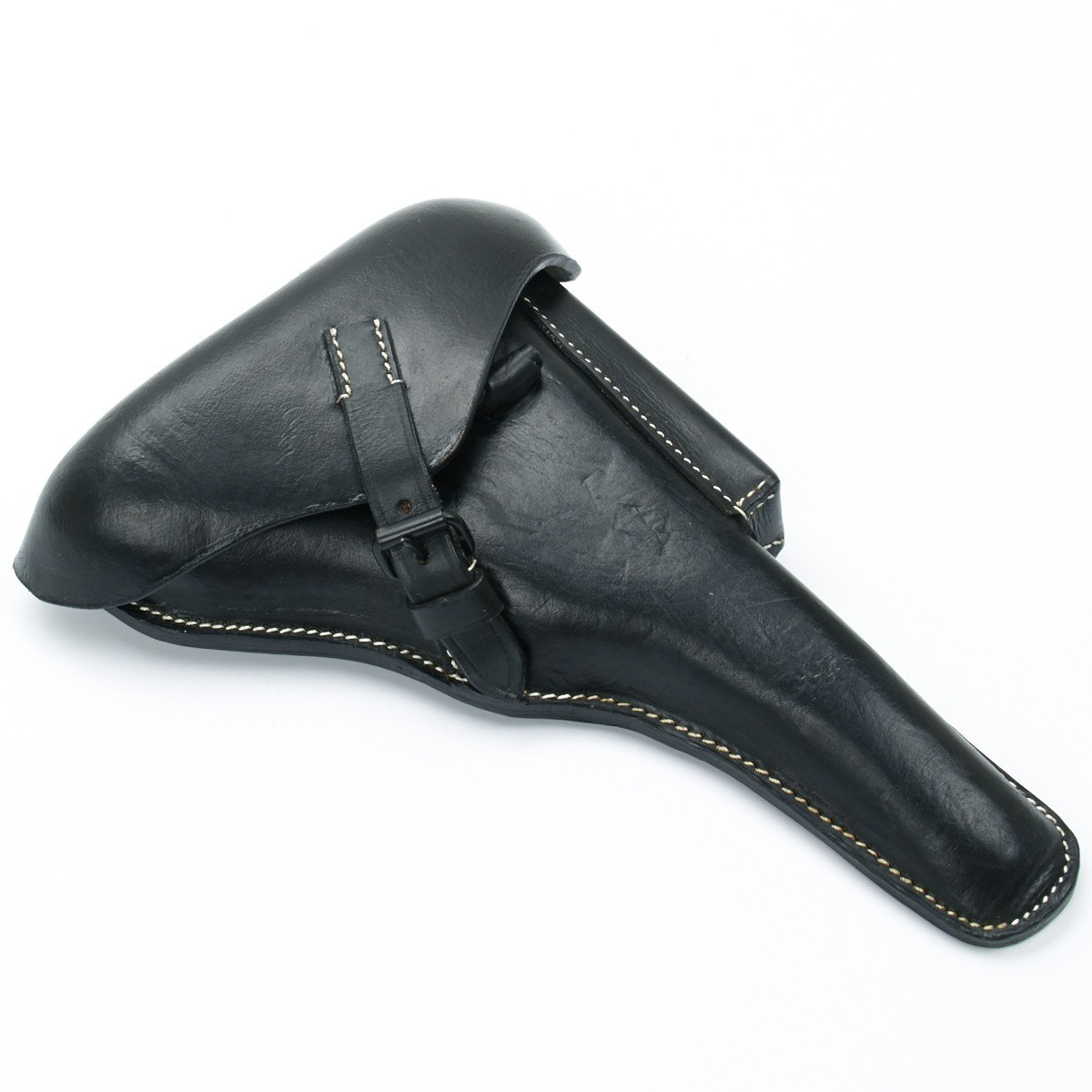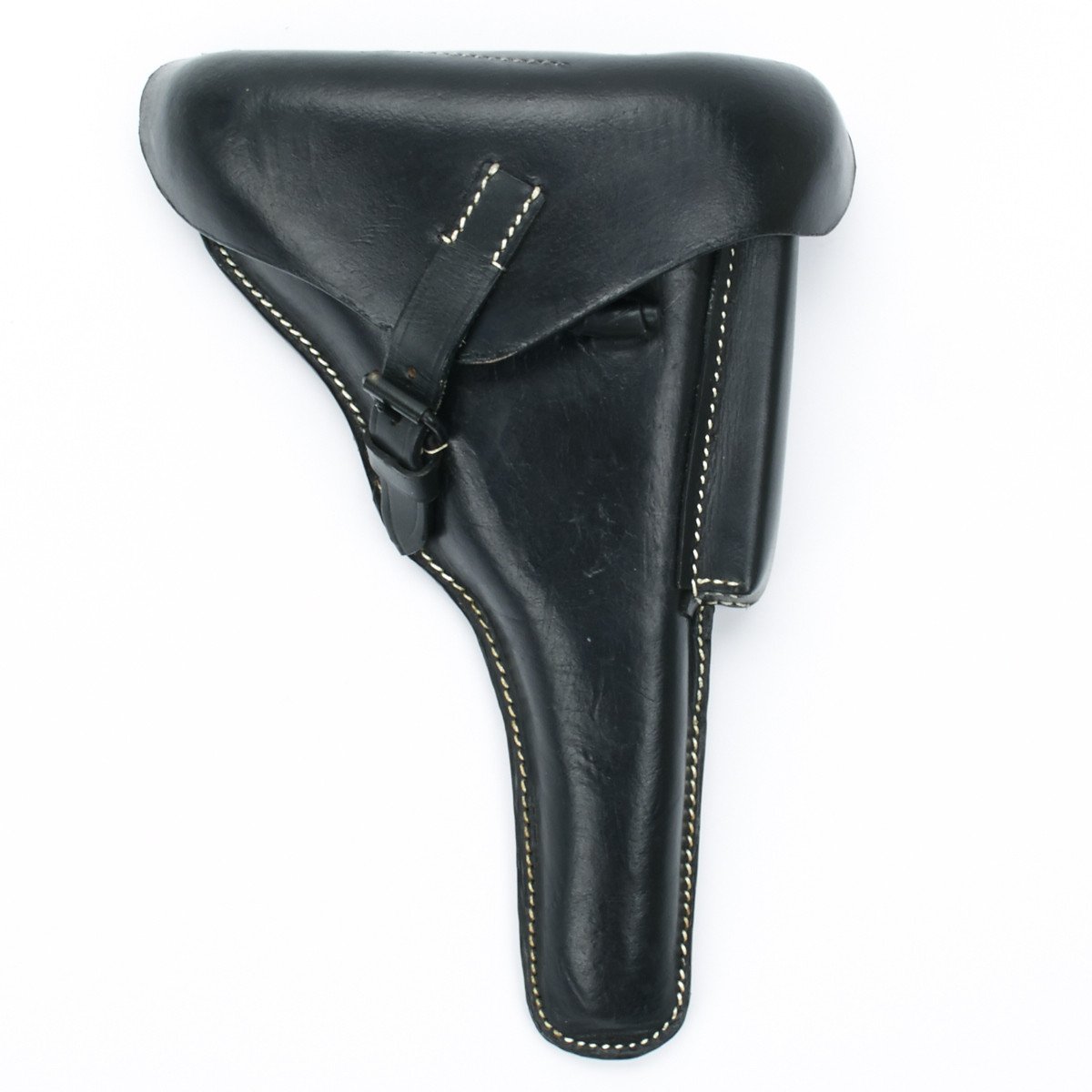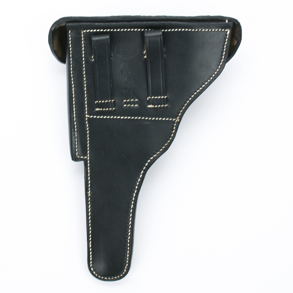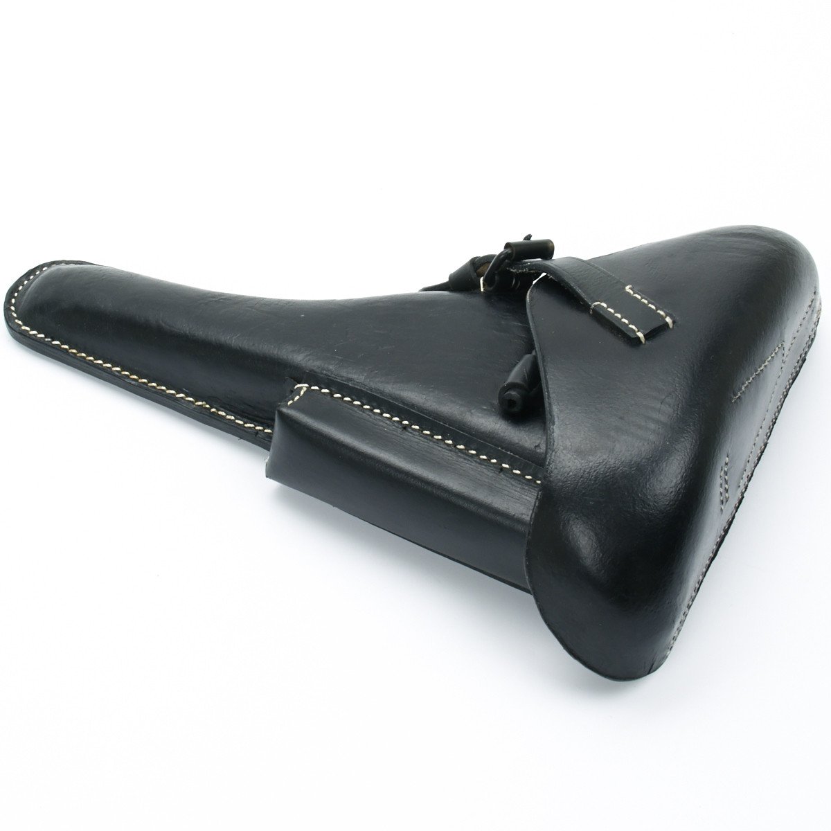 New Made Item: High quality reproduction holster for the German Navy P-04 Luger with six-inch barrel. Holster is constructed of black top-grain leather with heavy white stitching, steel fixtures and spare magazine pocket. It has internal pockets and straps for take down tool and cleaning rod. Features a buckle down hard shell flip top like WWII style Luger holsters, and belt loops on the back. We've even added Weimar republic stampings for prewar authenticity.