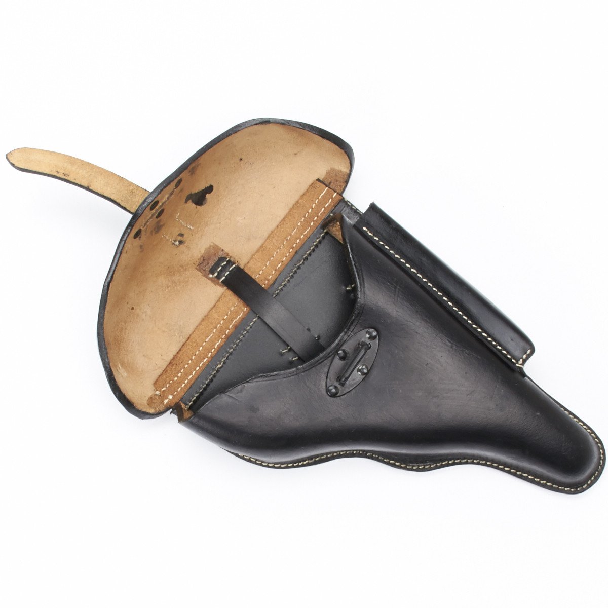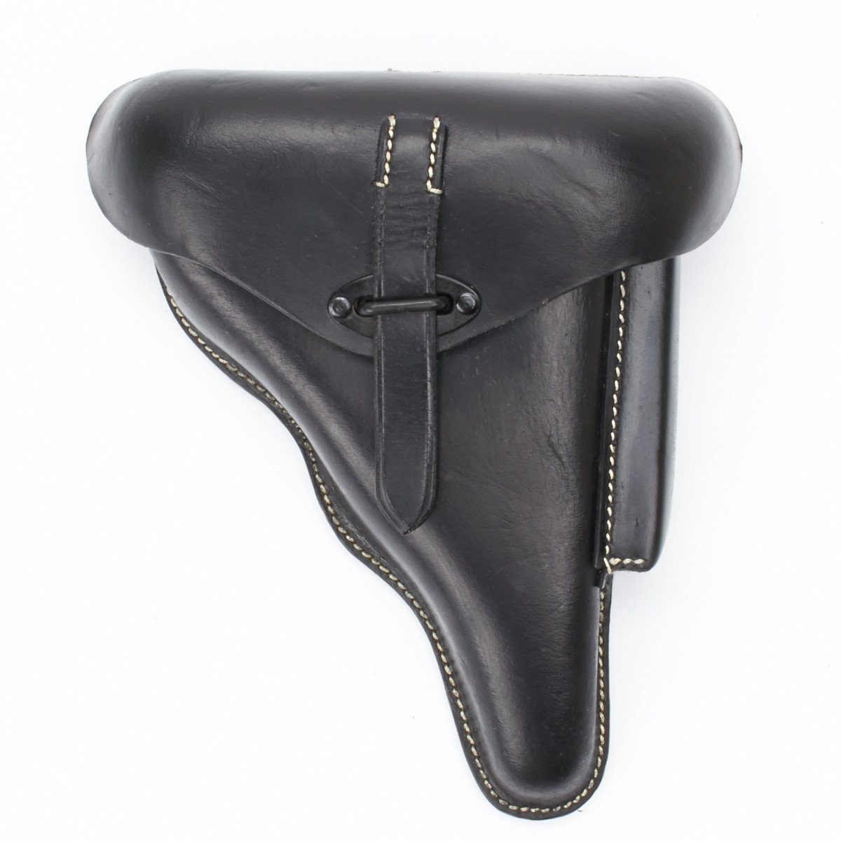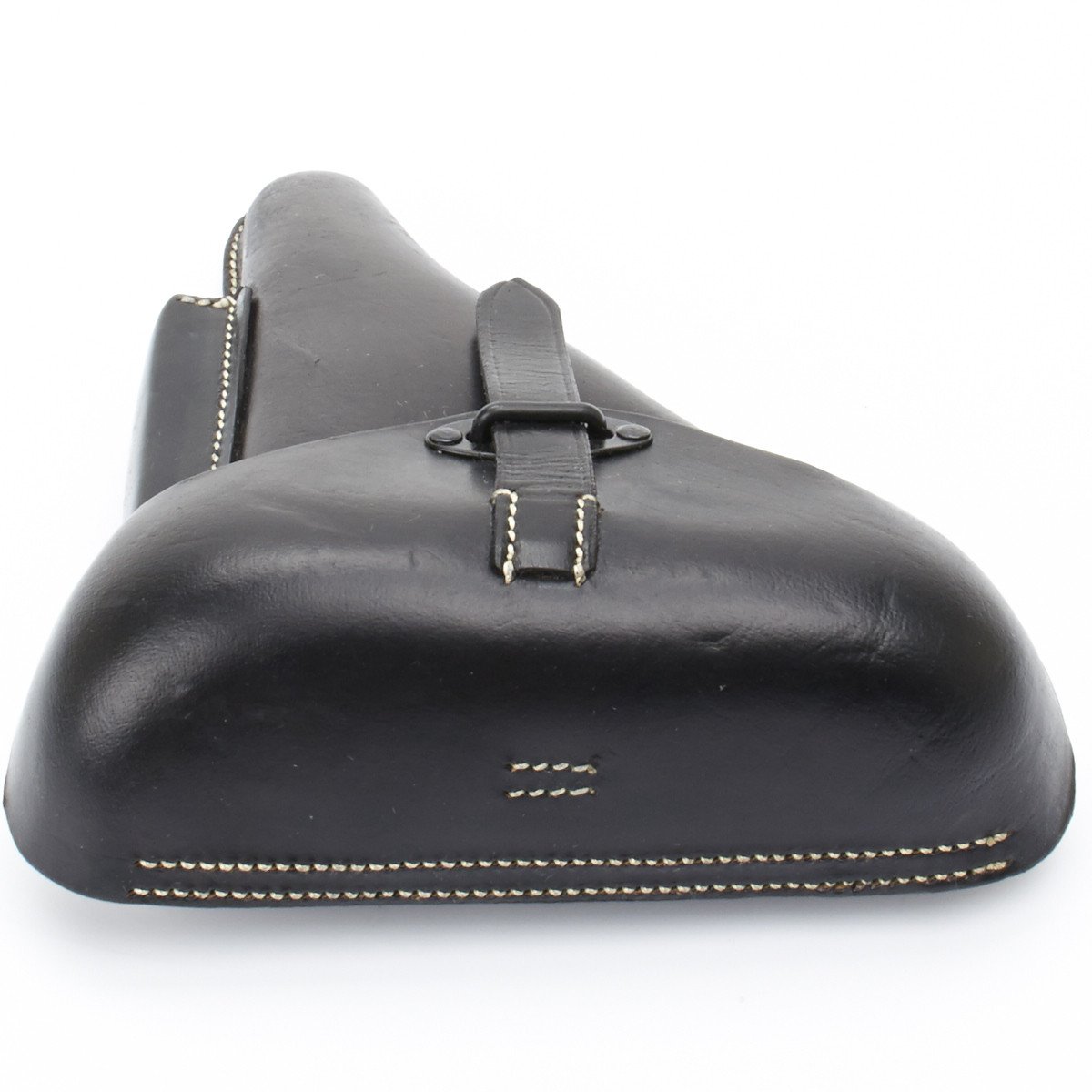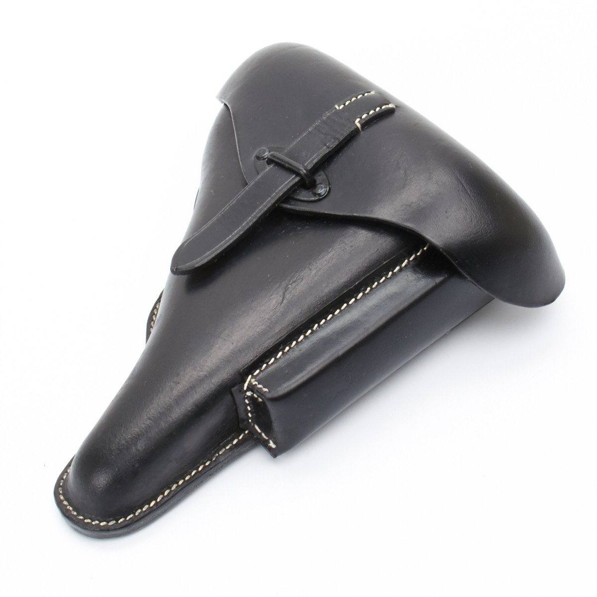 Our replica holster is correct in all respects including the use of black leather with white stitching as originally issued. It comes with correct spare magazine pocket on side with correct buckle closure.