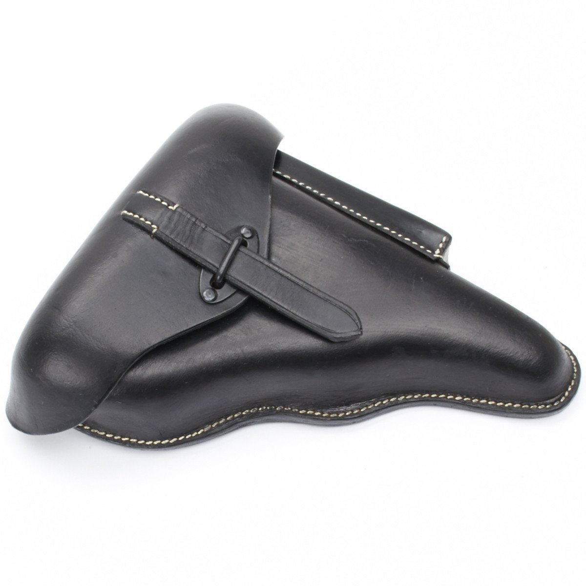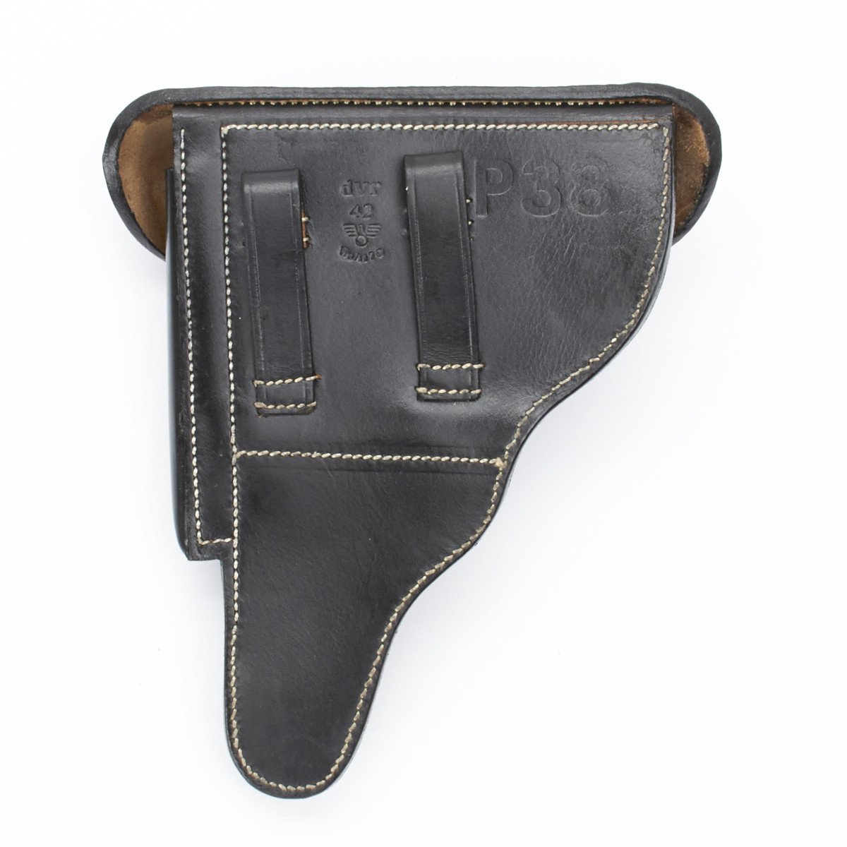 New Made Item: A gorgeous replica of WWII era German Walther P-38 pistol holster constructed of high quality black leather. Originally made between 1940-1943 these replicas are constructed exactly as the originals; of heavy black leather with white stitching, bearing replica date and maker markings. Original examples of this holster are very hard to find today. Perfect for reenactors, or just a good home for your P-38 pistol.