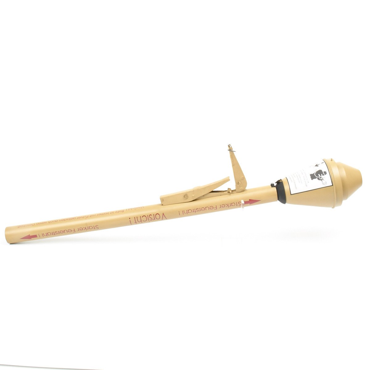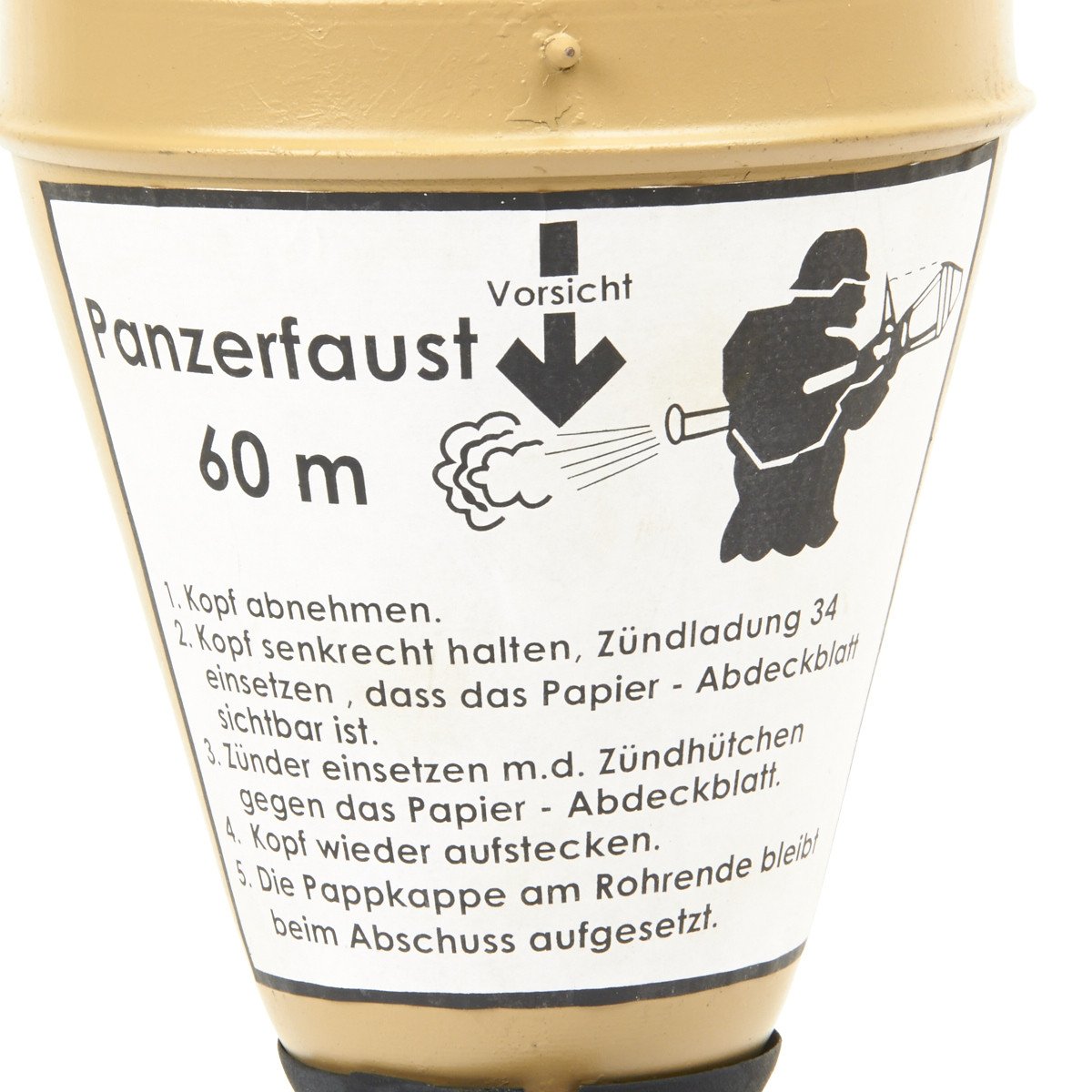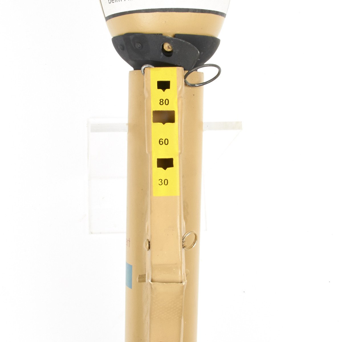 For added authenticity, both Rocket and Launcher are now offered in the correct German WW2 Ordinance Tan or "Gelbbraun" color with red stencil on launcher which reads "Vorsicht! Starker Feuerstrahl!". We have purposely painted this set to resemble a genuine Panzerfaust, meaning the paint is not and should not provide 100% smooth coverage, these are intended to look like the real thing based on our original sample. The originals were hastily assembled, and paint chips and flakes are common. Our reproductions have many painted parts in contact with others, which often results in paint loss, especially around the bottom of the warhead where it contacts the fin assembly.