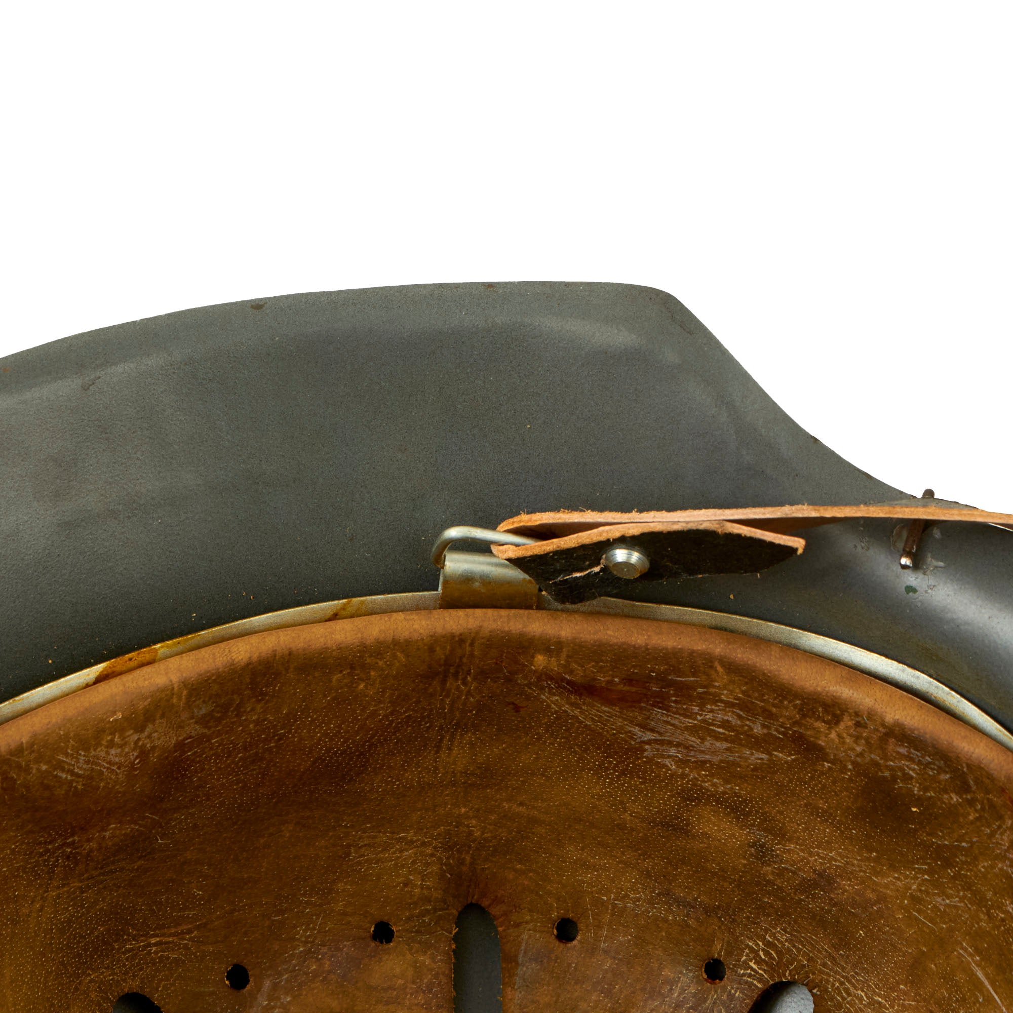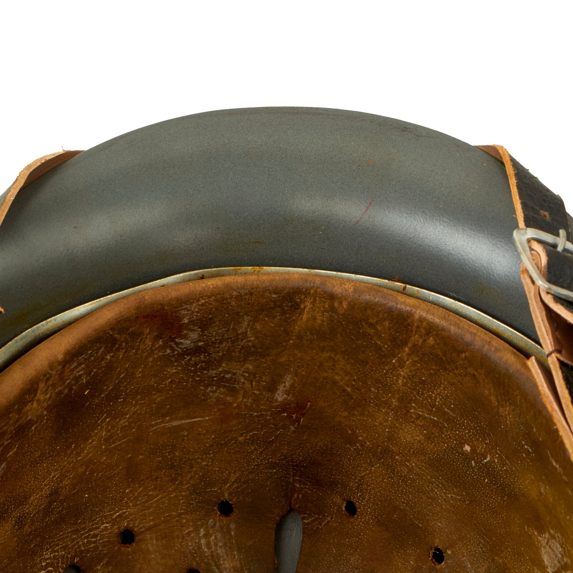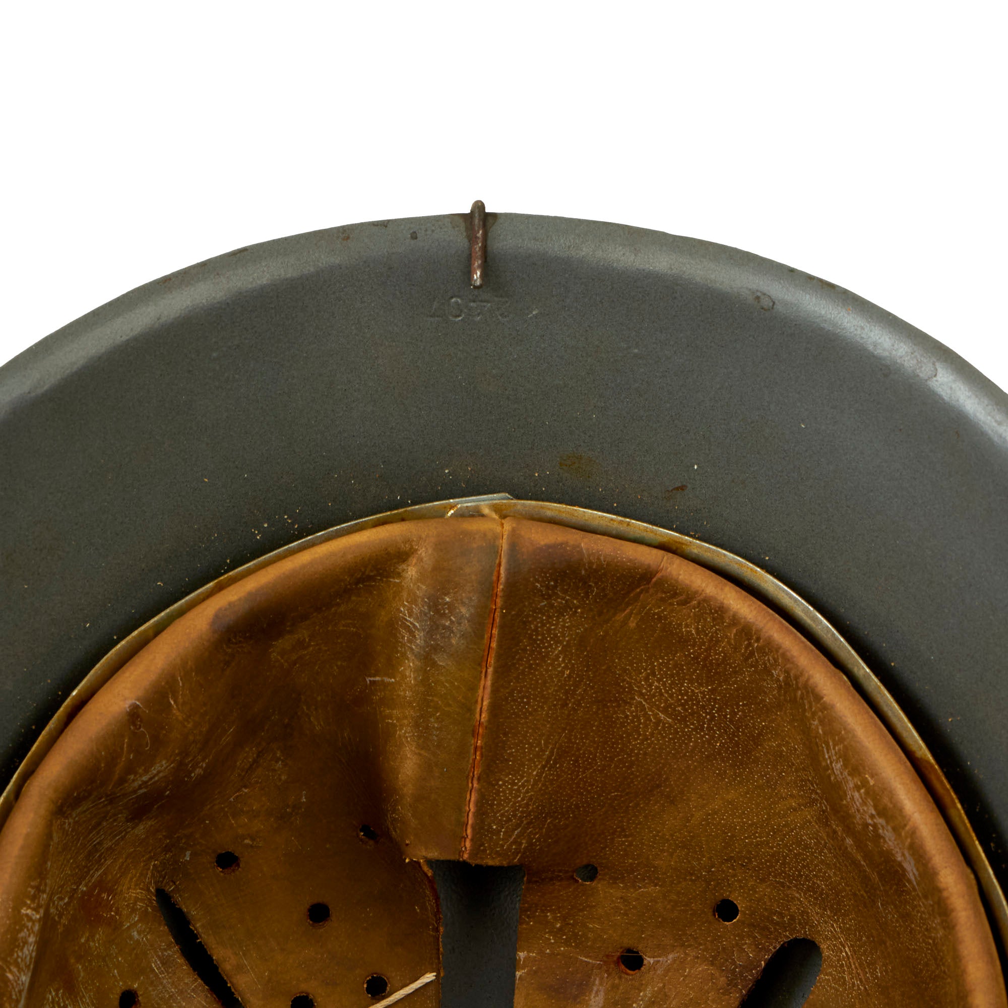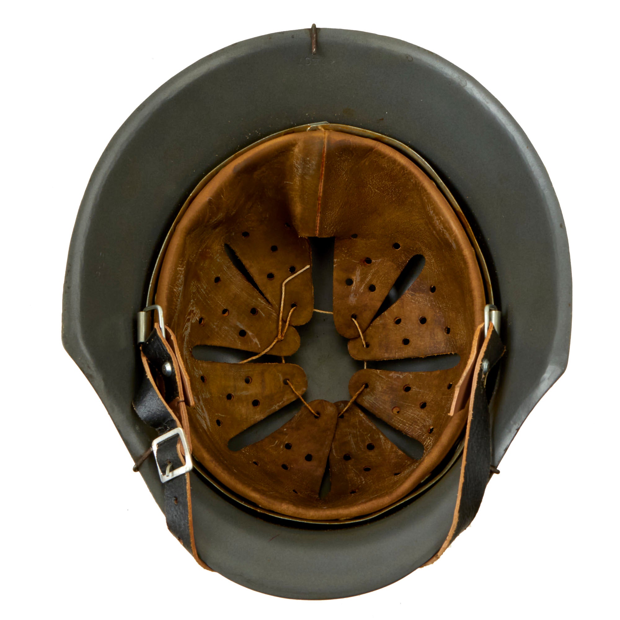 The liner comprised of soft (dark colored) genuine leather that, just like the originals, will turn brown with age, in correct eight finger configuration with central drawstring and an M1931 aluminum liner band that is maker marked, dated, and size stamped! Liner size can accommodate head sizes 7 (56cm) up to 7 5/8 (61cm).