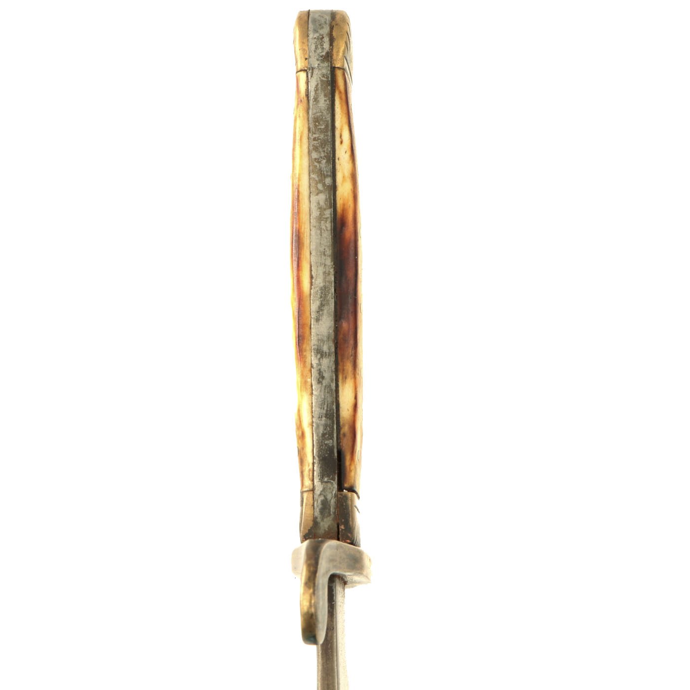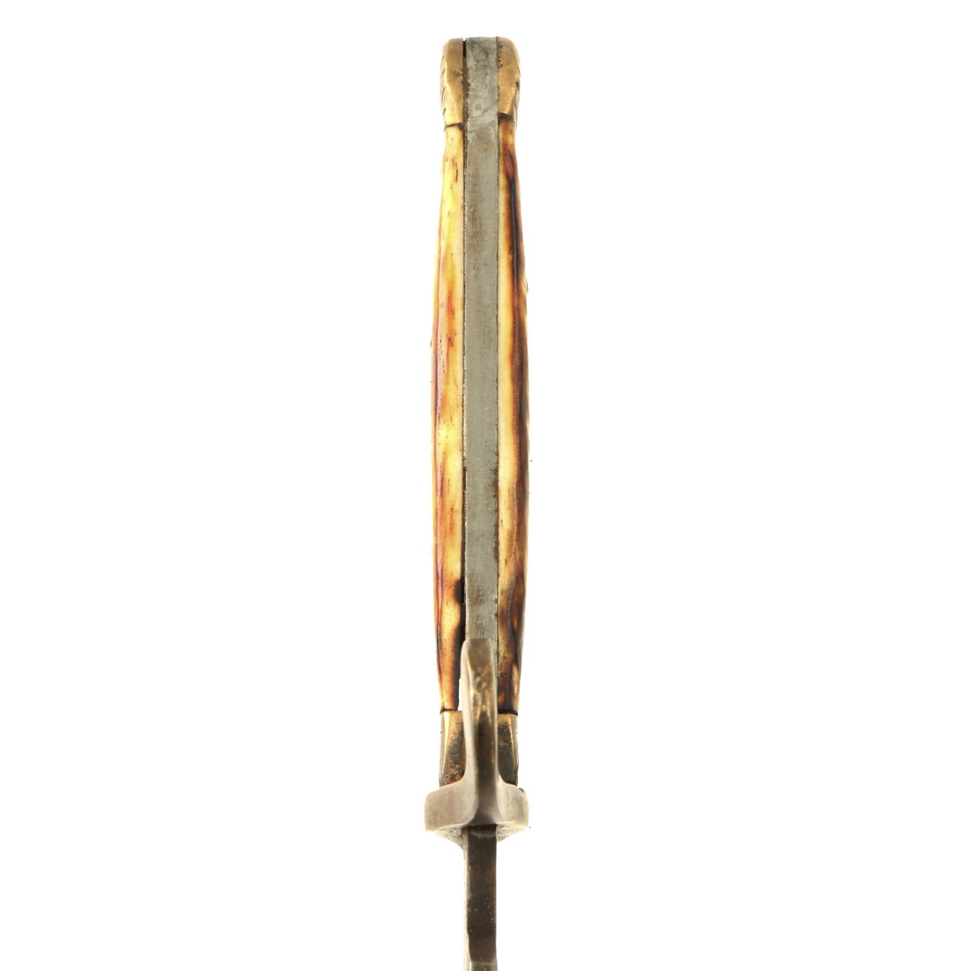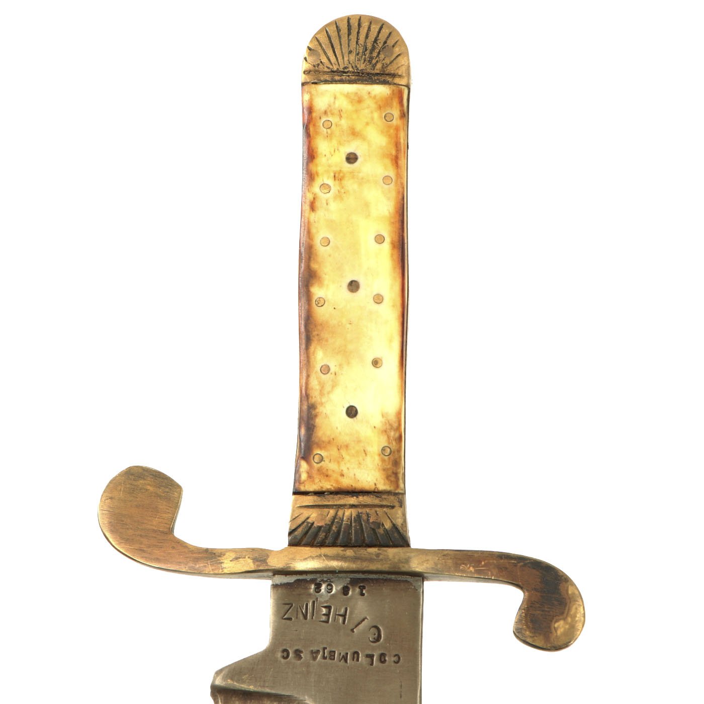 We assume that C I Heinz is supposed to be the name of the owner, but it very well could also be the maker. It has a large blade with a full tang, brass crossguard, and brass fit bone grip scales.